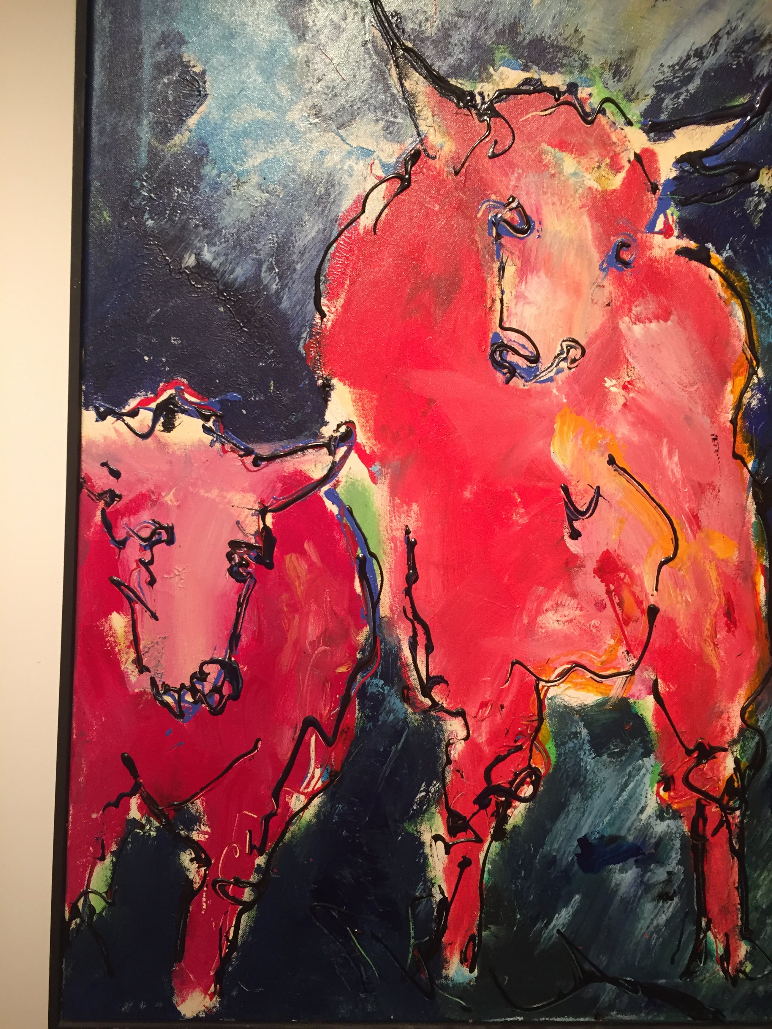 Kleurrijk schilderij van de bekende kunstenaar Arno Overdevest. Arno Overdevest is 12-10-1956 geboren in Berkel en Rodenrijs.Sinds 1978 is hij werkzaam als beeldende kunstenaar. Hij heeft een MO-A akte handvaardigheid en een MO-B akte beeldende vorming behaald (afstudeerrichtingen o.a. metaal, boetseren, hout en keramiek), echter op het gebied van schilderkunst is hij autodidact.Hij werkt hoofdzakelijk met thema’s die terugvoeren naar zijn jeugd, rond de boerderij en in de polder, waar zijn vader een houthandel, annex sloperij had.Elk jaar begint hij aan een nieuw thema, maar pakt ook regelmatig de draad van voorgaande thema’s op. Enkele voorbeelden van de door Arno gebruikte thema’s zijn stieren, hobbelpaarden, kippen en varkens. De eerste werken van een nieuw thema zijn vrij naturalistisch, geleidelijk aan werkt hij naar abstracties toe.Vaak werkt Arno direct uit de tube, waardoor hij snelheid en beweging in zijn schilderijen creëert.Arno heeft al diverse exposities in binnen- en buitenland op zijn naam staan.