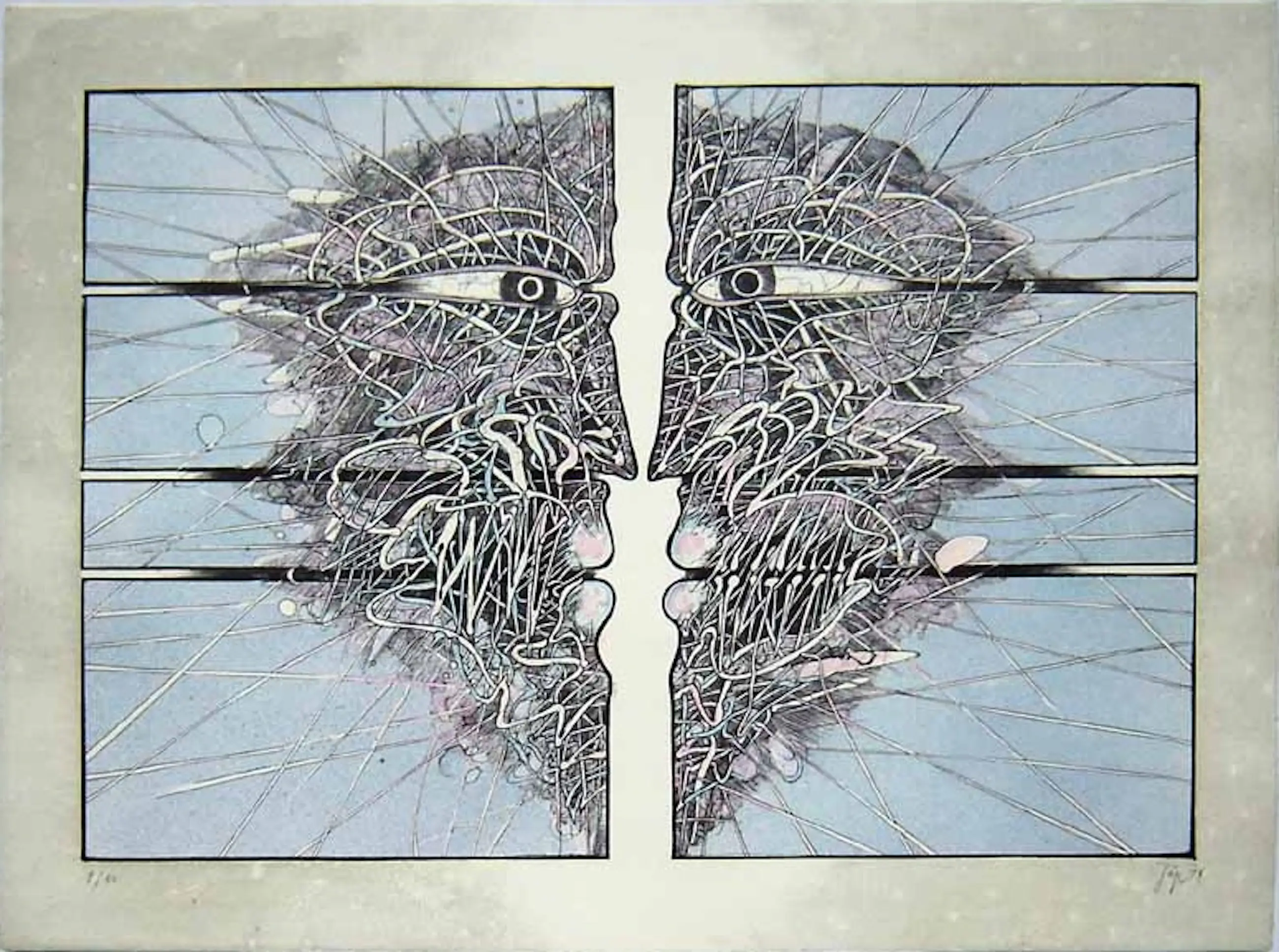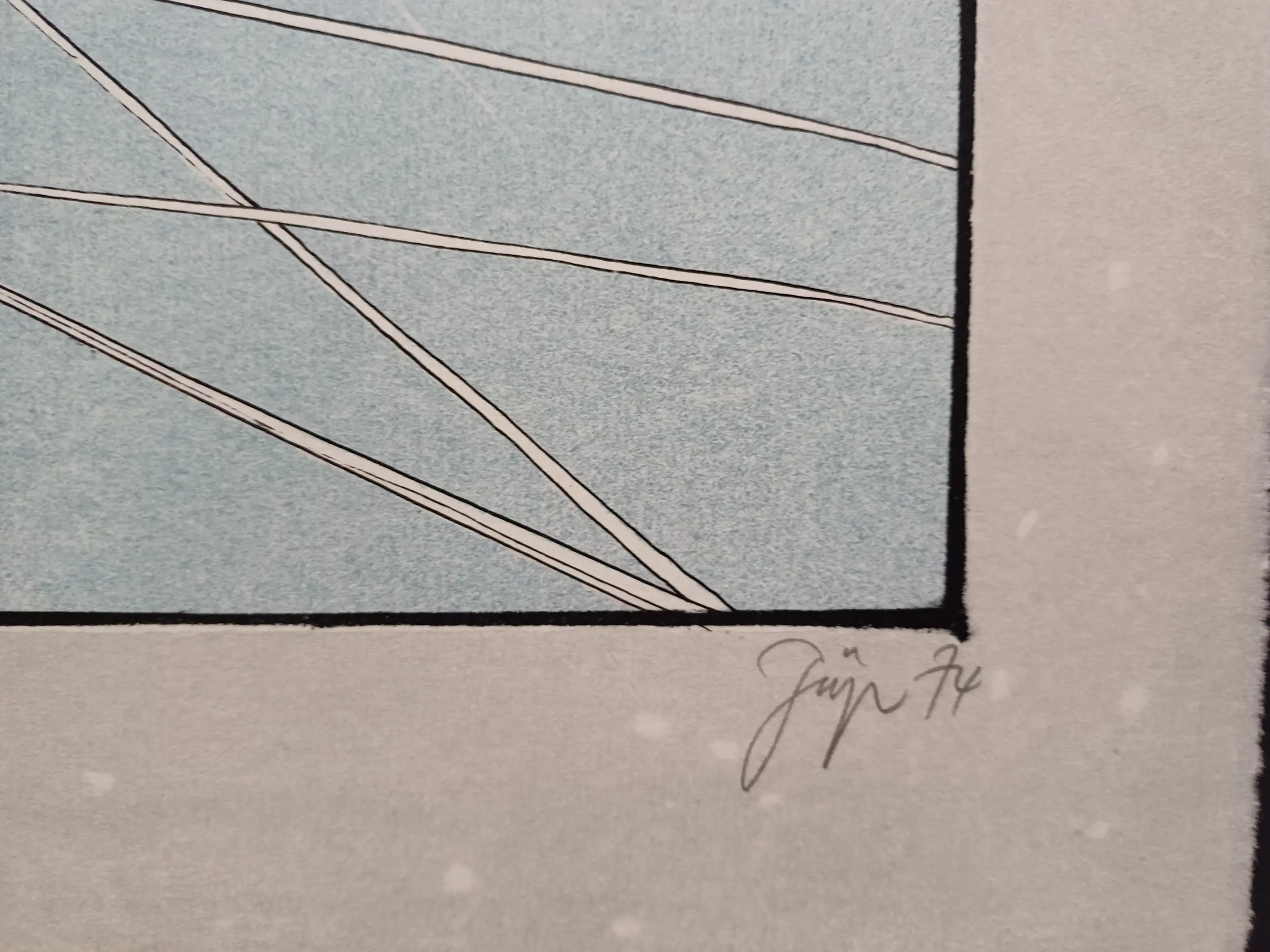 "Inner Monologue," a mysterious lithograph by Bernard Jaeger, published in 1974 by the renowned Berlin gallery Art Brusberg. The work was signed, numbered (60/80) and titled in pencil by the artist. The sheet is 48 cm high and 65 cm wide, in perfect condition, never framed, and always stored horizontally in a drawer.