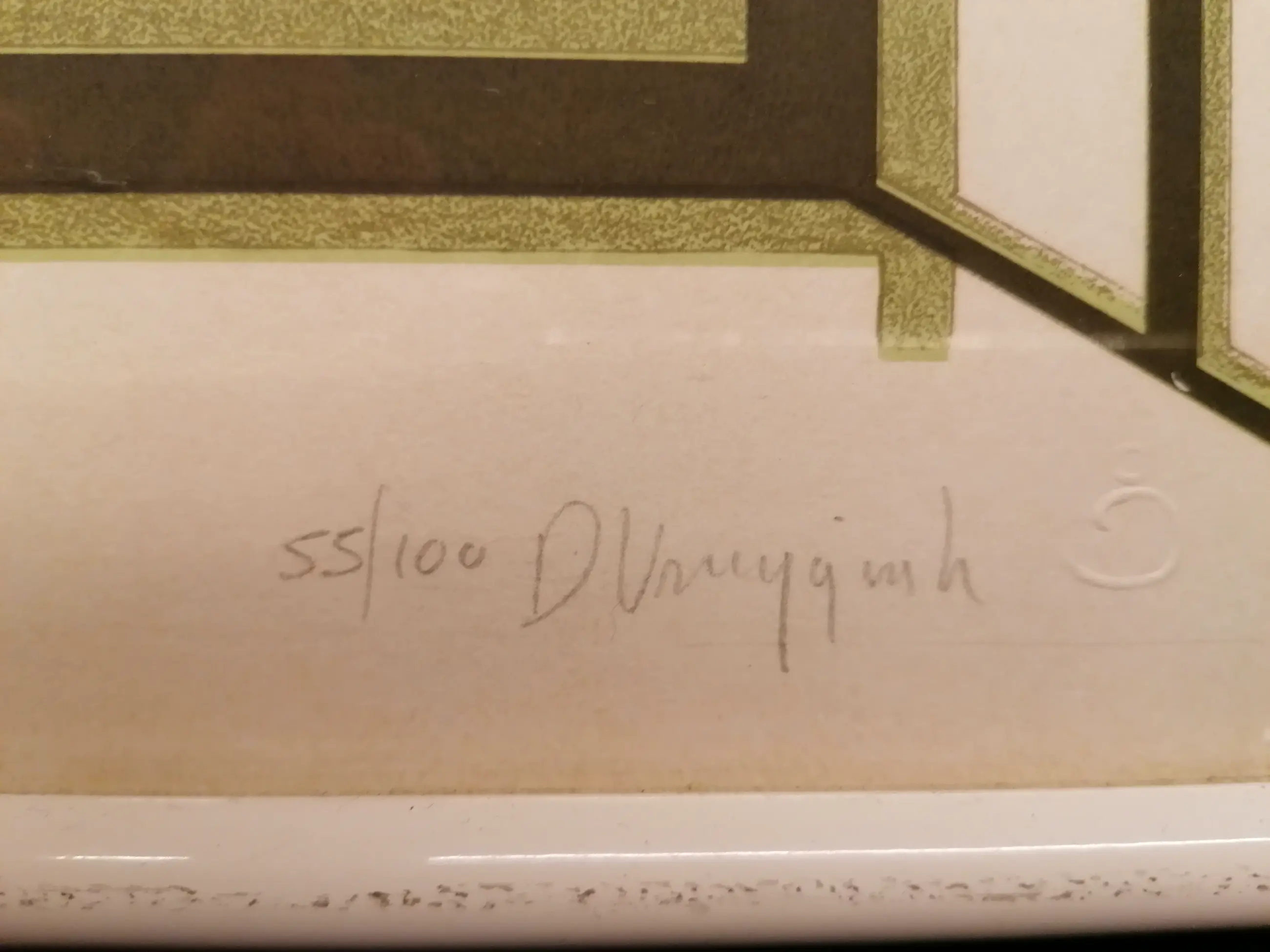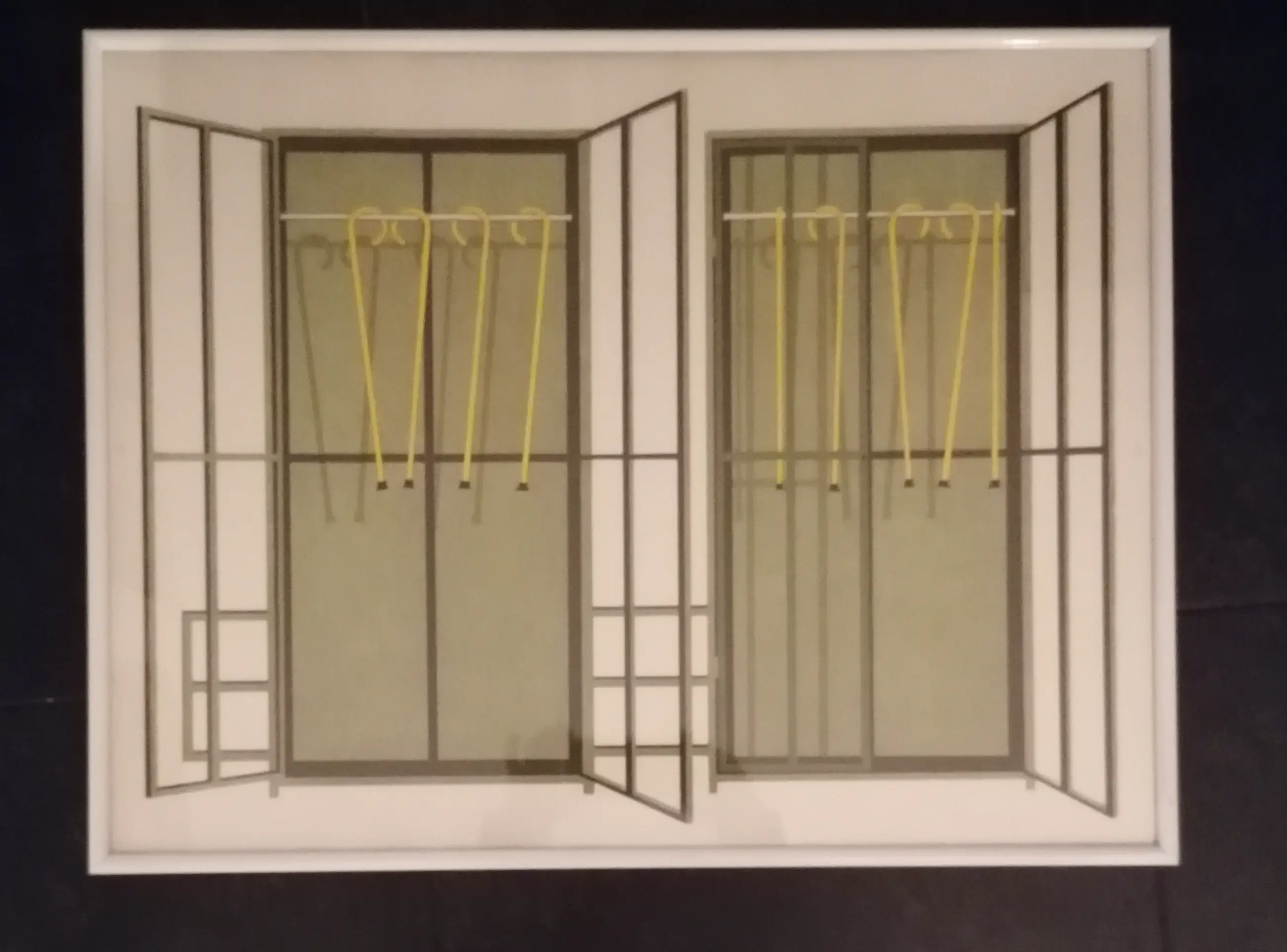 Lithograph depicting two open windows and walking sticks Frame is plastic Once bought for 300 guilders at the art library Signed