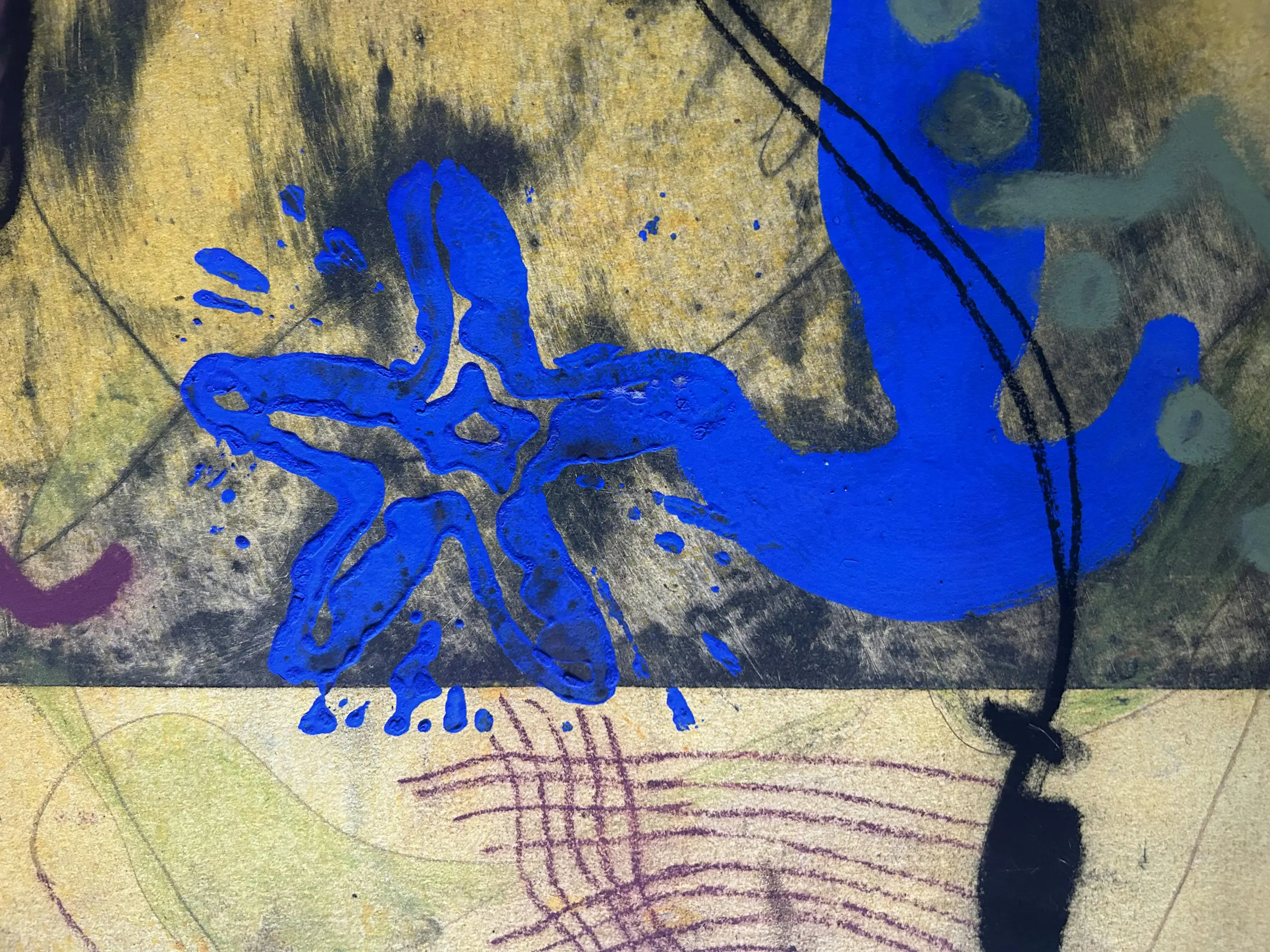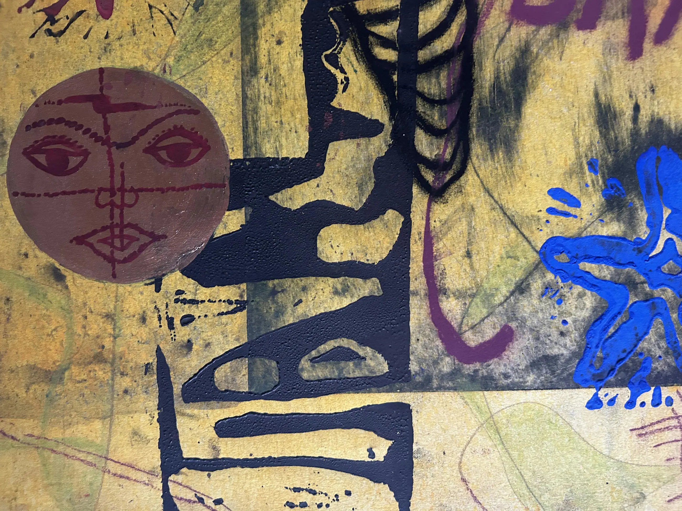 A dynamic composition in which animal figures, organic shapes and graphic lines converge . The red leaf-like motifs form visual anchors in a landscape of color and movement. The work invites contemplation on identity, nature and the abstract patterns that underpin our existence.