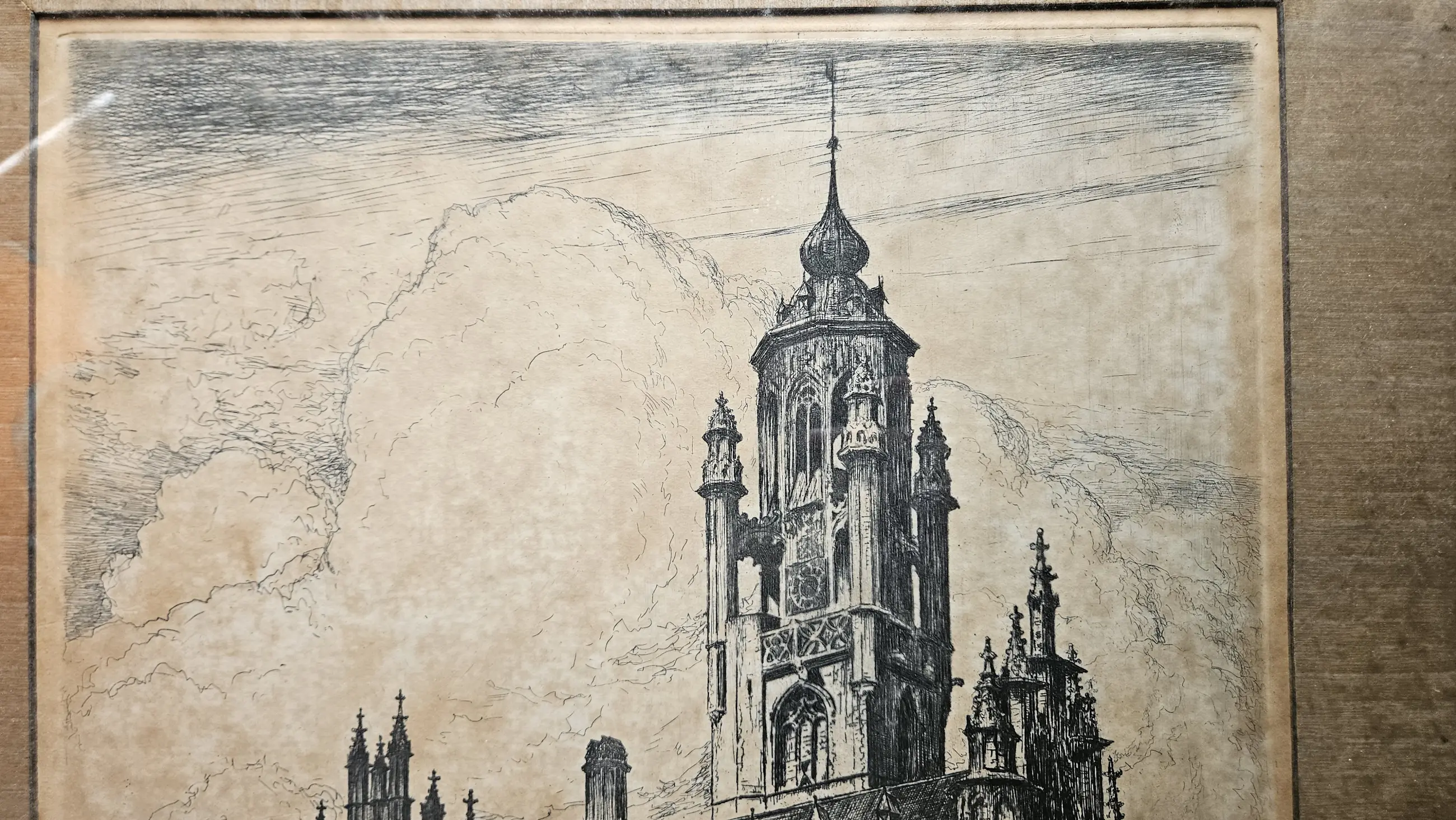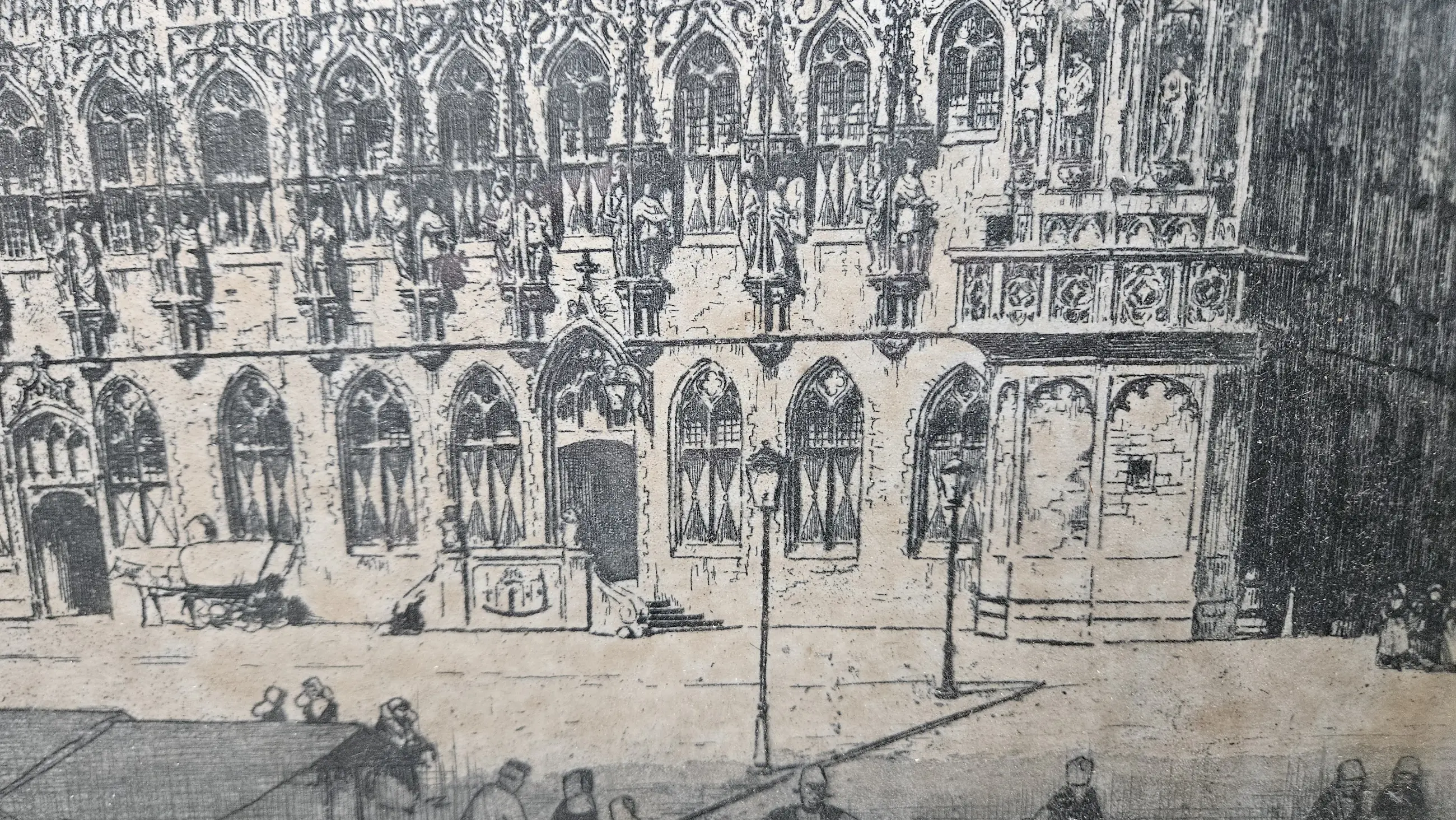 Original etching by the Belgian artist Eugène Lücker, known for his detailed cityscapes and architectural depictions. This work depicts Middelburg Town Hall, one of the most famous Gothic town halls in the Netherlands.