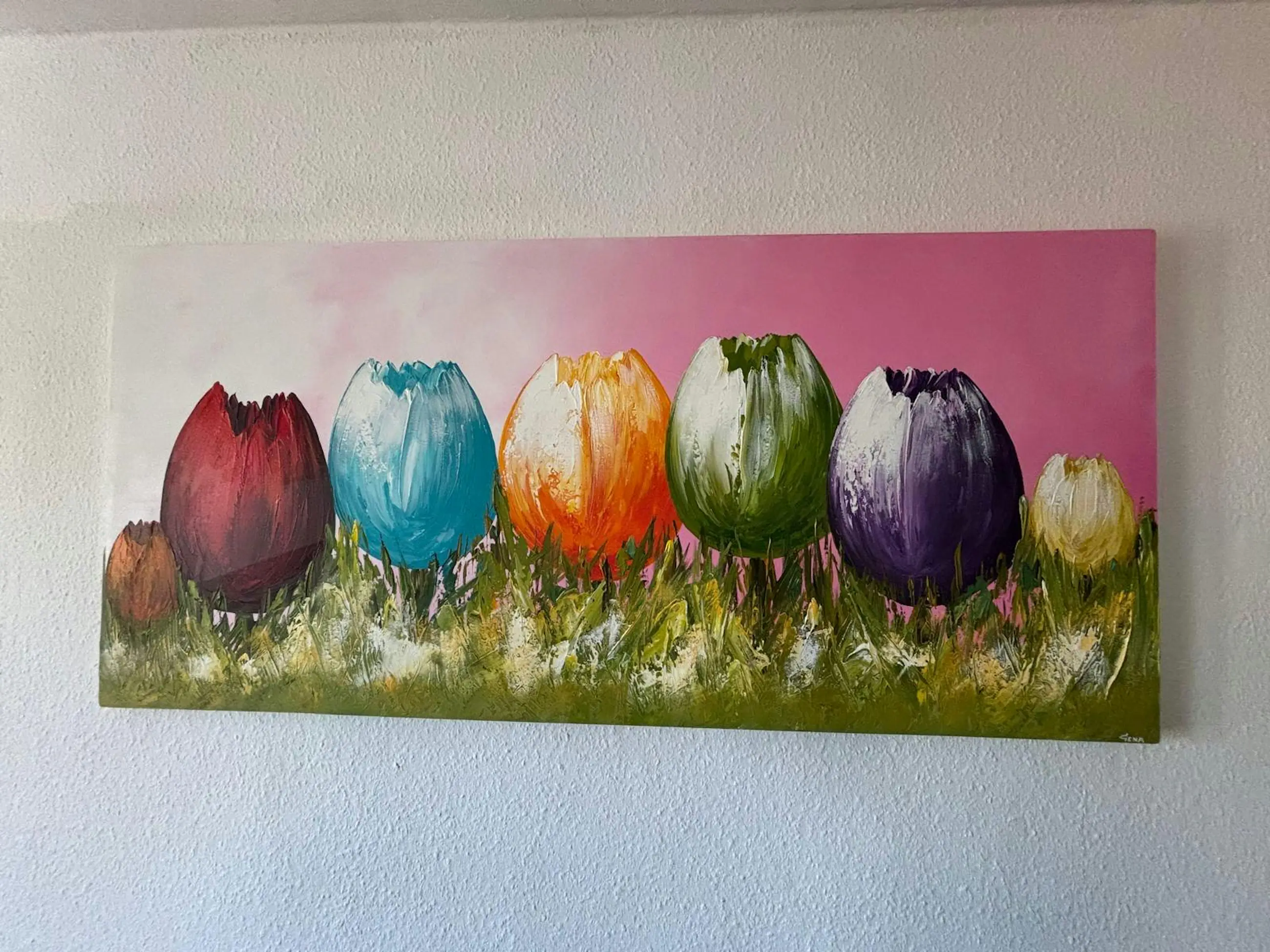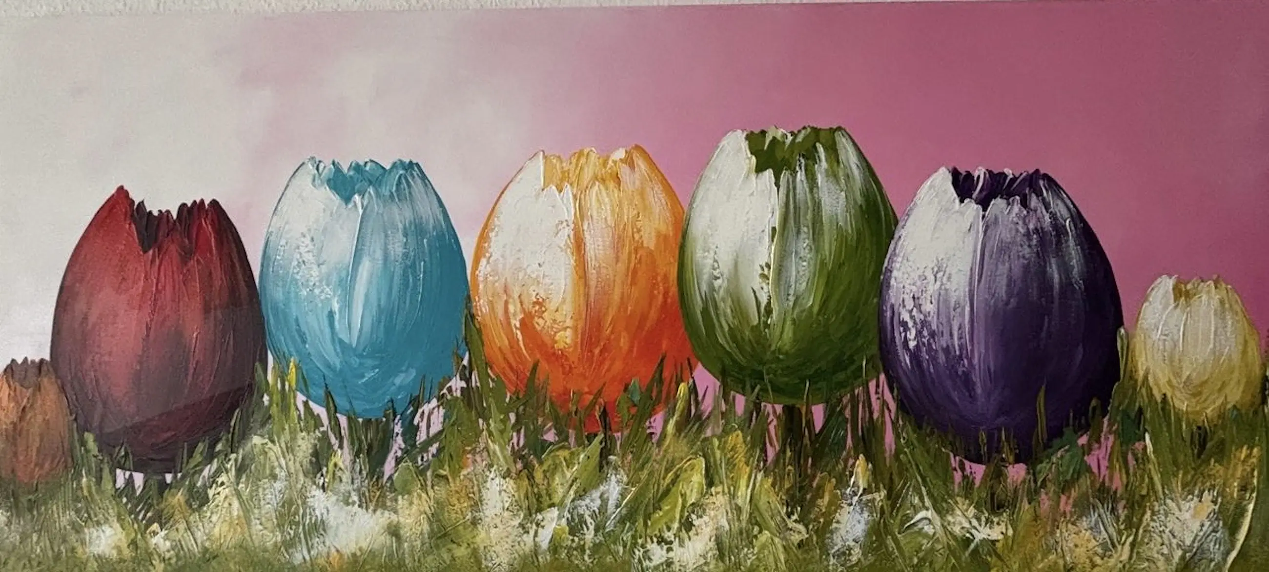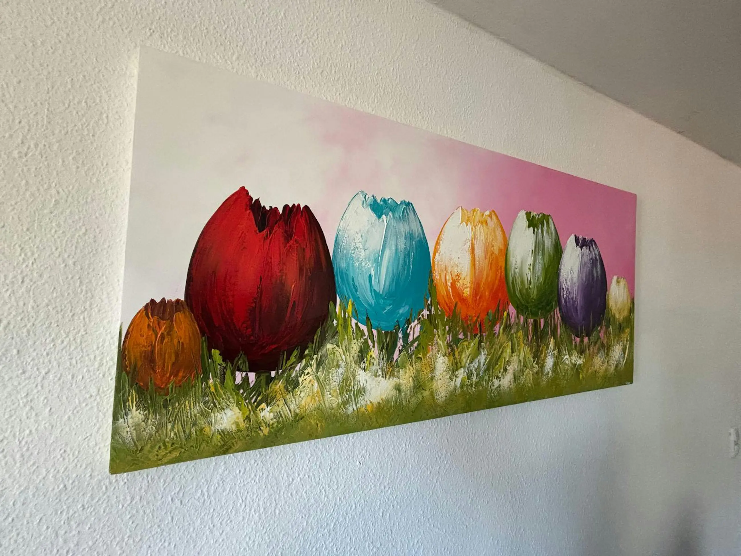 In this painting, colorful tulips unfold in full splendor, their delicate petals blooming in the most radiant colors. The colors—from bright red to soft purple to fresh yellow—reflect the diversity and joy that this transition to the warmer season brings. Each flower speaks of nature's rebirth.