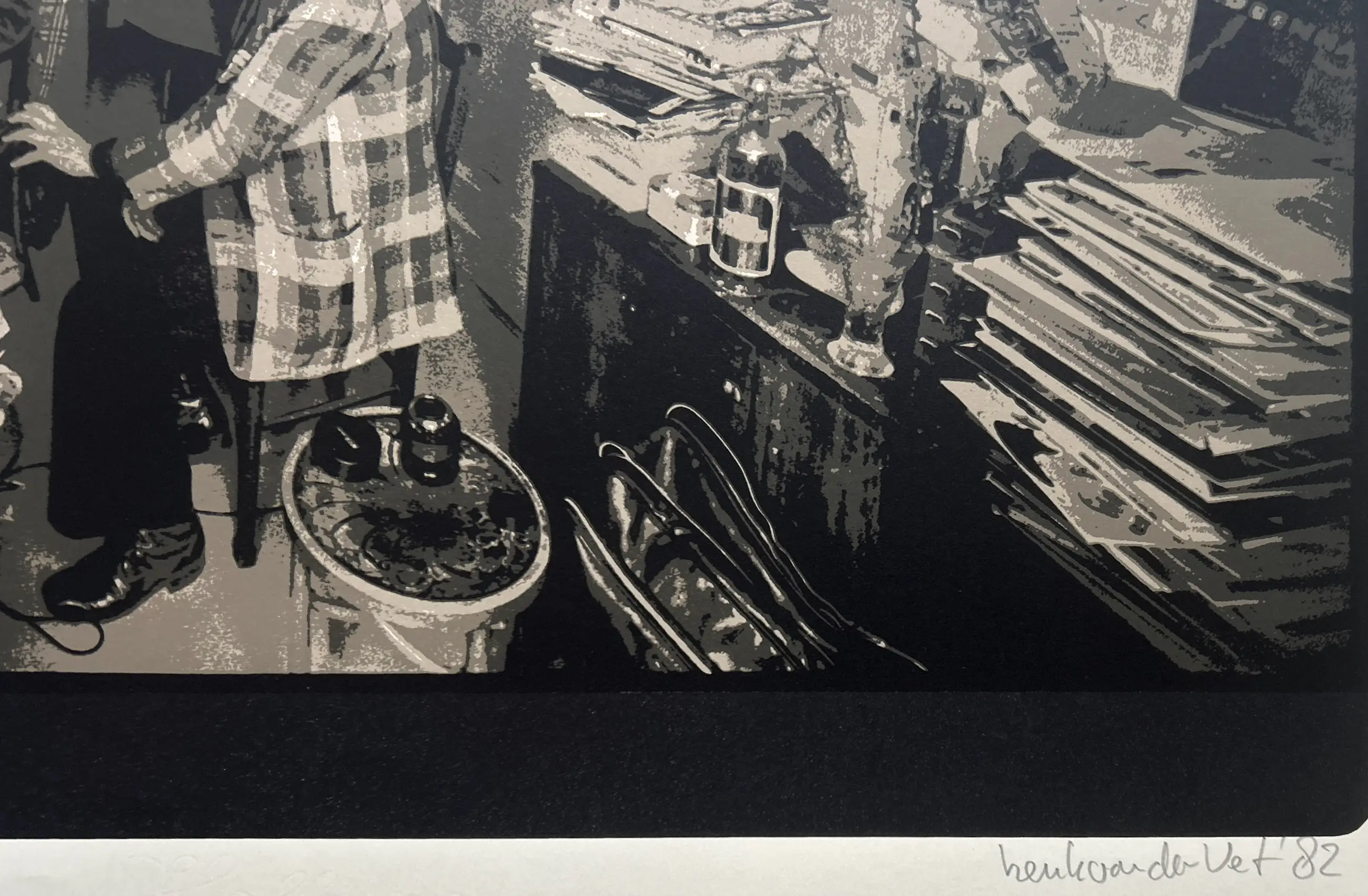 Condition: very good. Sheet has a dent and some corner creases, see photos. Circulation: 29/90. Dimensions: 50 x 65 cm. Silkscreen of a photograph featuring Christian Dotremont with Karel Appel. The photos were taken during the creation and printing of the portfolio "Duo pour Pinceau et Crayon." Will be carefully packaged and shipped insured.
