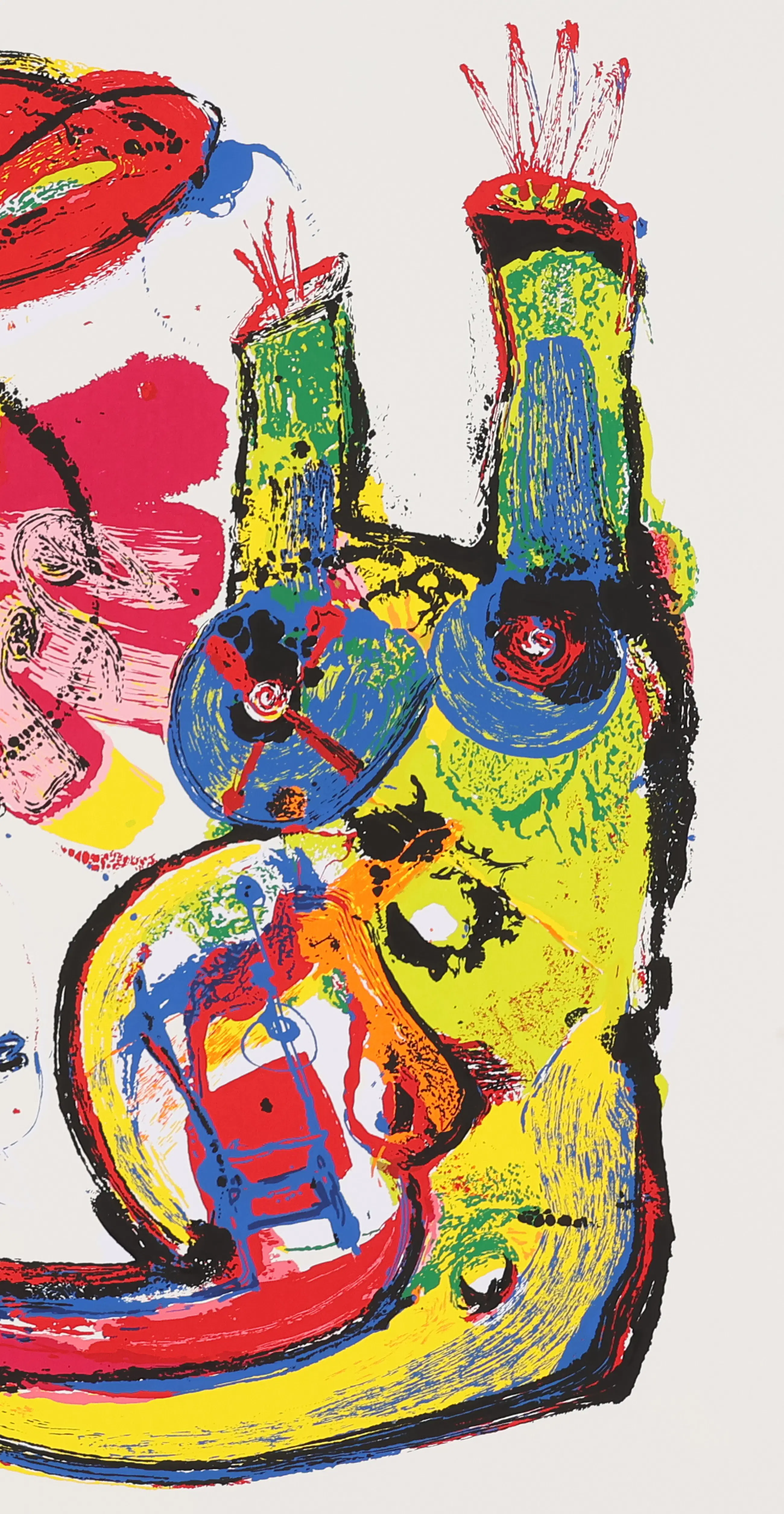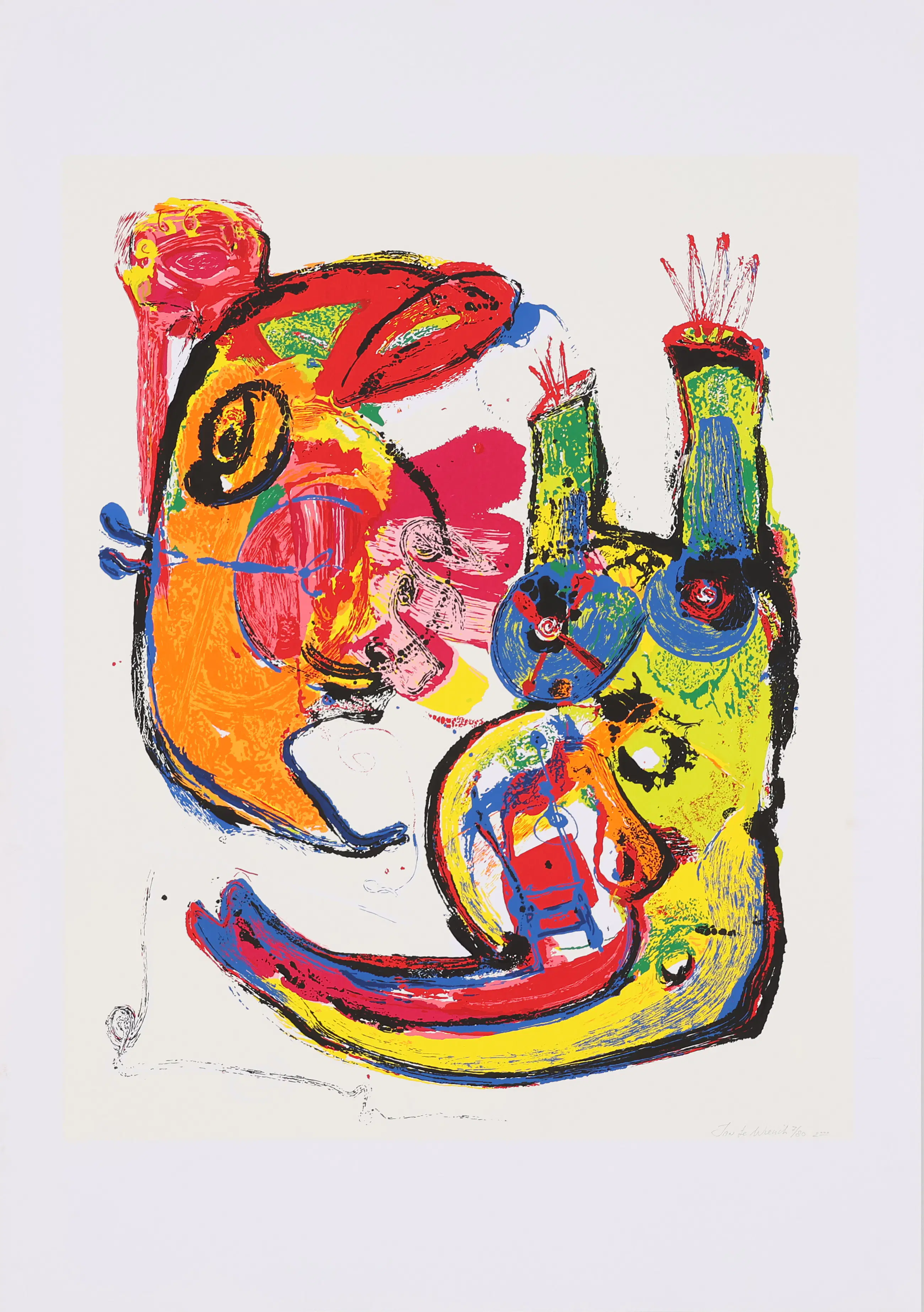 Jan te Wierik (1954-2002) typically used various materials (mixed media) for a week: acrylics, pigments, and acrylic lacquer. The colors of his work are primary, the background is muted, and most paintings depict two figures. Sometimes these are clearly animal figures, and sometimes a human figure can be discerned. Whatever the case, human or animal, woman or man, bird or dog, what these figures share is an intense connection or, conversely, a poignant lack of connection. They are illustrations of combative creatures. His work, therefore, expresses oppression, hilarity, tragedy, love, and sorrow, but never resignation. He rarely worked with a preconceived plan. The painter himself says the following about this: "I don't wait for inspiration. In my view, painting is a craft, and so, just like any other worker, I simply get to work in the morning."