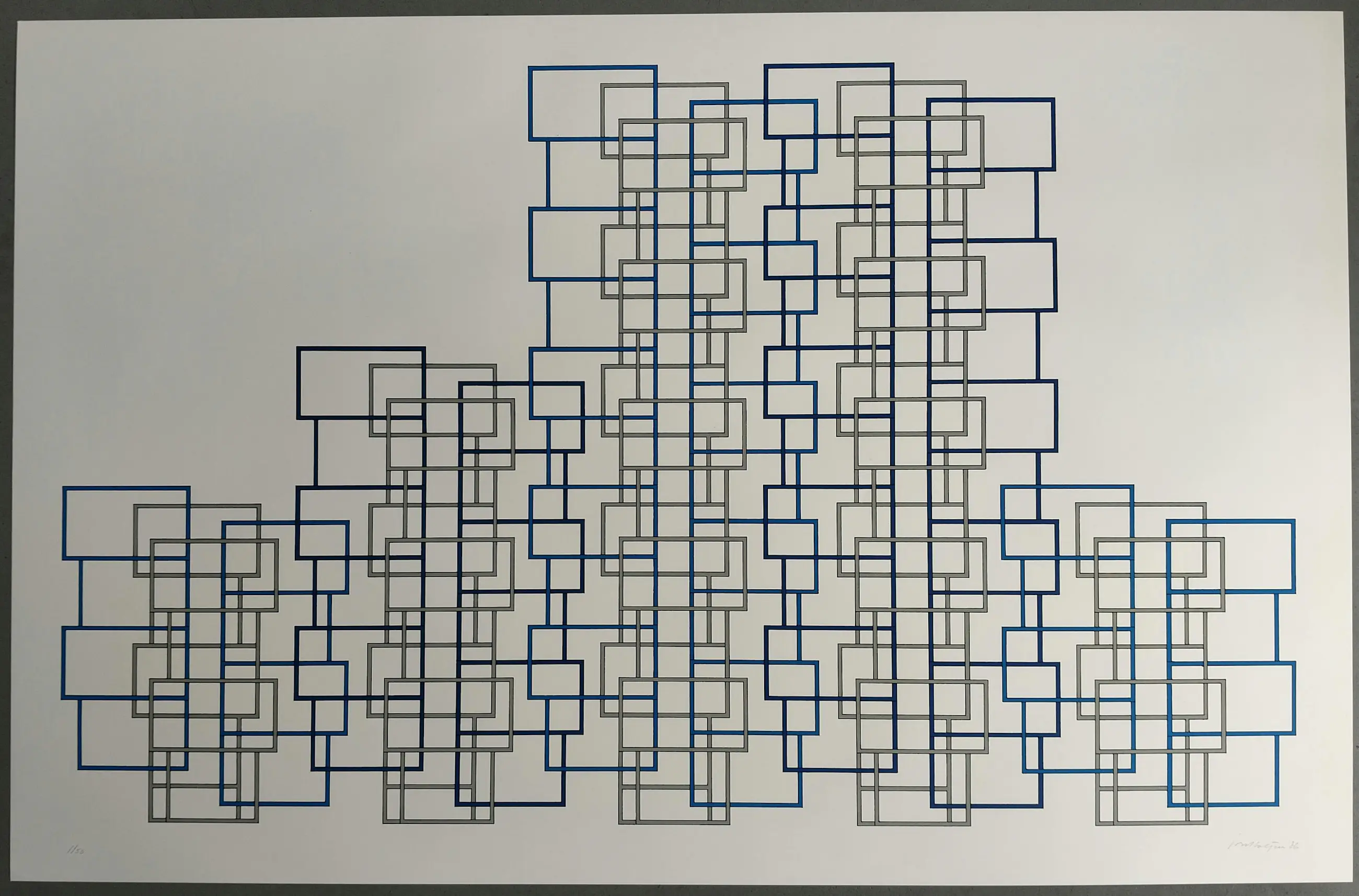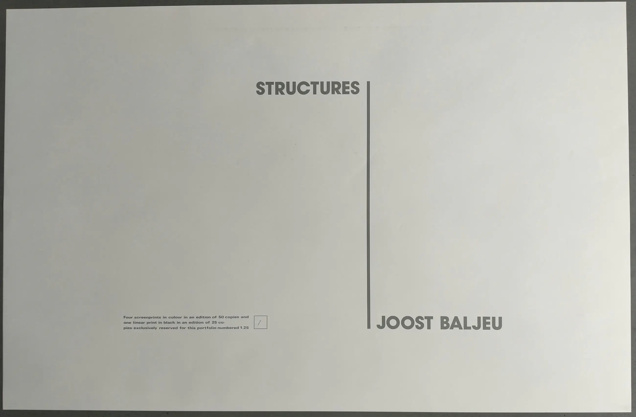 Folder with 5 signed silkscreen prints from the year 1986 by the artist Joost Baljeu (1925 - 1991) The 5 silkscreen prints are signed on the right in pencil and dated 86 and on the left with 1/50 Size of silkscreen prints 65 x 100 cm (h x w) The folder has some scratches and dented corners. 1 silkscreen has 2 light dents in the paper and another has a light fold on the right edge, otherwise the silkscreen prints are in excellent condition and have never been framed.