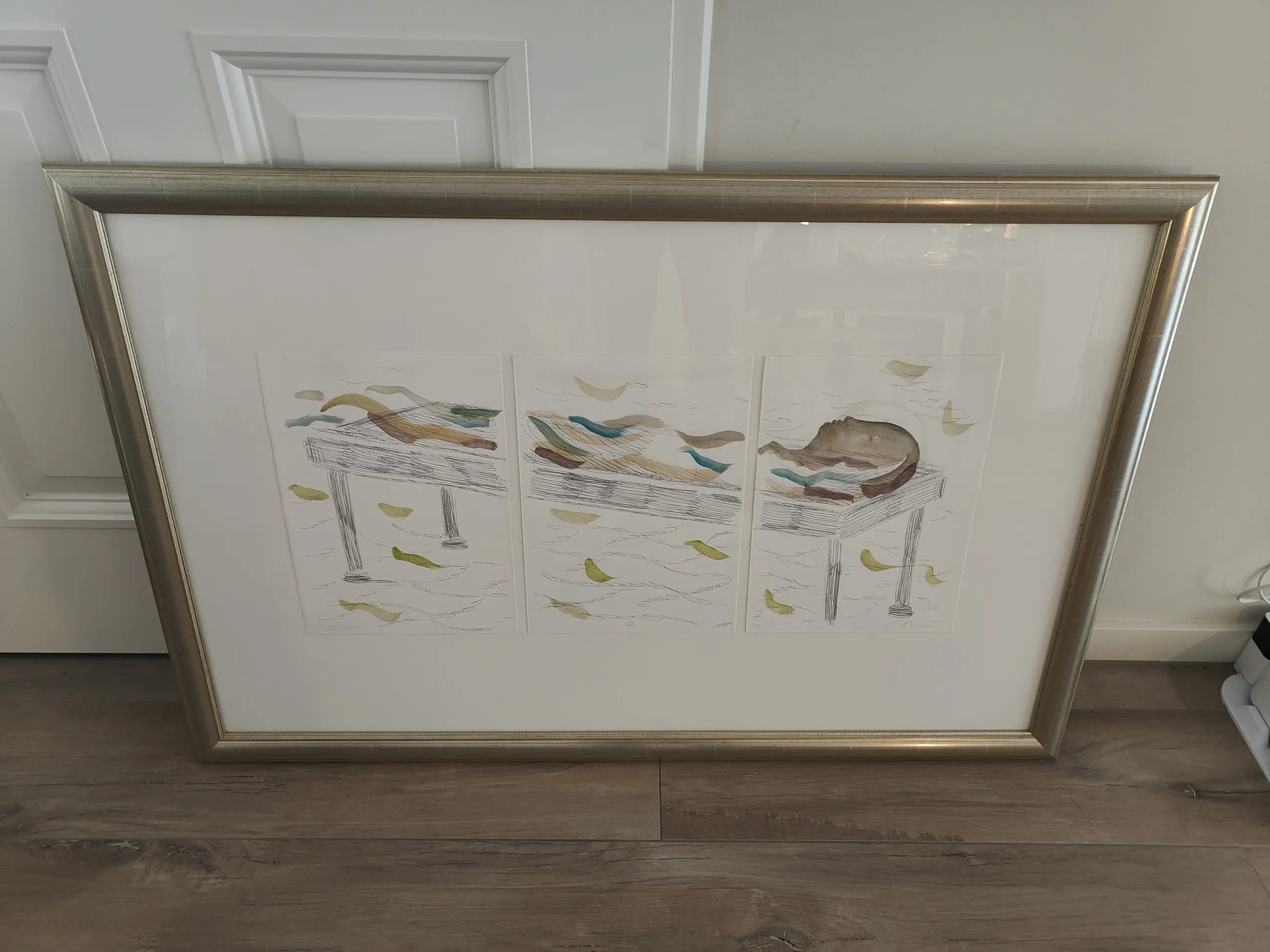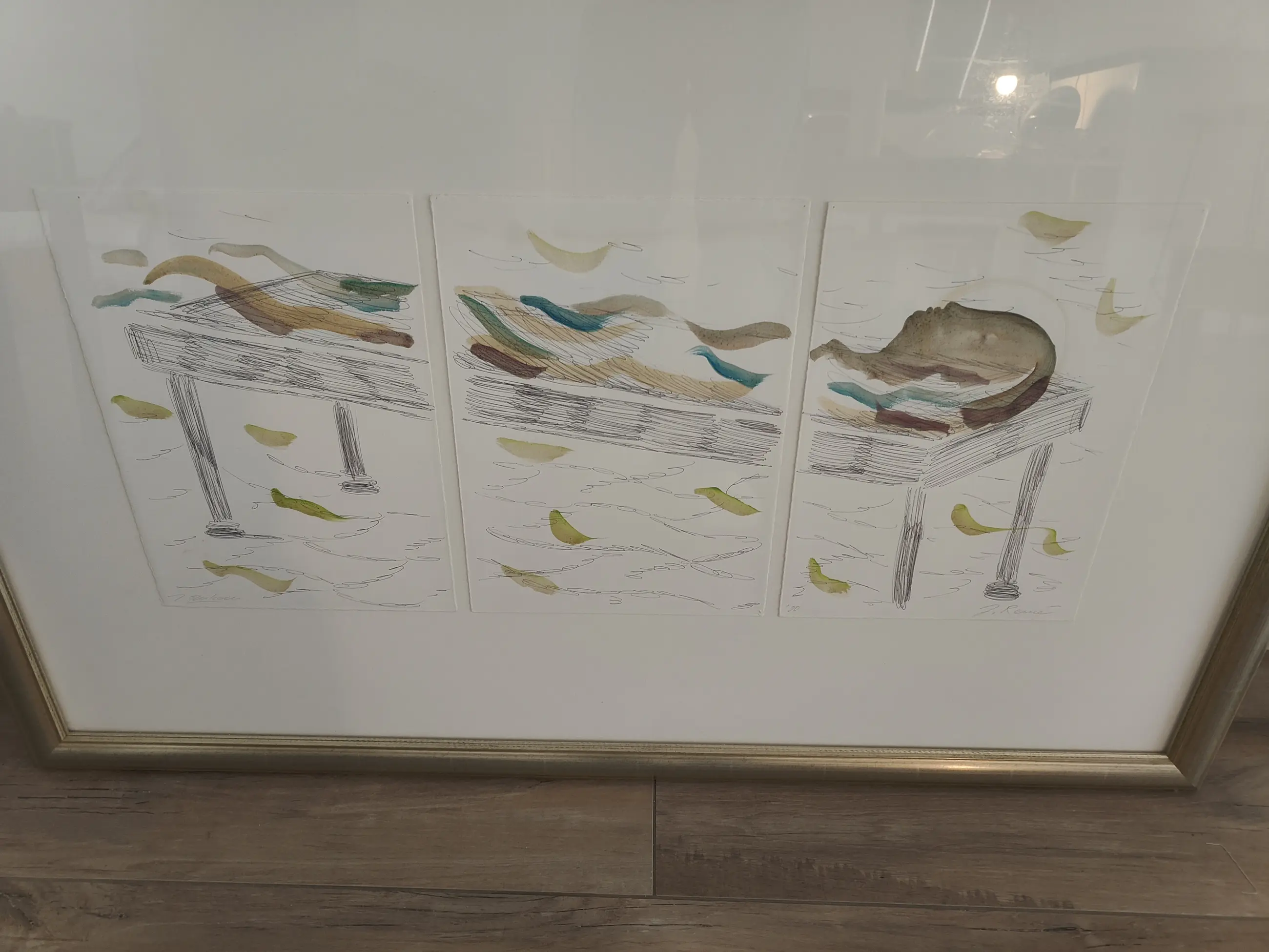 This triptych is a powerful example of his signature figurative style, with poetic tension and refined use of colour.