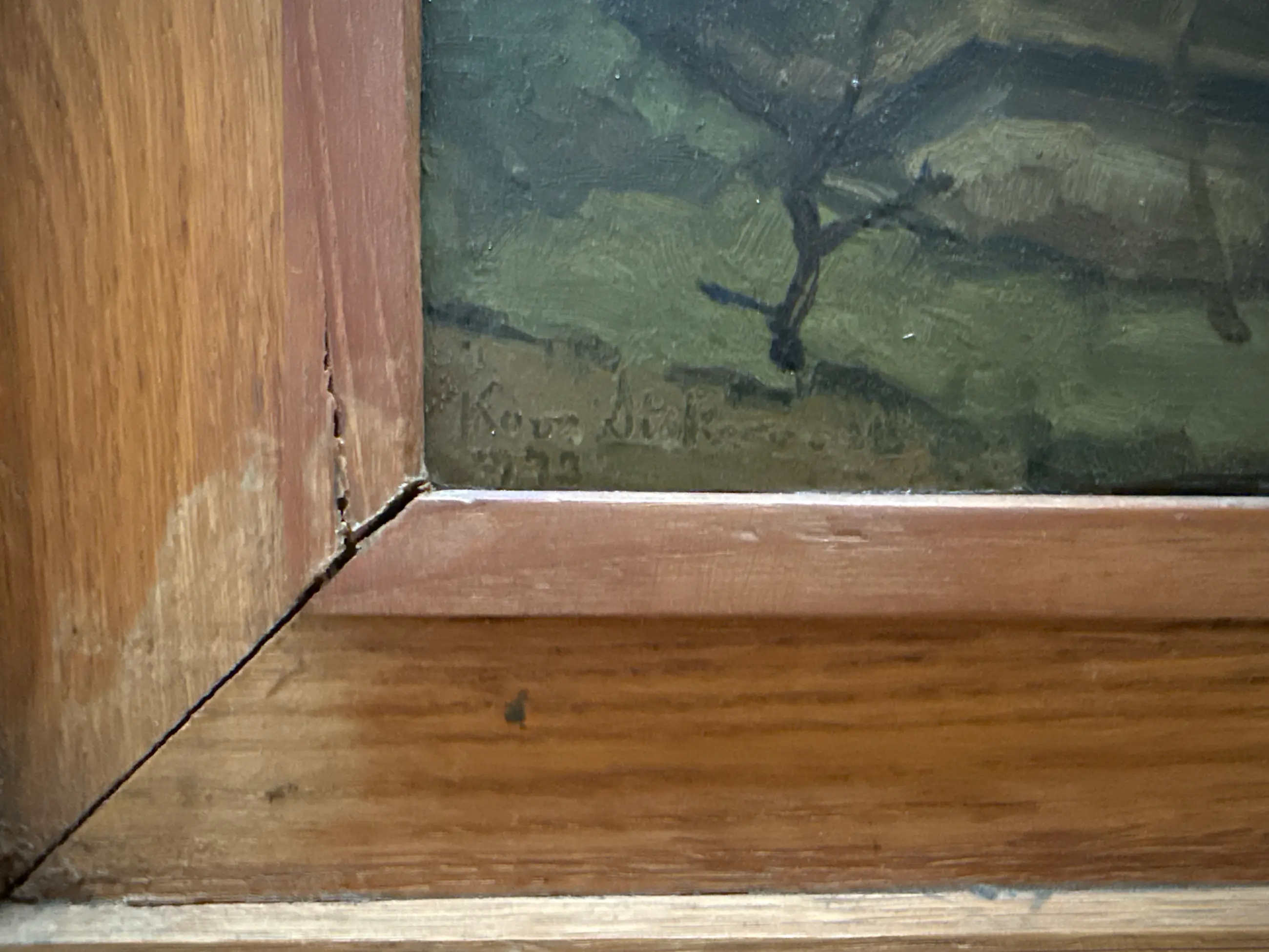 Work by Koos Stikvoort from 1973 (year of death). Still life of a landscape; farm surrounded by trees. In good condition.