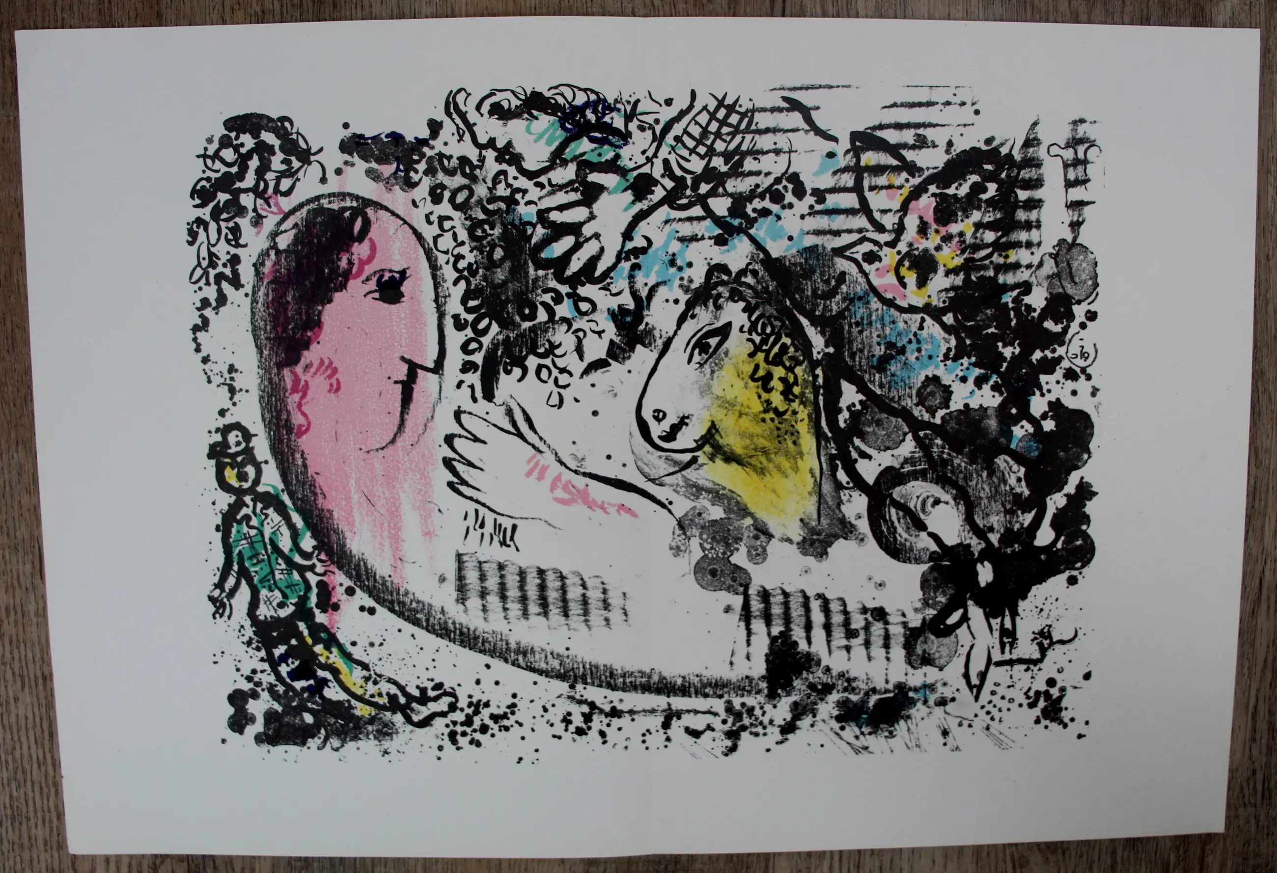 Lithograph by Marc Chagall (admirable). "Derriere le Miroir" from 1969. Dimensions of the sheet (measured only): H38 x W28cm. The work is unsigned. It has the traditional center fold, as issued. The booklet is included.