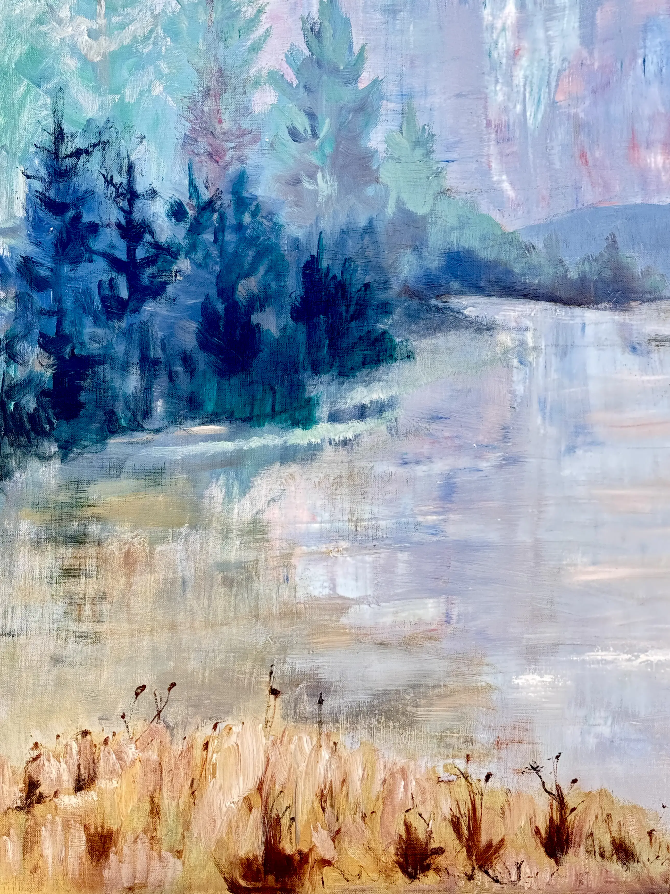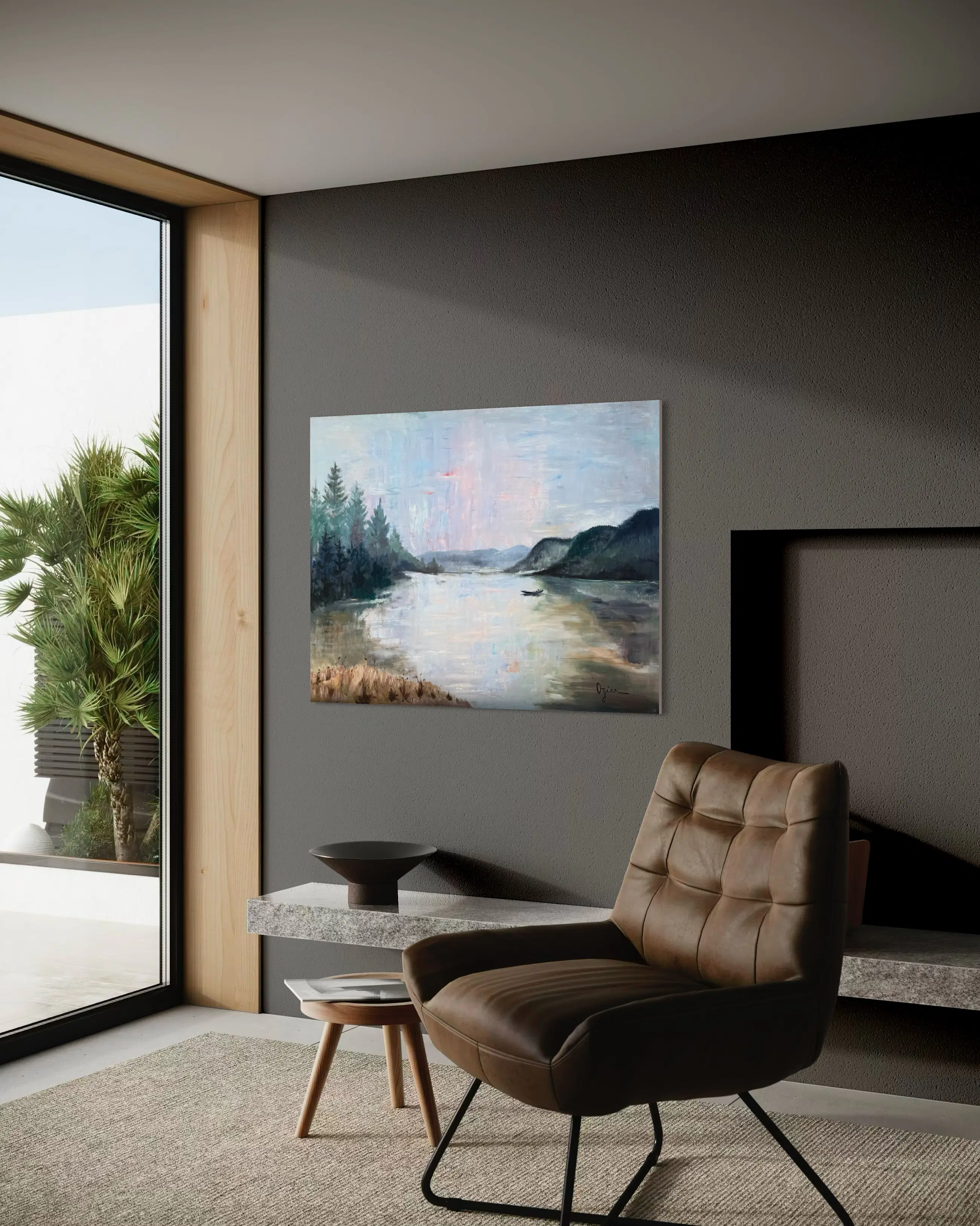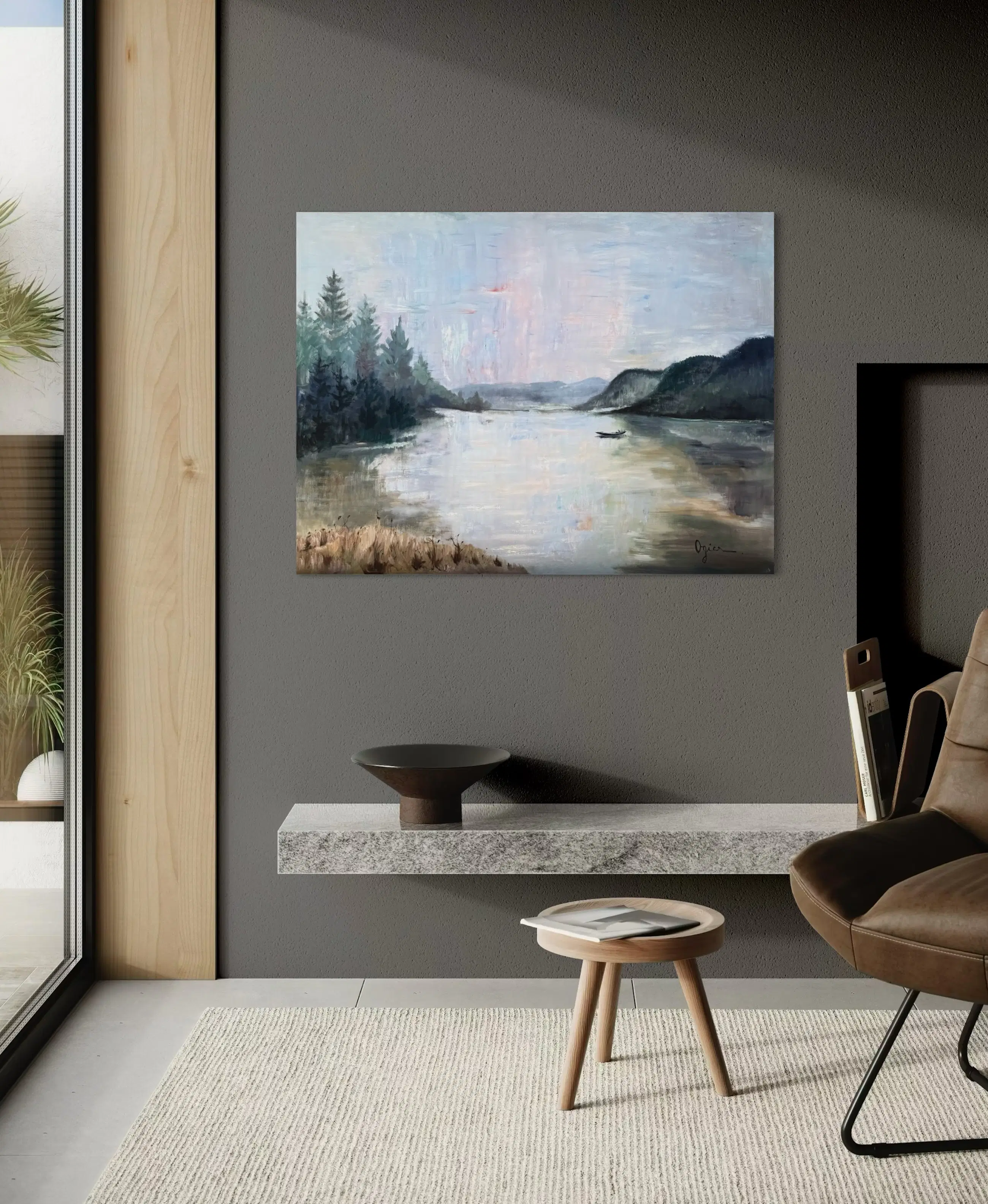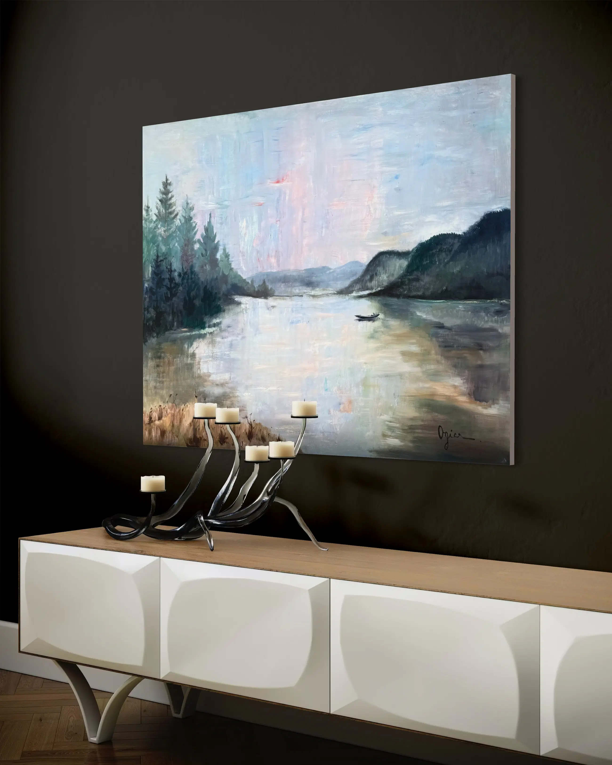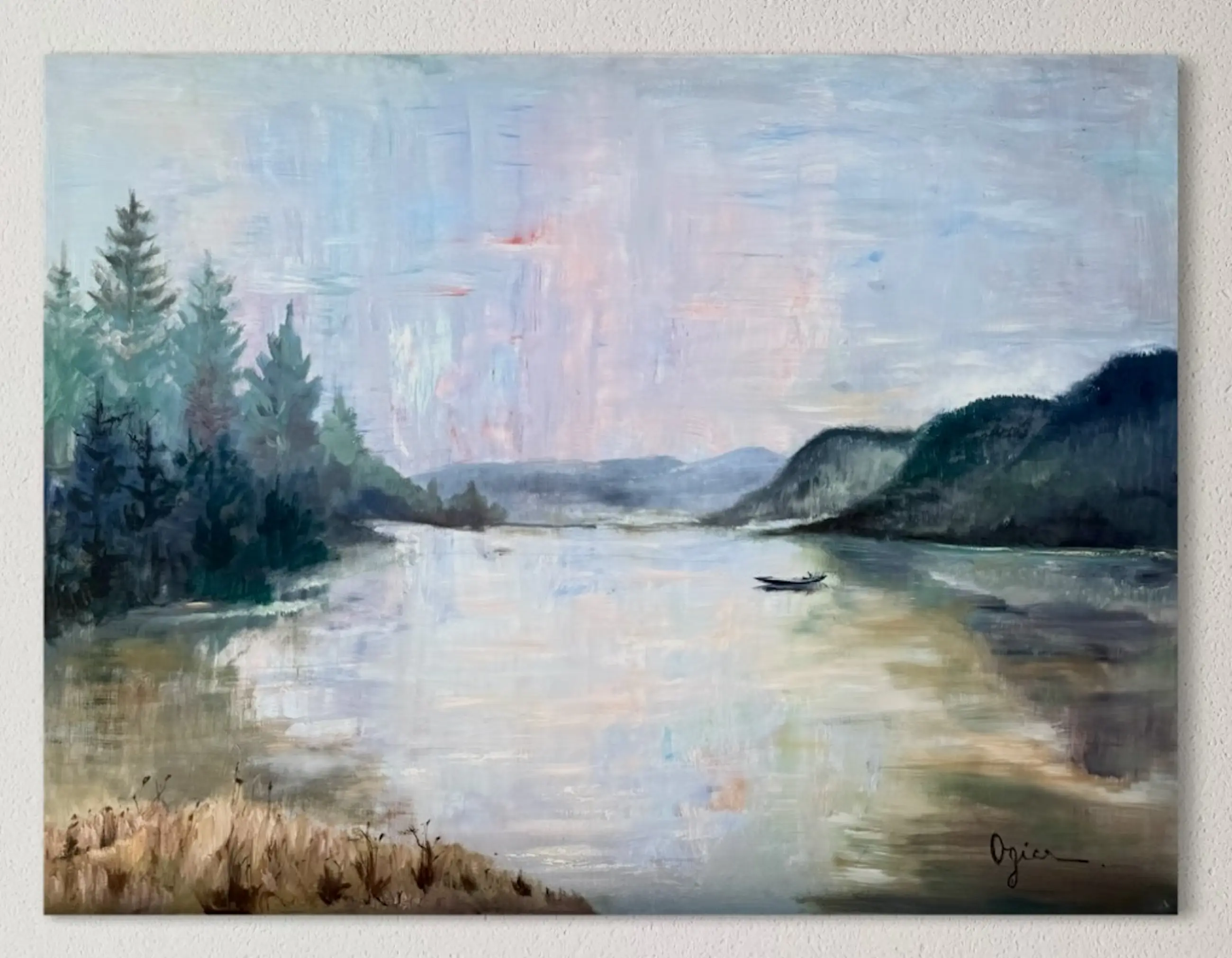 A rare composition by Marie Louise Ogier depicting a tranquil lakeside landscape, enlivened by a solitary boat. The subtle palette of blues, greens, and pinks, combined with vibrant reflections, gives the work a poetic and contemplative atmosphere.