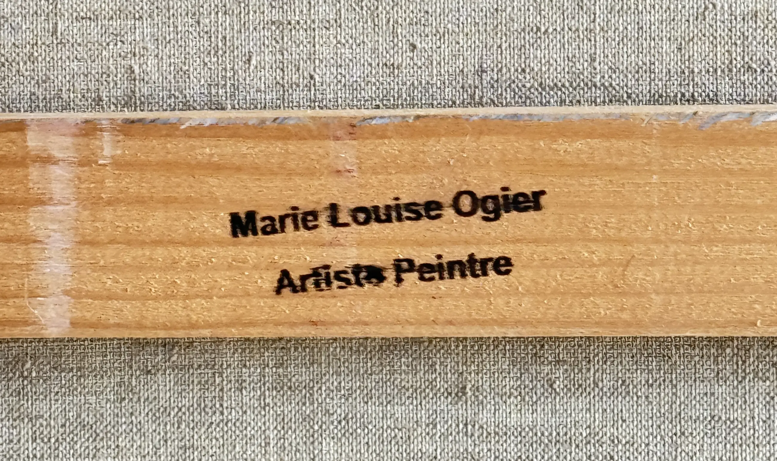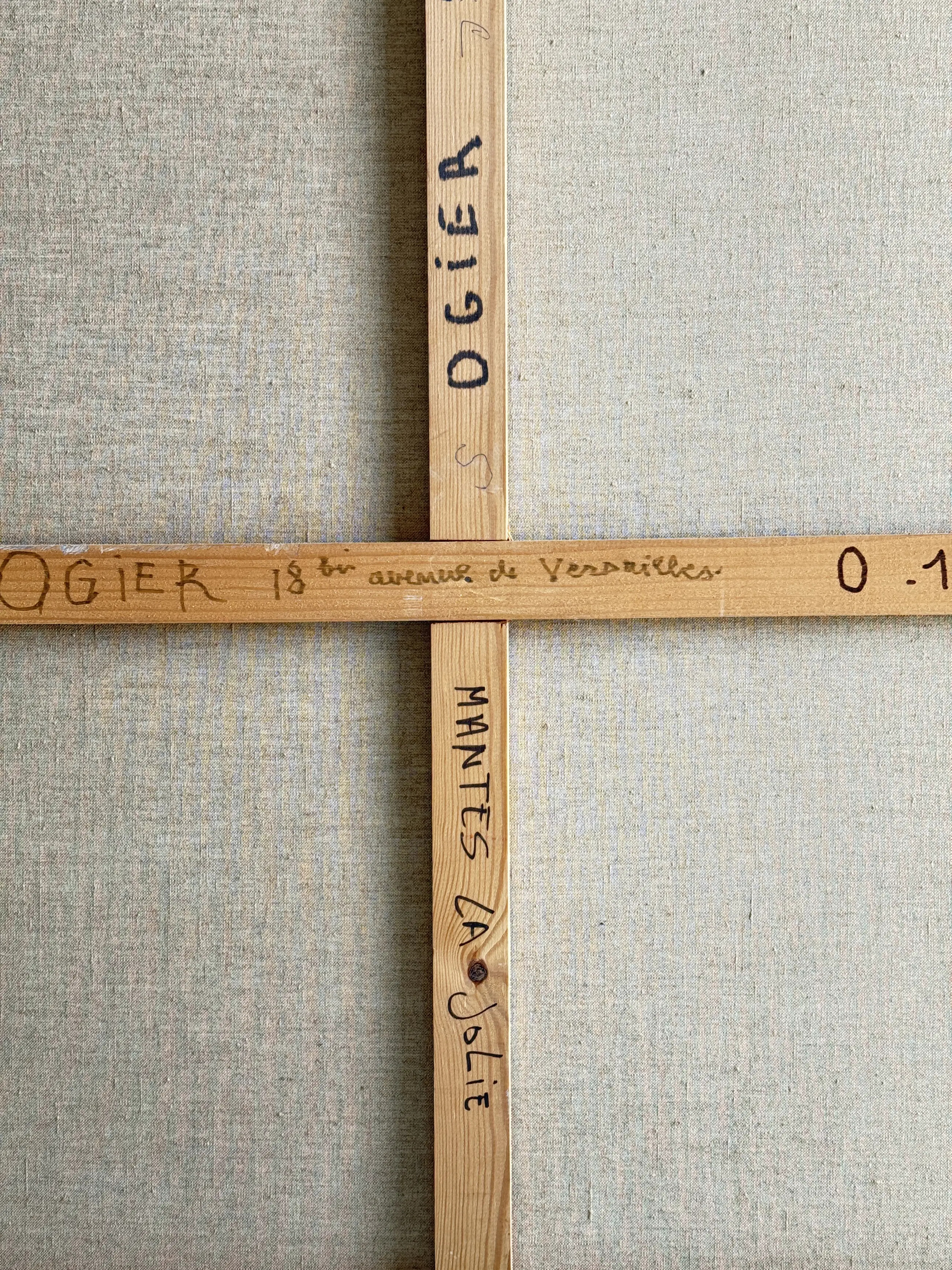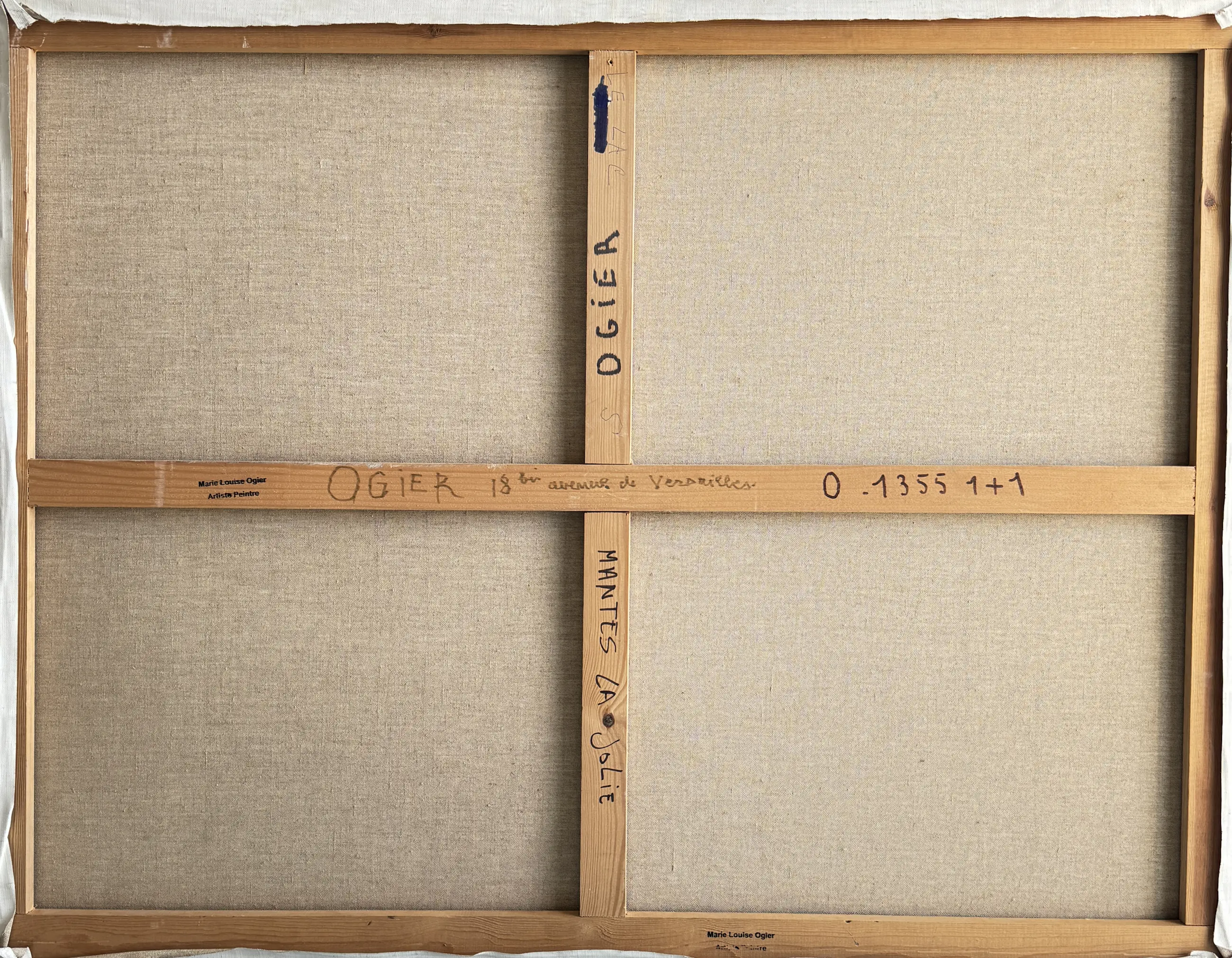 The back of the painting features handwritten inscriptions ("Ogier", "Mantes la Jolie", address in Versailles, numbering), confirming its authenticity and provenance. Good overall condition, original canvas perfectly stretched.