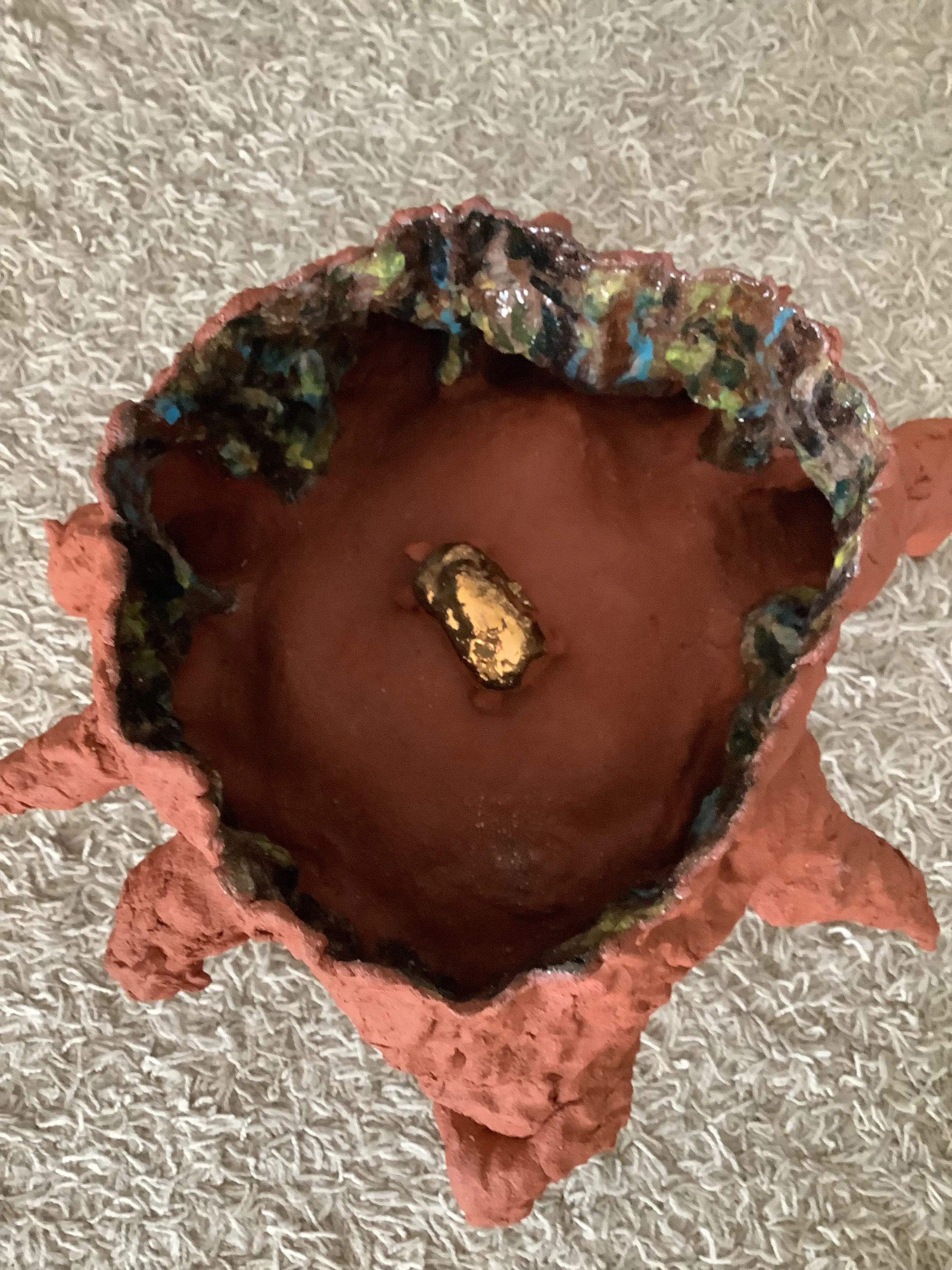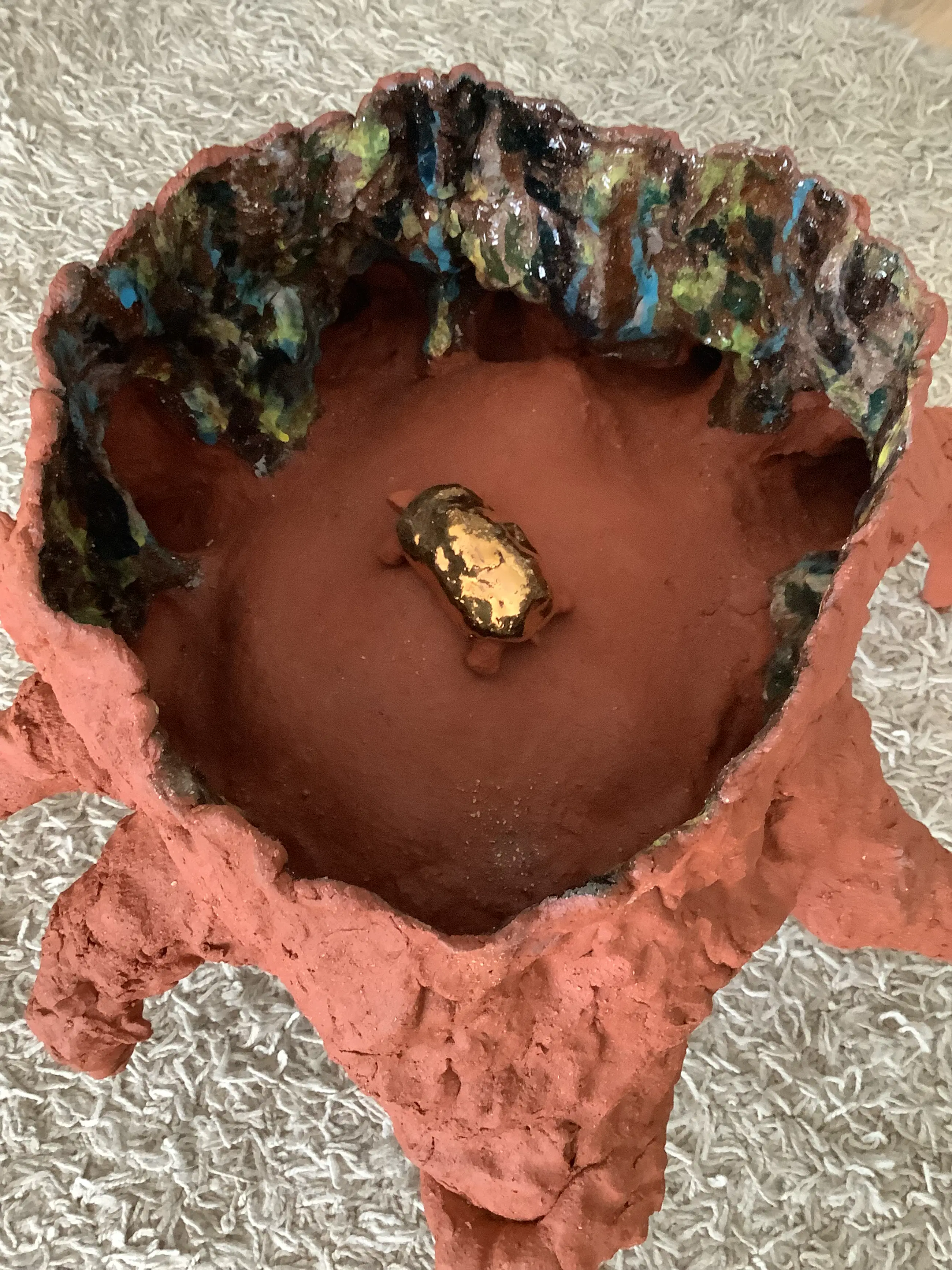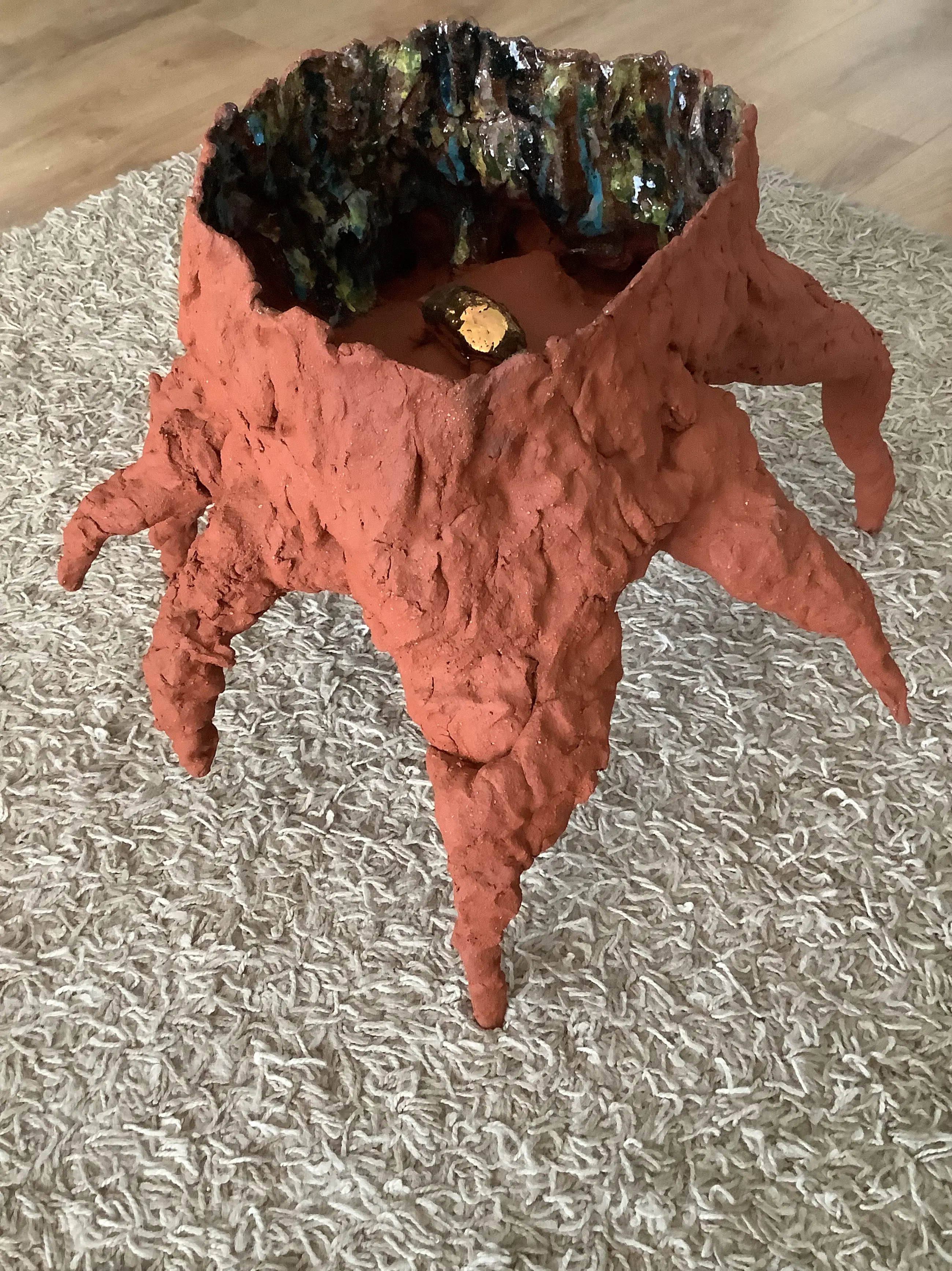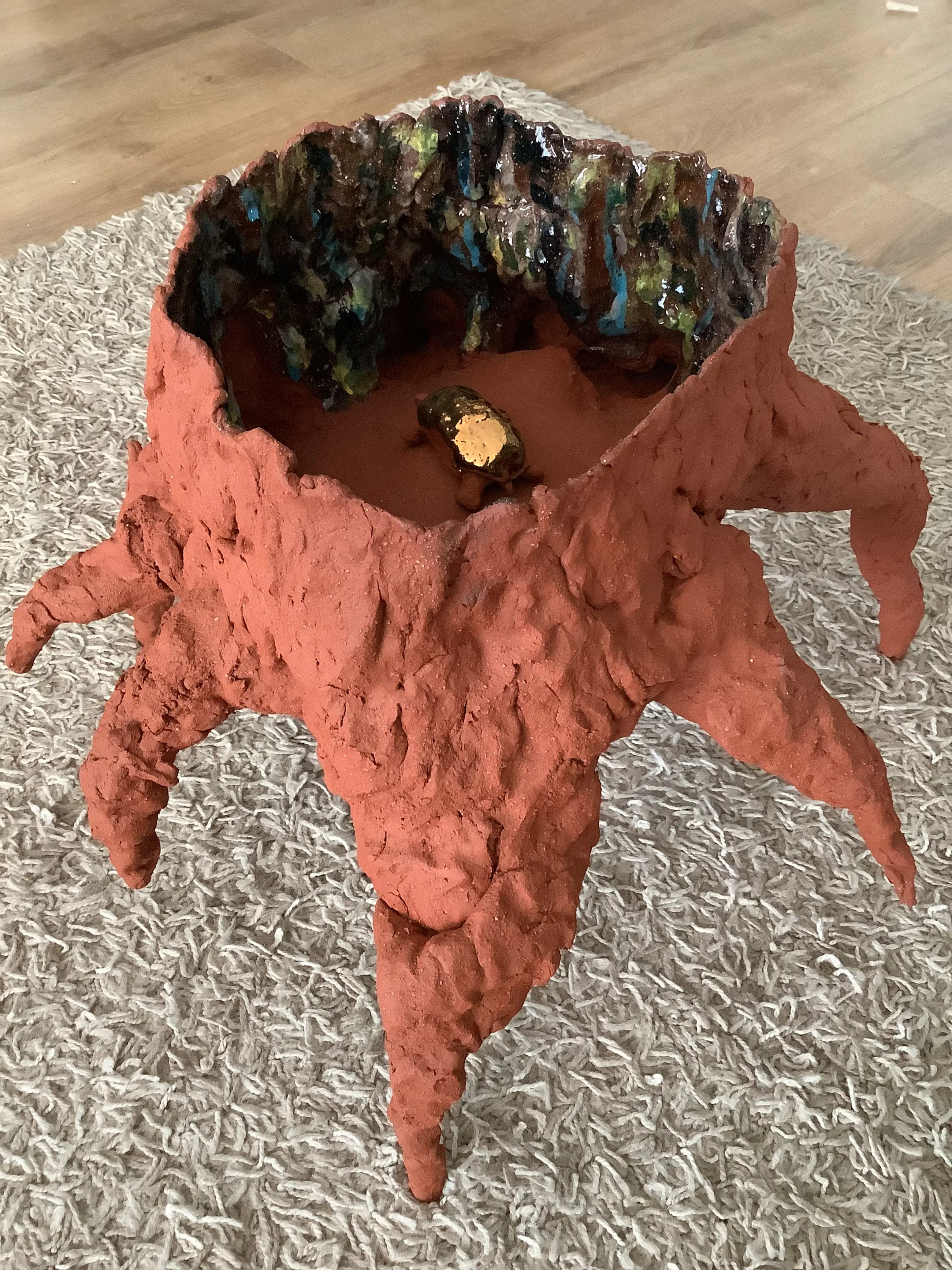Tree Roots is an abstract-looking painting by the Dutch painter Vincent van Gogh. The painting is made with oil paint on canvas. The canvas measures 50.3 x 100.1 centimeters and was made in 1890 in Auvers-sur-Oise. Research has shown that this was probably the painter's last work. This painting was taken as a starting point for the tree shape. The colors are made with engobes, colored clay powder, and transparent glaze on top. Many tests were done to arrive at the correct colors of Van Gogh. The tree is made of ceramic fired at 1180 degrees. The turtle is made of ceramic, glaze and gold luster. Gold luster is a thin layer of real gold, 18 carat, that I fired on the turtle. For gold you have to fire three times, once at 1020 degrees biscuit, then at 1180 degrees with glaze for under the gold and once at 780 degrees for the gold.