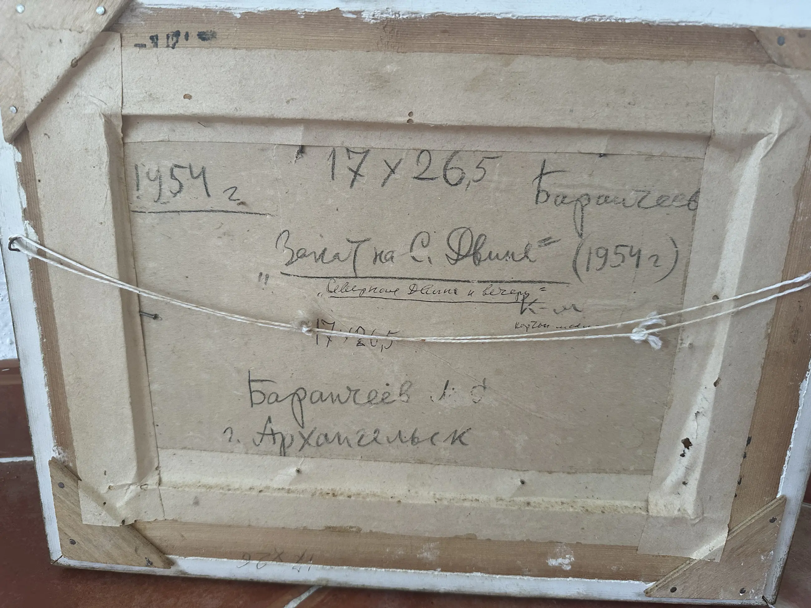 This is a work by the Soviet painter Mikhail Sergeevich Barancheev (signed "Баранчеев 1954" lower right). It depicts a river landscape at sunset or sunrise, with steamboats on the river and banks in the foreground. It has subtle pastel colors and soft brushwork