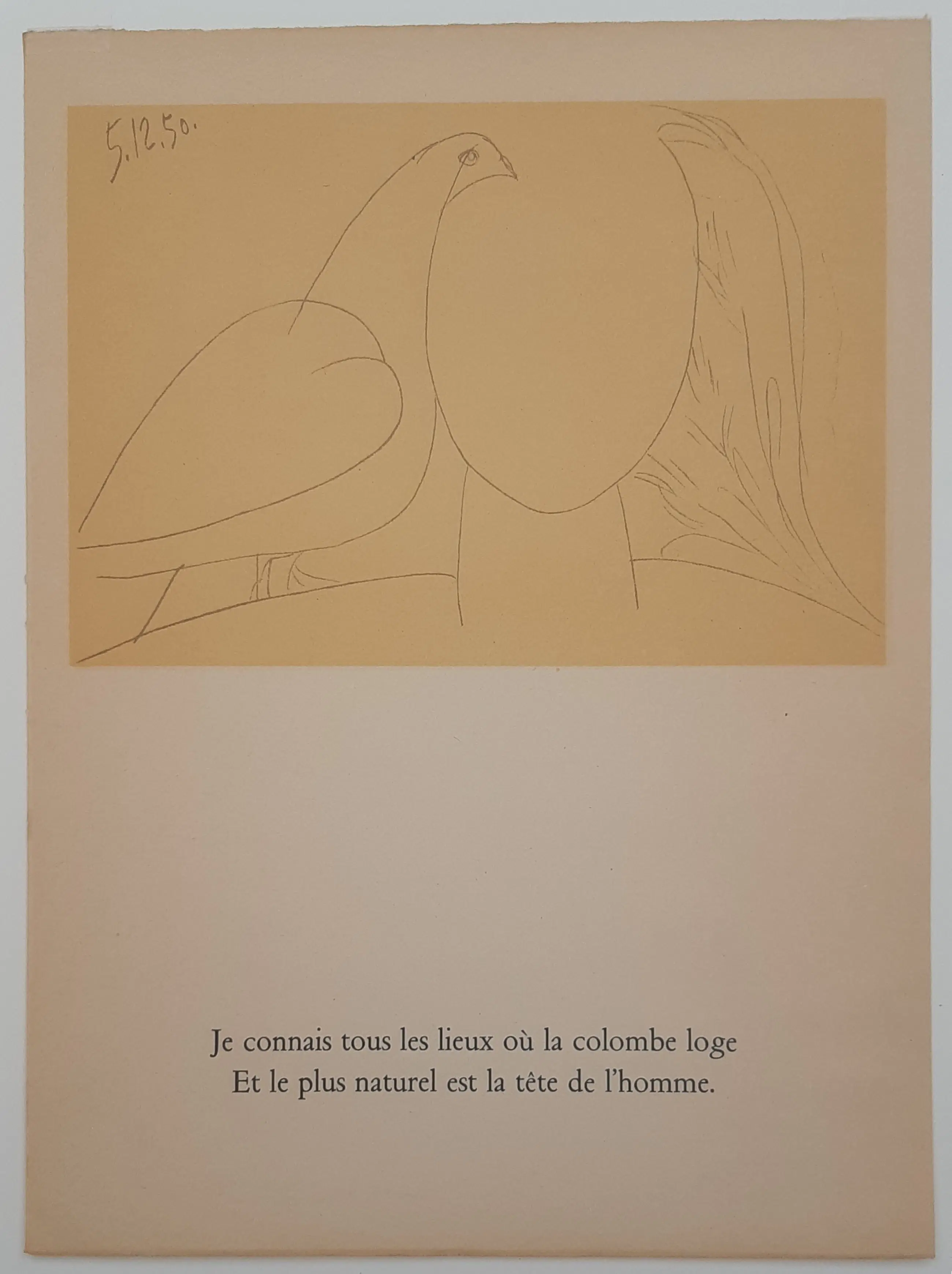 This lithograph by Pablo Picasso, dated December 5, 1950, is part of the folder "Le Visage de la Paix" (The Face of Peace), a series of 29 lithographs, each featuring a poem by Paul Éluard. The lithograph depicts a head, possibly a female profile, with a dove—the global symbol of peace.