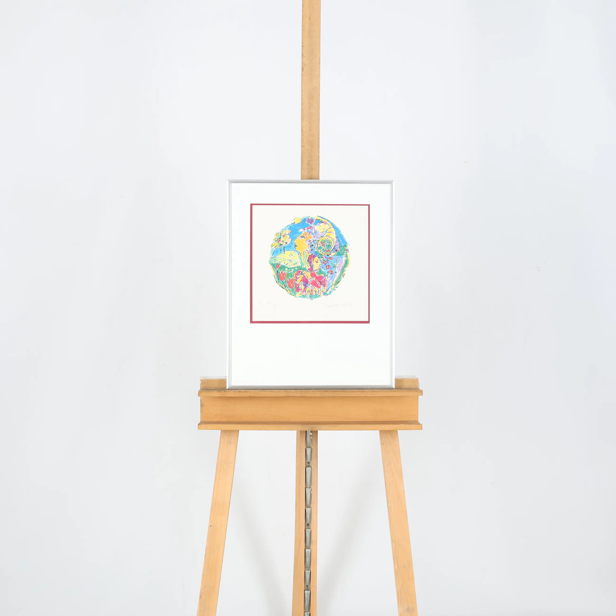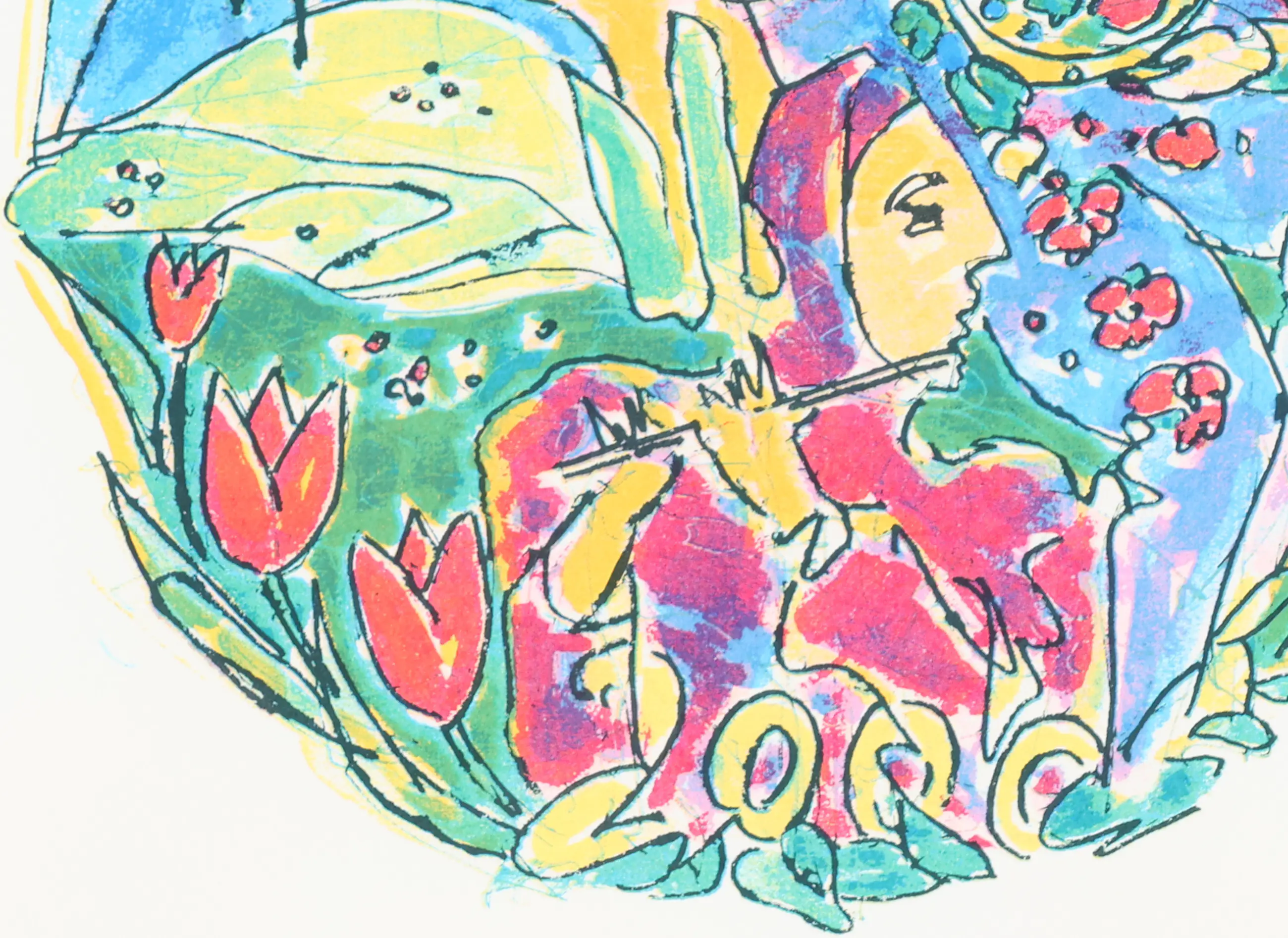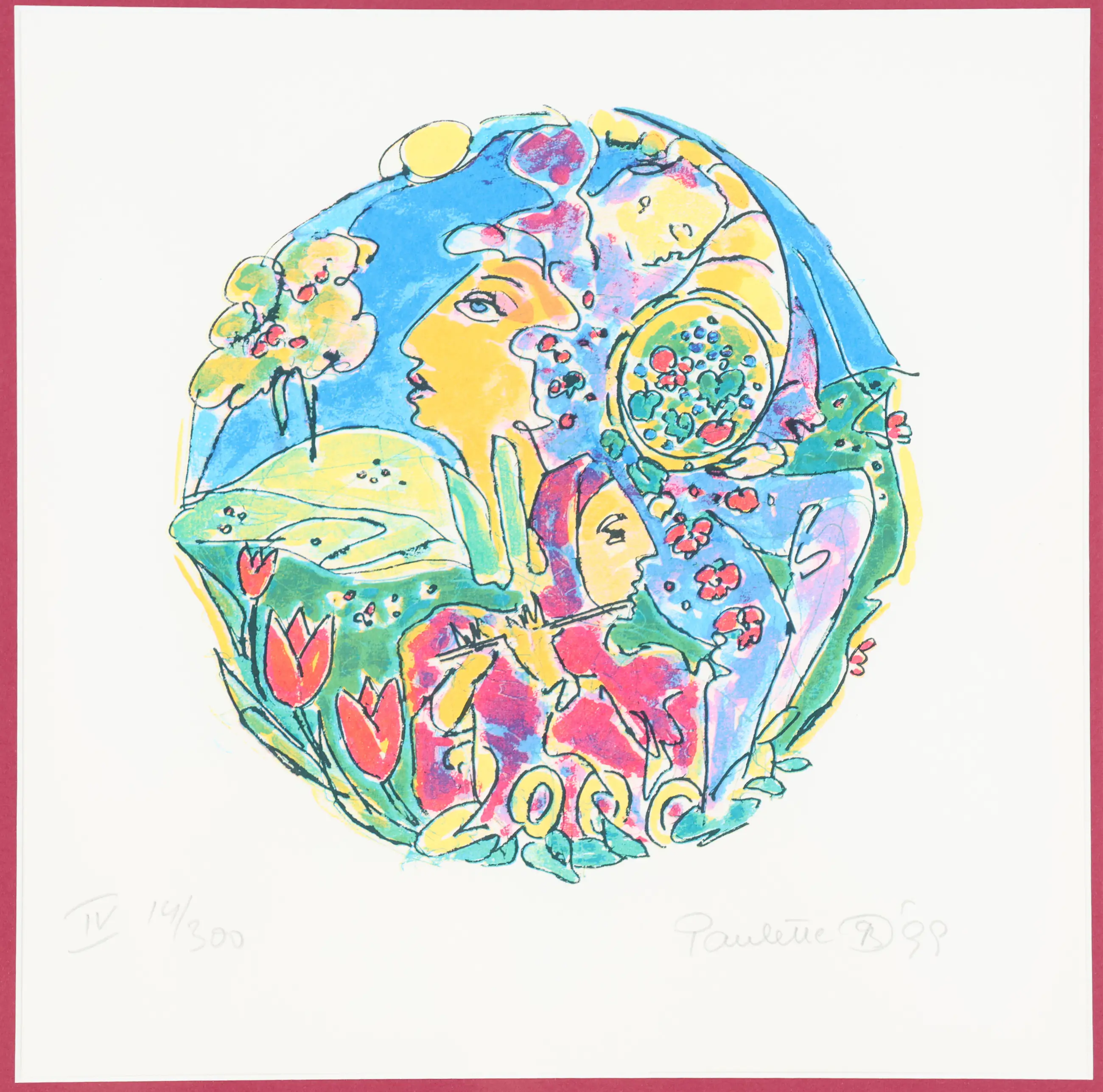 This unique, circular work by Paulette Snijders-Bremen (Kerkrade, 1946) colorfully and expressively depicts a fusion of faces and natural elements. It invites the viewer to look again and again and discover new forms.