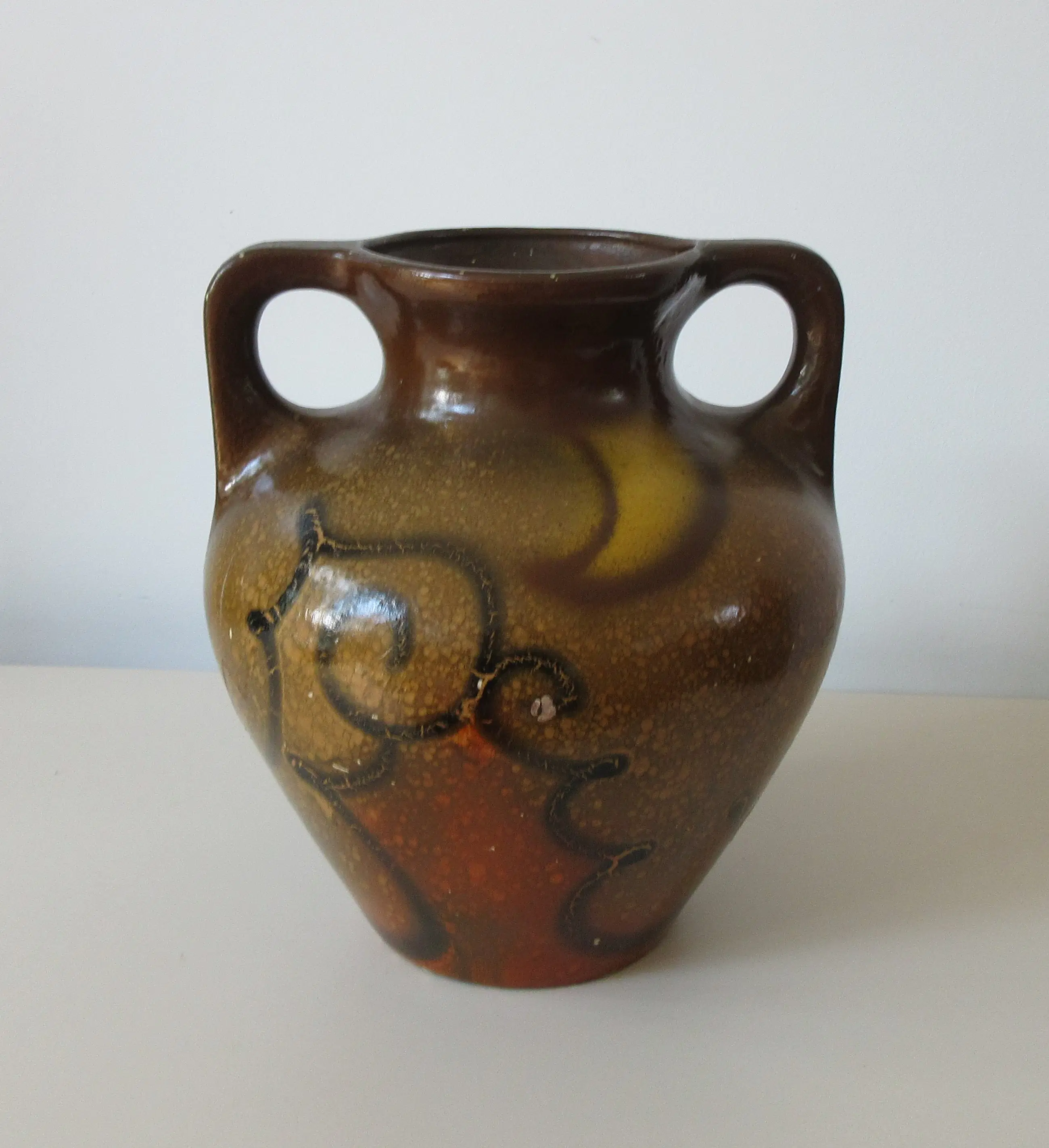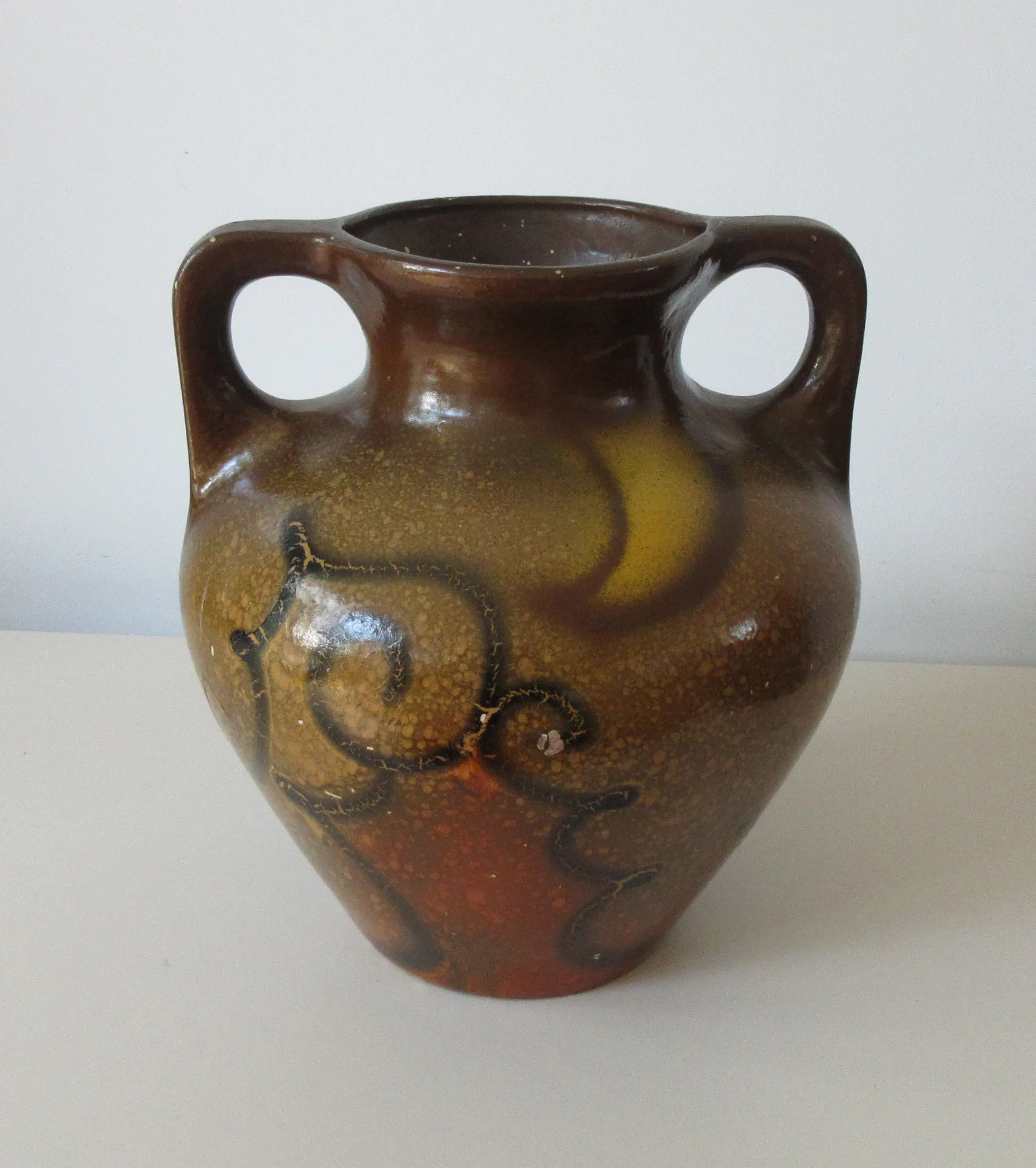 Earthenware amphora vase with crisis - cold lacquer glaze. In good condition, has some glaze flakes.