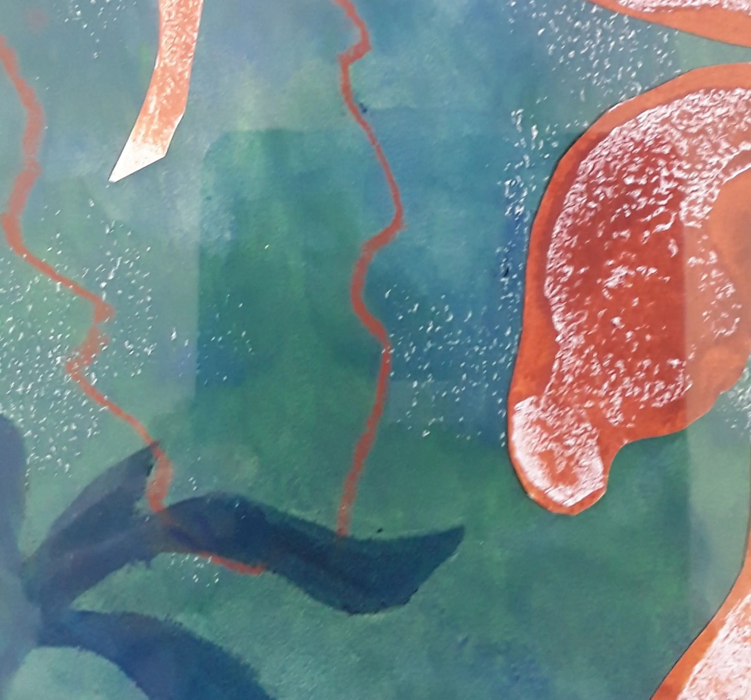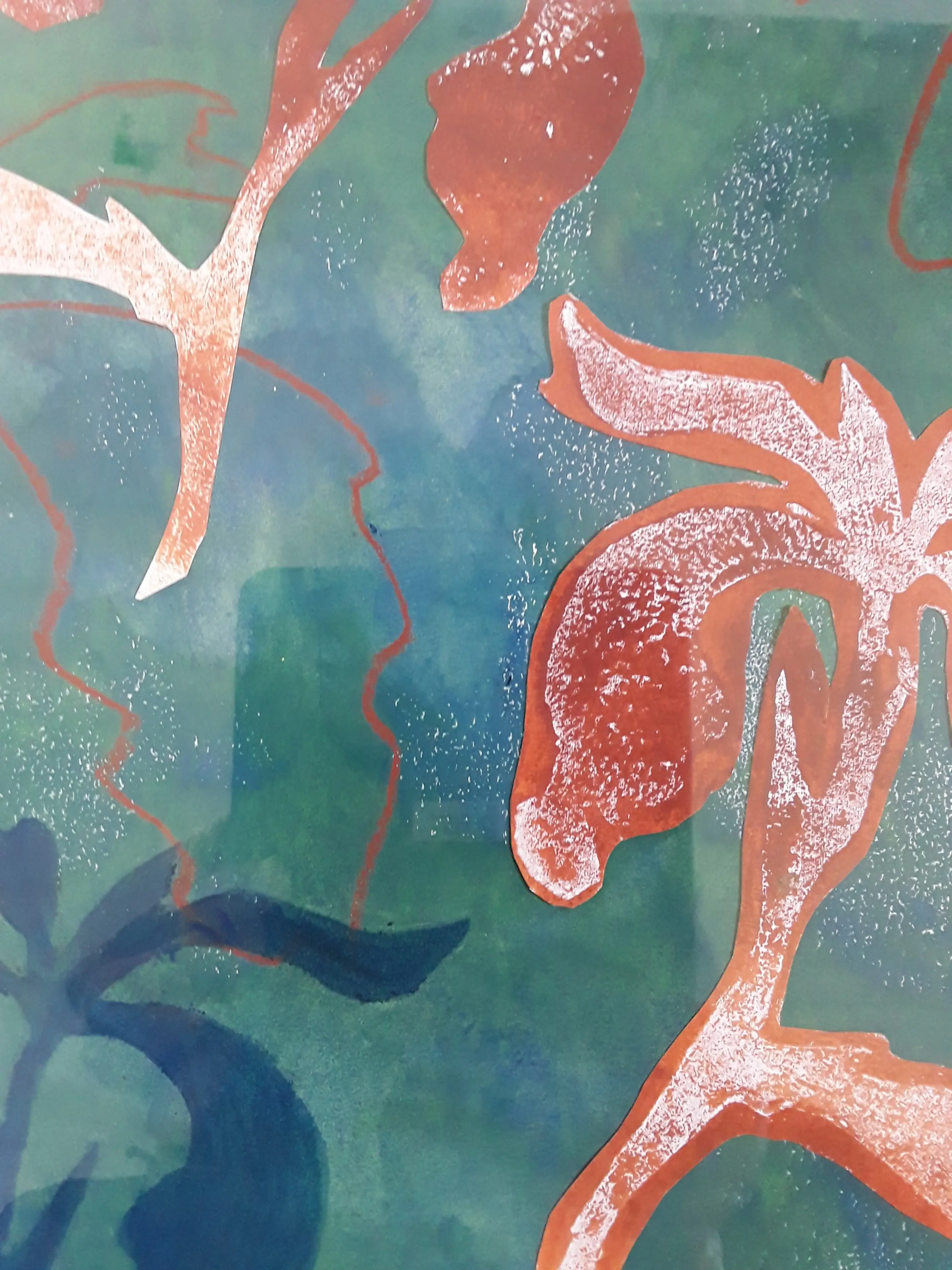 Delen van monoprints van bloemen (de Lis) zijn opnieuw verwerkt ineen collage. Deze laat een helder en warm kleurenpalet zien met een duidelijke compositie. In een passe partout van 30 bij 40 cm is het een aangenaam werk om naar te kijken.