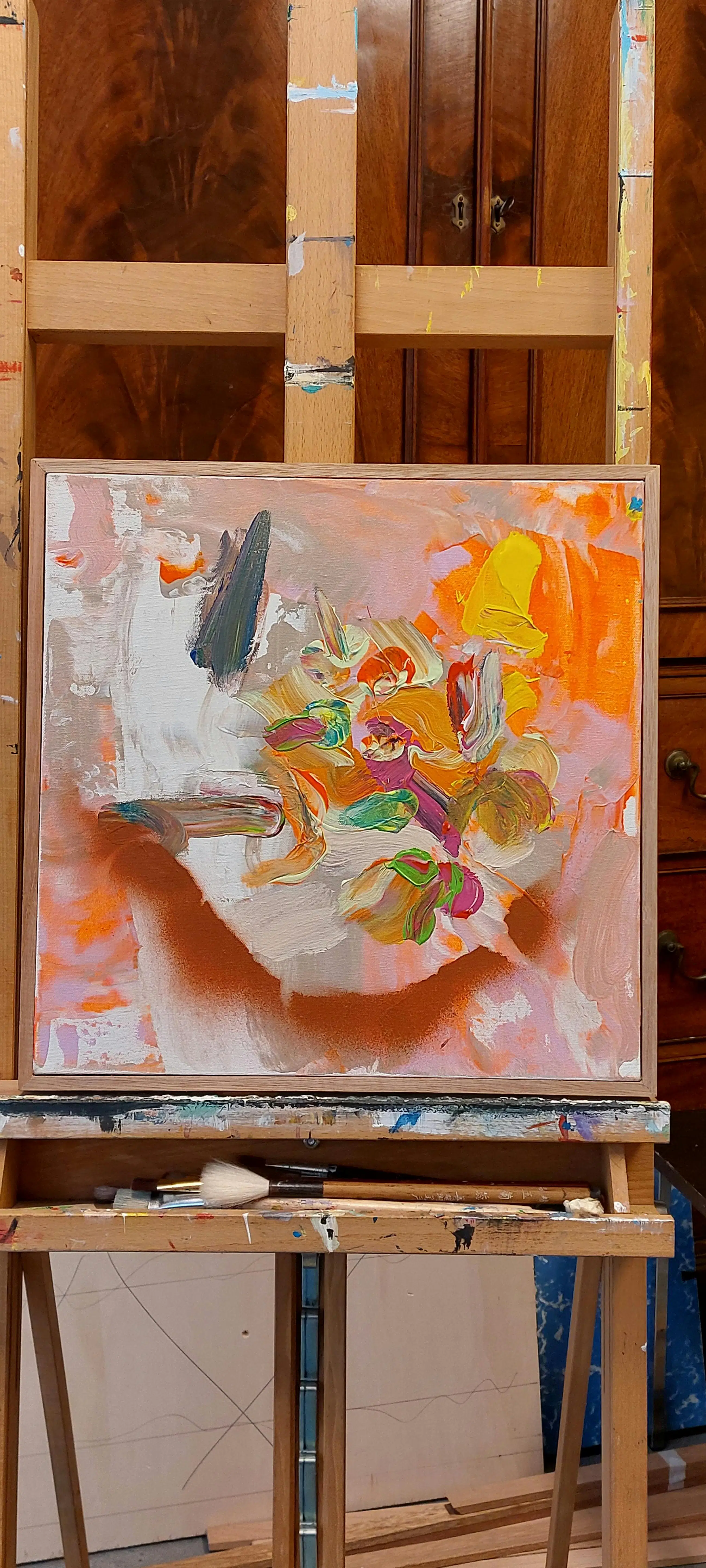 A collaboration with friend and colleague John Cees Smit has resulted in a series of colorful, lyrical abstract works. Framed in a beautiful hardwood frame. A beautiful addition to any wall.