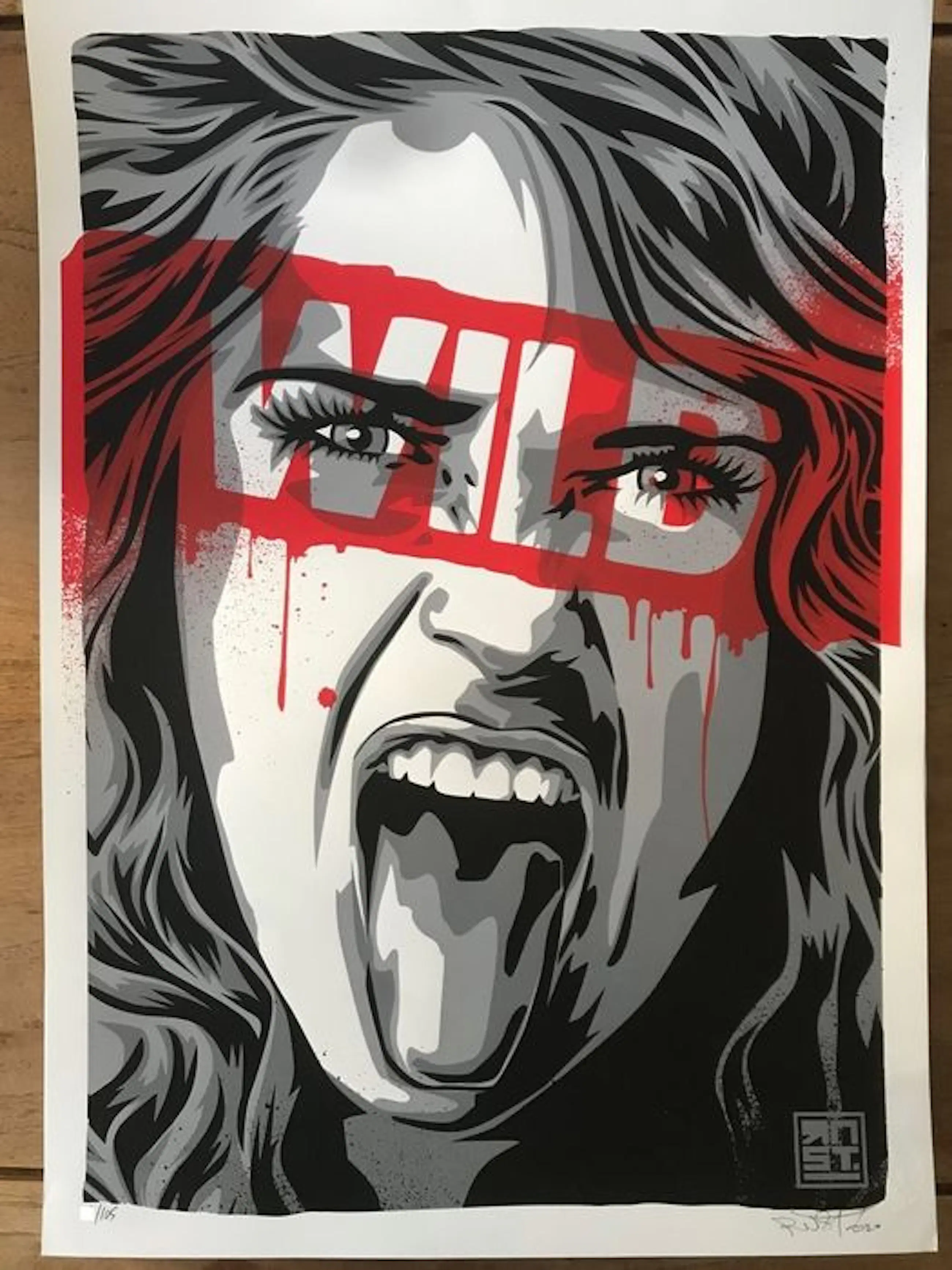 RNST, born in 1972, is a French street artist and graffiti artist. Since the 90s, he has been experimenting with canvas. With his friend Cynik, he conquered the streets to express his committed art. He uses all kinds of techniques: graffiti, posters, collages and stencils. Influenced by rock music, his artistic style is a mix of provocation and romanticism. To create his work, the artist draws inspiration from current events. At first glance, his creations seem to have no connection, but in reality, the artist has carefully combined symbols to create a well-founded critique. However, RNST does not want to give us the key, because he wants the viewer to ask questions and come up with his own analysis. In this sense, his support is in line with his themes, since his works are no longer his own and are public property. In the 2000s, RNST withdrew from the street to invest even more in art from 2009 onwards. In addition, the artist also creates works on canvas and other recycled media.