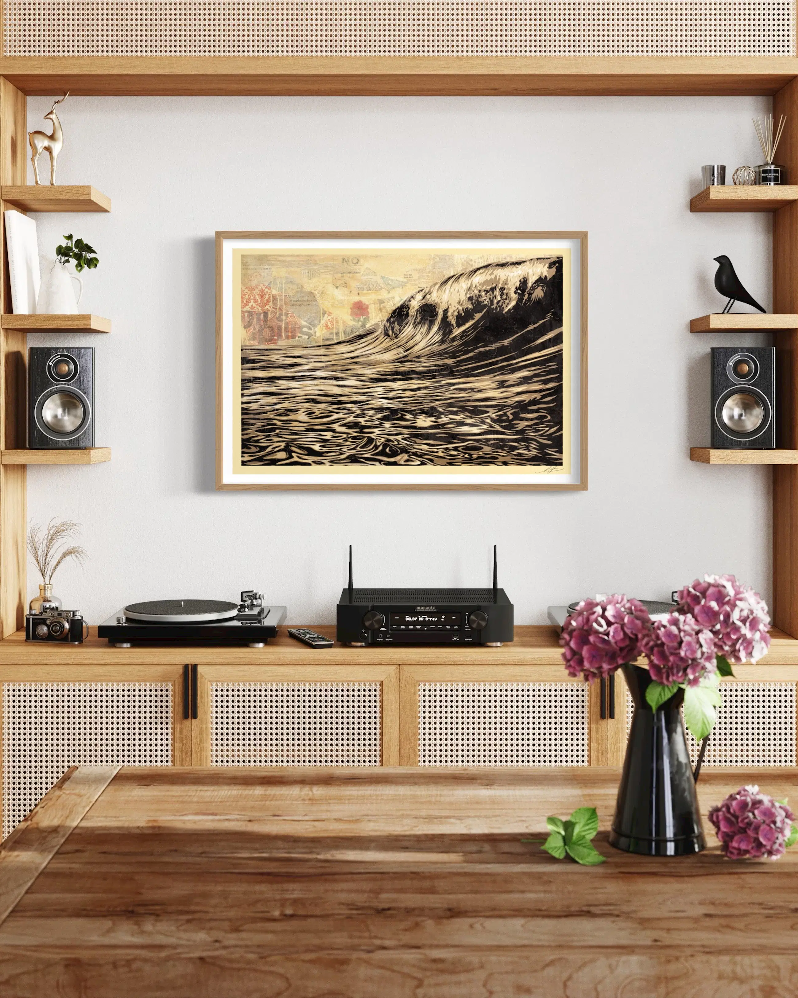 I first illustrated the Dark Wave piece in 2010 as a response to the BP spill in the Gulf of Mexico. I made some fine art pieces of the image that I liked even more than the screen prints and decided I’d like to release an offset of the fine art version. I am releasing this both because I like the image, and because unfortunately, the environmental hazards of off-shore drilling are just as relevant today as they were in 2010…especially with the relaxed regulations under the new administration. I enjoy doing illustrations of water with its hypnotic ripples and reflections. There’s oil in this water, which mixes ok in an illustration, but not so well in real life. I want future generations to inhabit a livable planet. – Shepard
