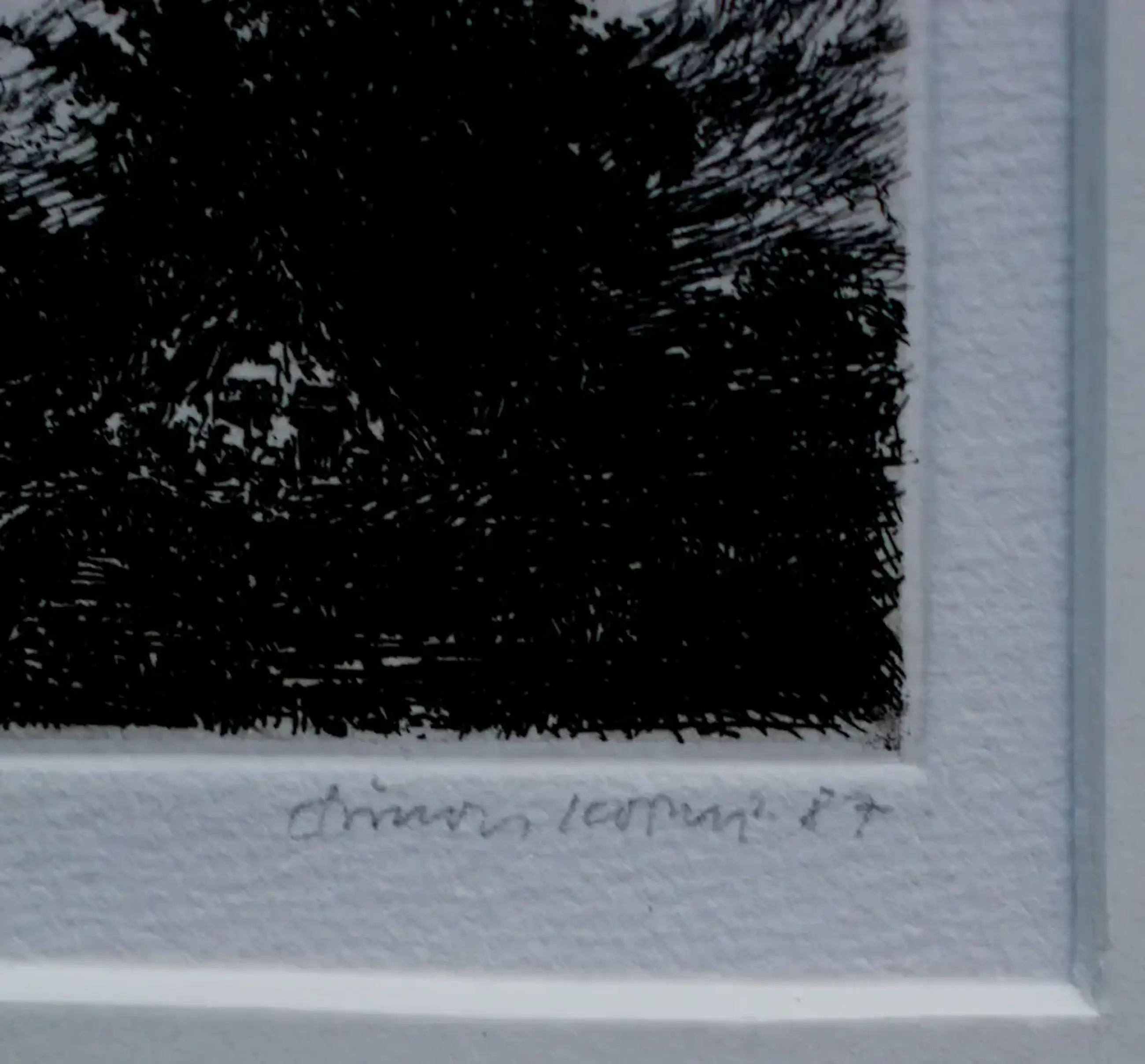 Etching by Simon Koene. Year: 1987. Depicting a stormy landscape. Number: 8/100. Dimensions including mount: H50 x W40cm. Dimensions of the image: H5.5 x W6.5cm.
