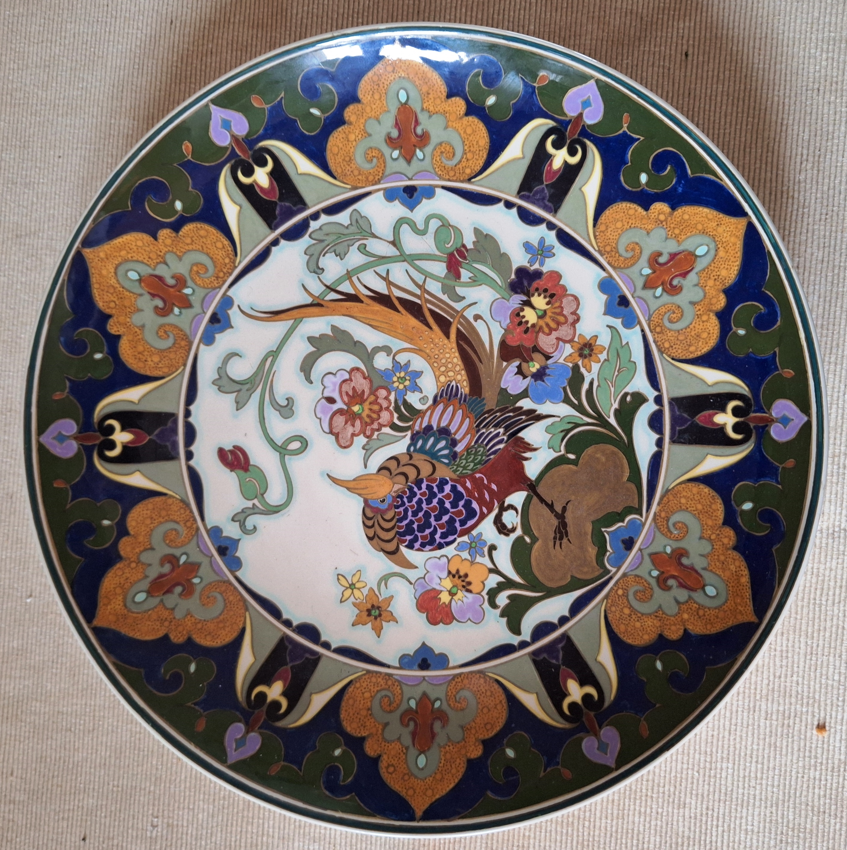 Dish with exotic bird (type of pheasant), tile and faience factory Amphora Holland (Oegstgeest), with the factory mark of Amphora and the decorator's mark of the pottery painter Gerrit (Gerardus) Visser. Dating ca. 1910-1920.