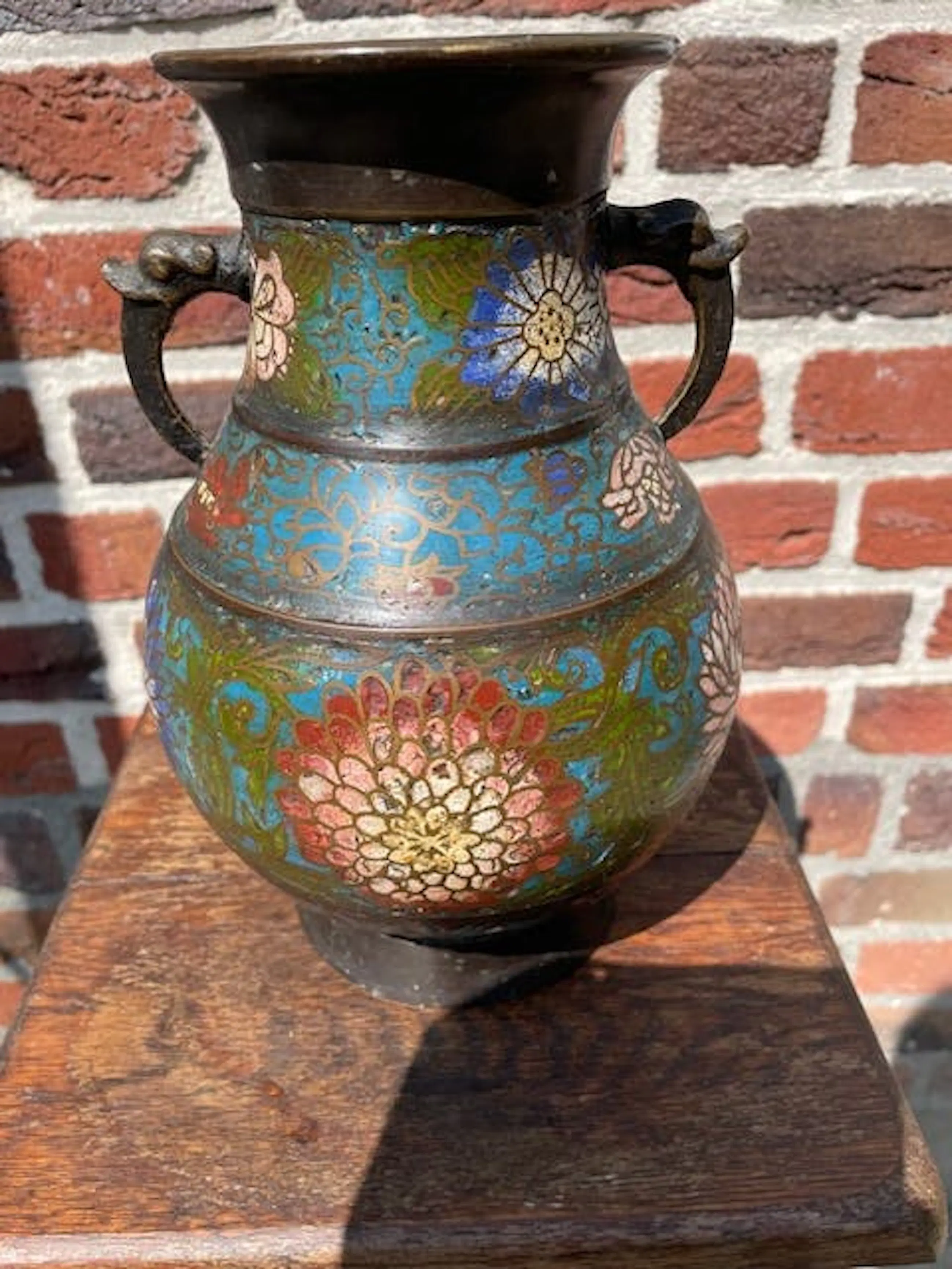 Metal vase, estimated time period: 1900-1930. Japanese, cloisonné technique. Beautiful color scheme.
