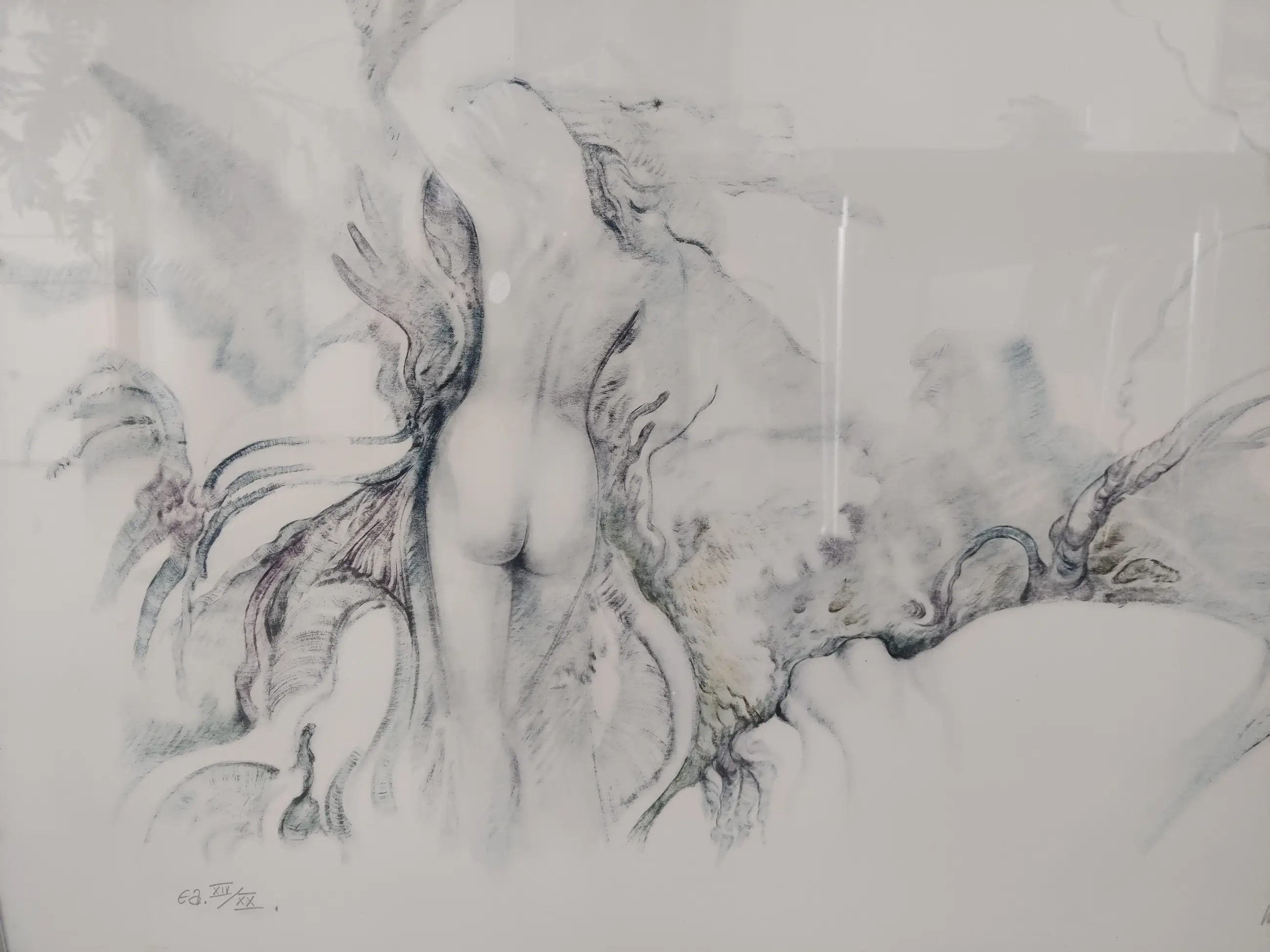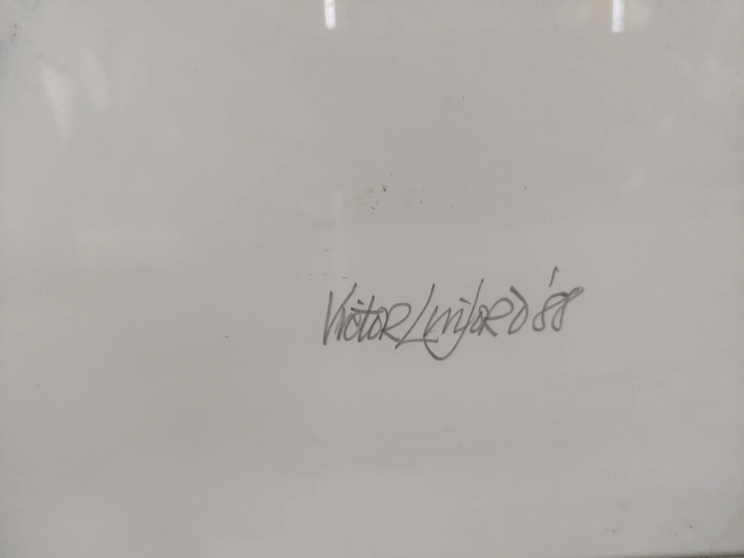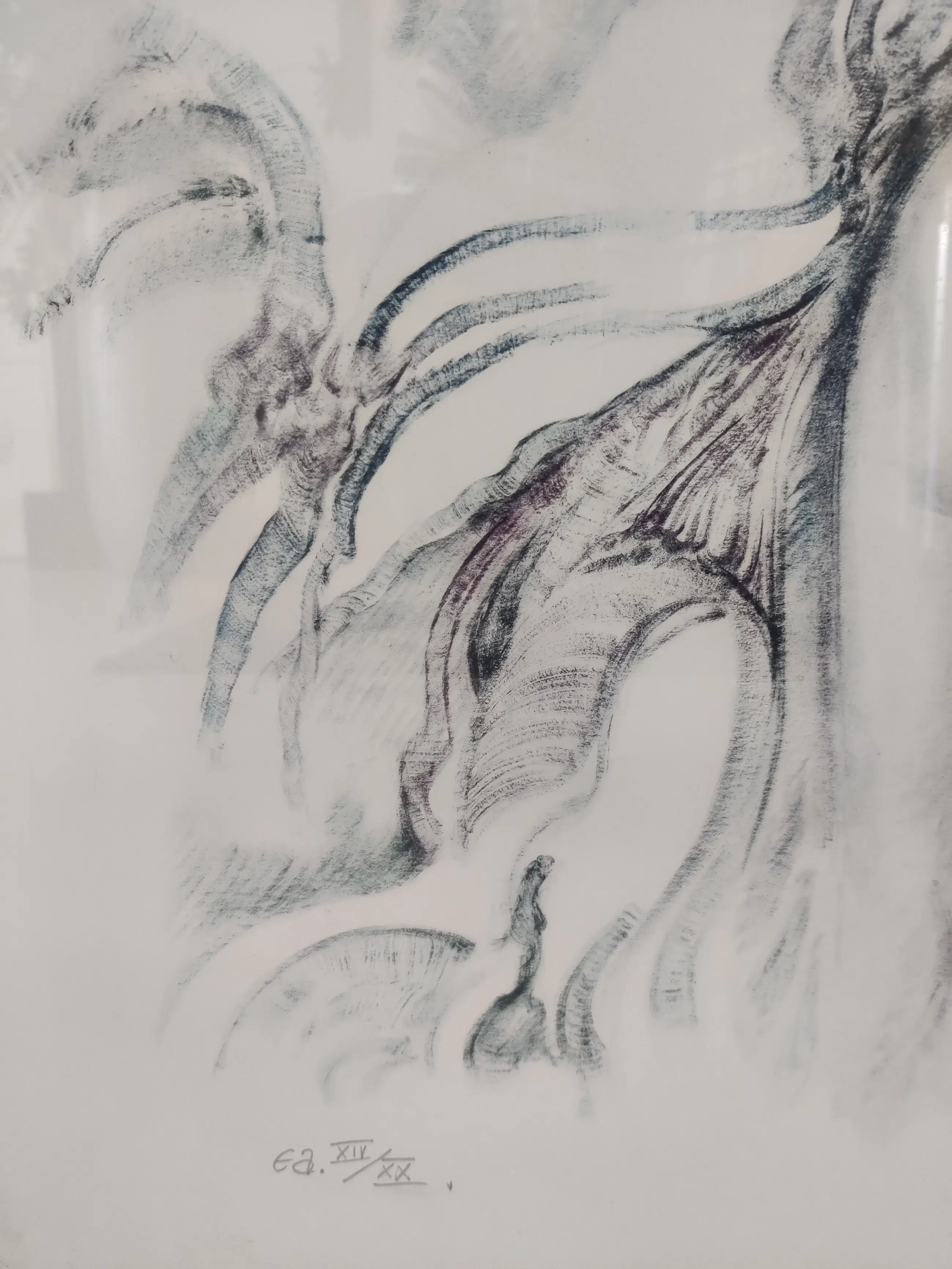 Beautiful work. Very good condition. Light blue/light gray/white. metal frame