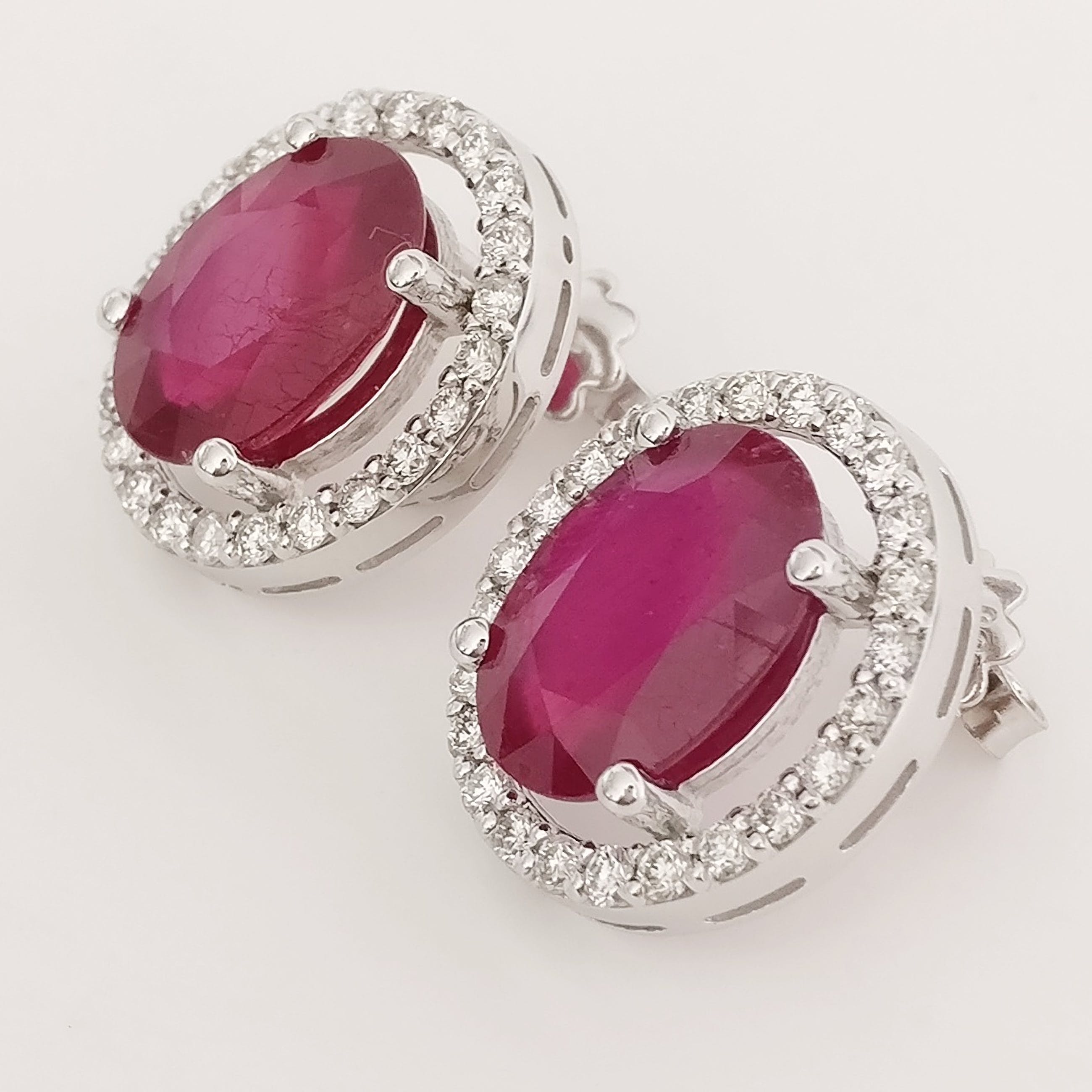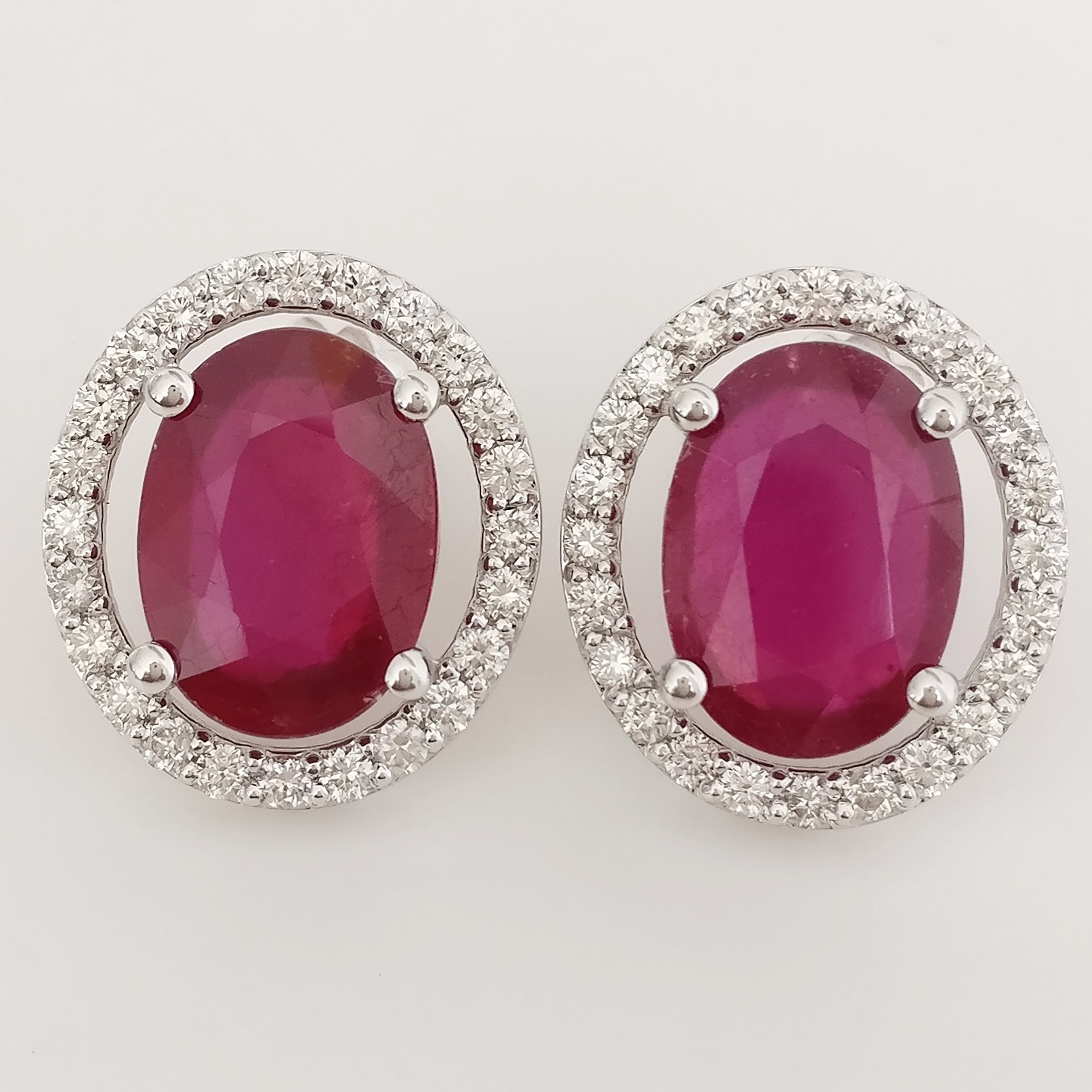 - Matériau : or blanc 18 carats - Poids brut : 11,19 grammes - Dimensions : 19x16x16 mm Pierre principale : Rubis - Forme : Ovale Coupe Mixte - Poids total en carats : 11,14 cts. -Nombre de pierres : 2 - Poids moyen : 5,57 cts. chaque - Catégorie de couleur : Rouge violacé - Traitement : Couramment traité Pierres latérales : Diamant - Forme : taille brillant rond - Poids total en carats : 1,36 cts. - Nombre de pierres : 48 - Poids moyen : 0,028 cts. chaque - Catégorie de couleur : F - Degré de clarté : VS-SI Fabriqué en Belgique