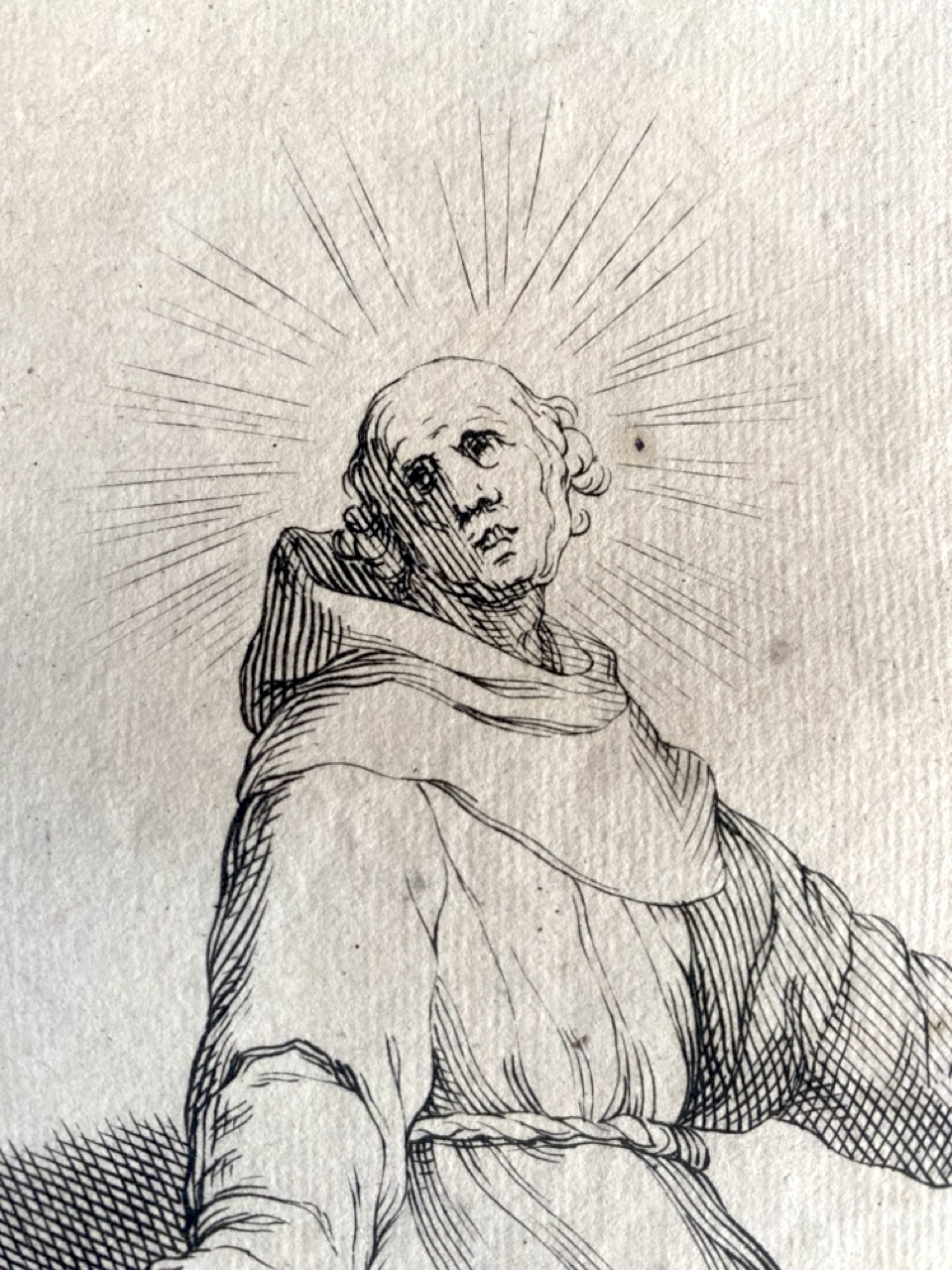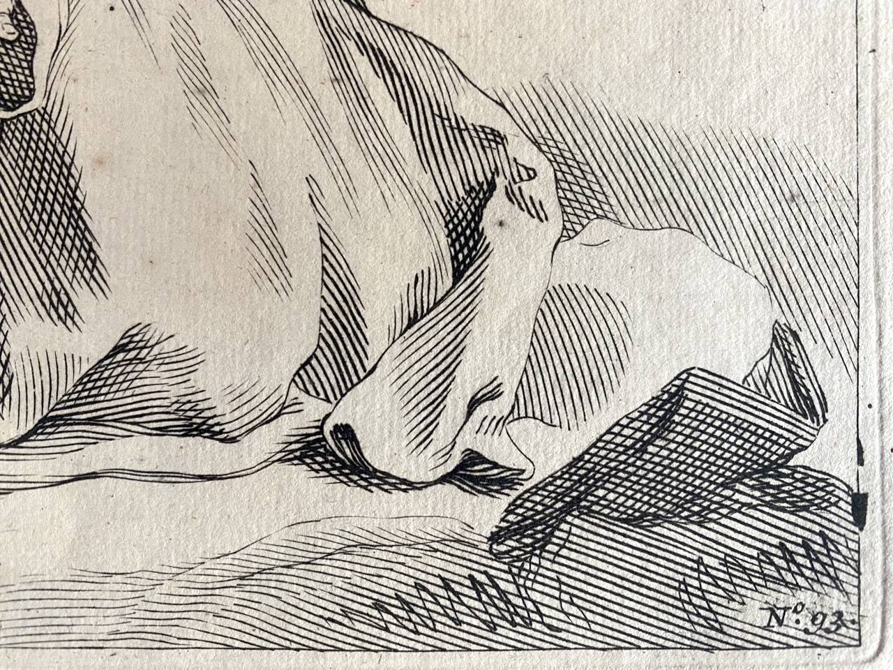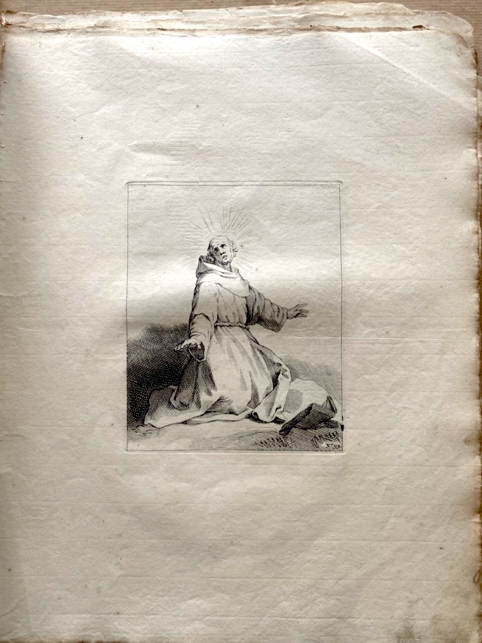 Cette gravure sur cuivre de « Frère agenouillé » est réalisée sur papier vergé filigrané. La troisième partie est tirée de son ouvrage « Fondamenten der Teecken-Konst » (Fondements de l'art de la tétée).