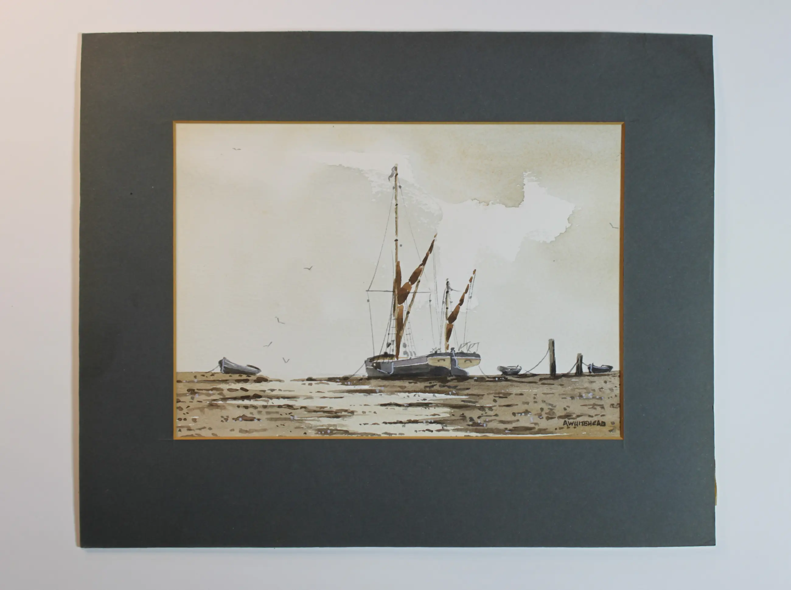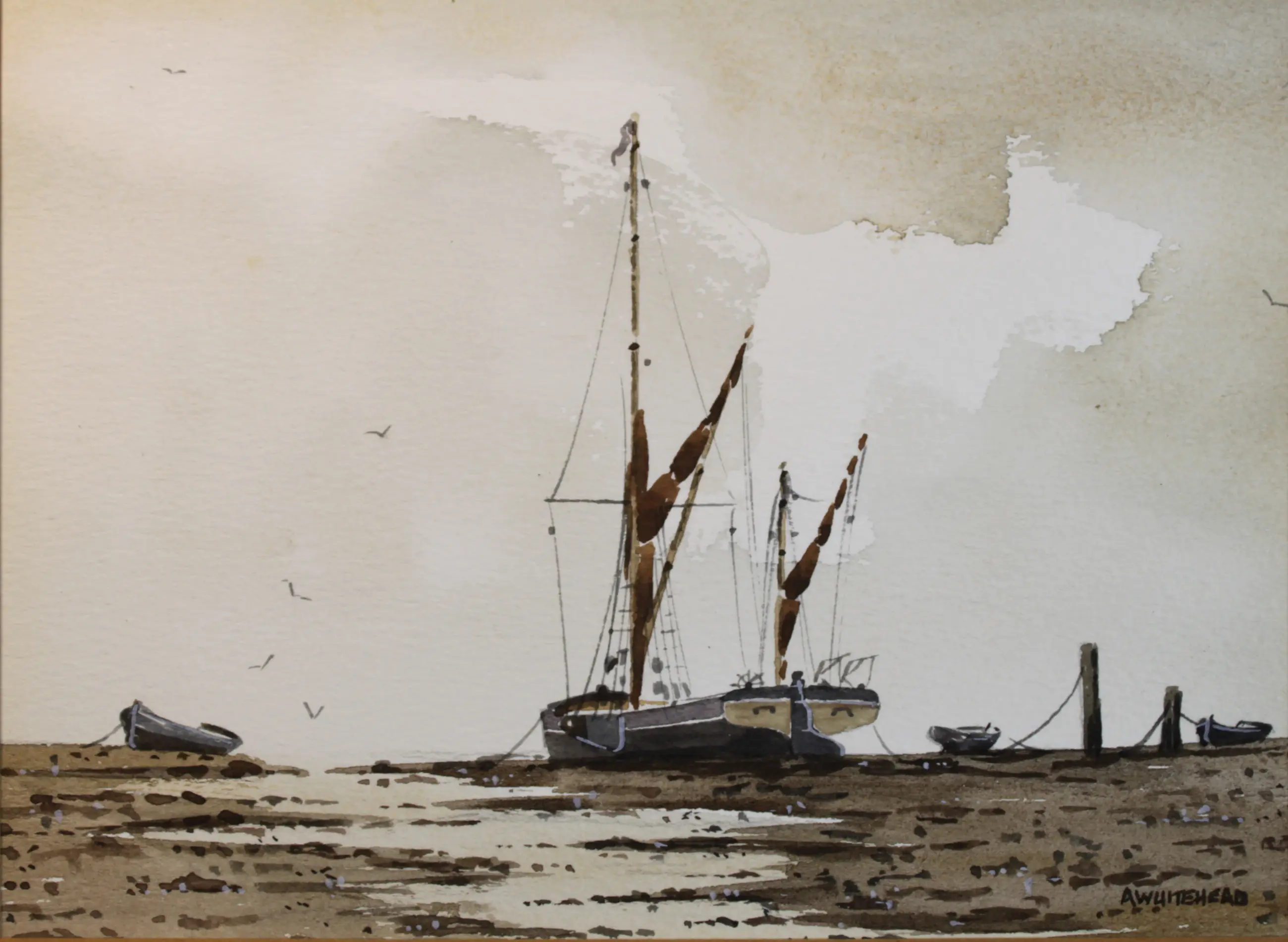 Deux-mâts et quelques bateaux à rames à marée basse sur le sable,