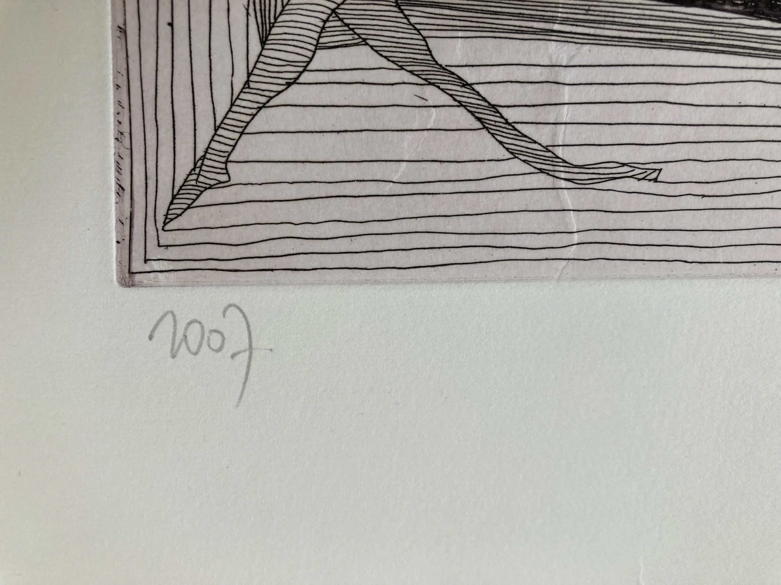 Gravure originale sur papier vergé Zerkall 270 g/m². Imprimé par Kunst- und Radierwerkstatt W. Jesse, Inh. D. u. M. Jäger, Berlin. Monogrammé et daté (2007) au crayon sous l'image par Anne-Mie Van Kerkhoven (AMVK).