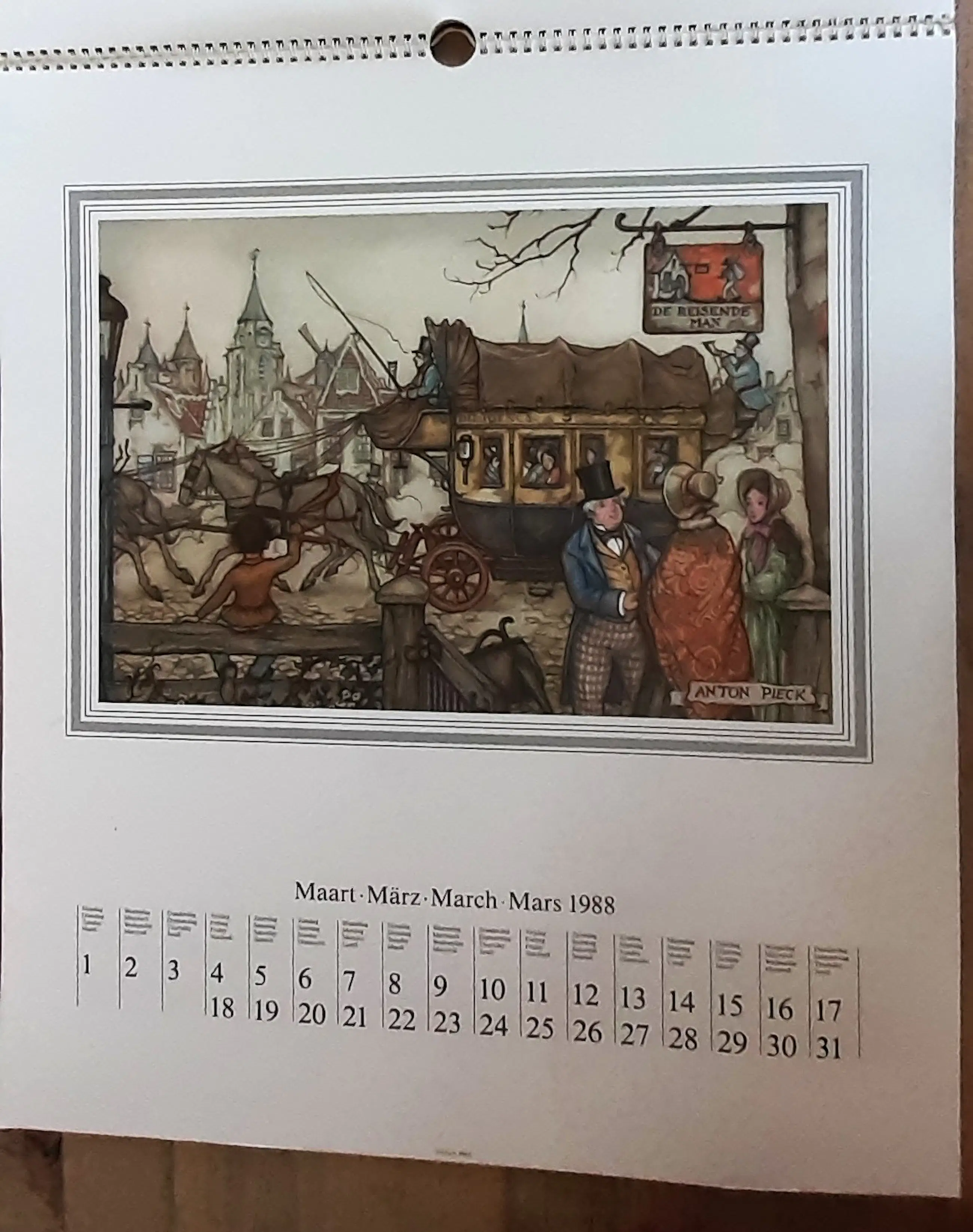 Premier calendrier : Anton Pieck collabore pour la première fois à un calendrier en 1913, à savoir un calendrier commémoratif pour le centenaire de l'indépendance des Pays-Bas, pour lequel il conçoit les ornements. Dessins en couleurs : À partir de 1950, Anton Pieck a commencé à réaliser des dessins en couleurs spécialement pour l'édition du calendrier annuel, qui ont enrichi l'ouvrage et sont encore appréciés aujourd'hui.