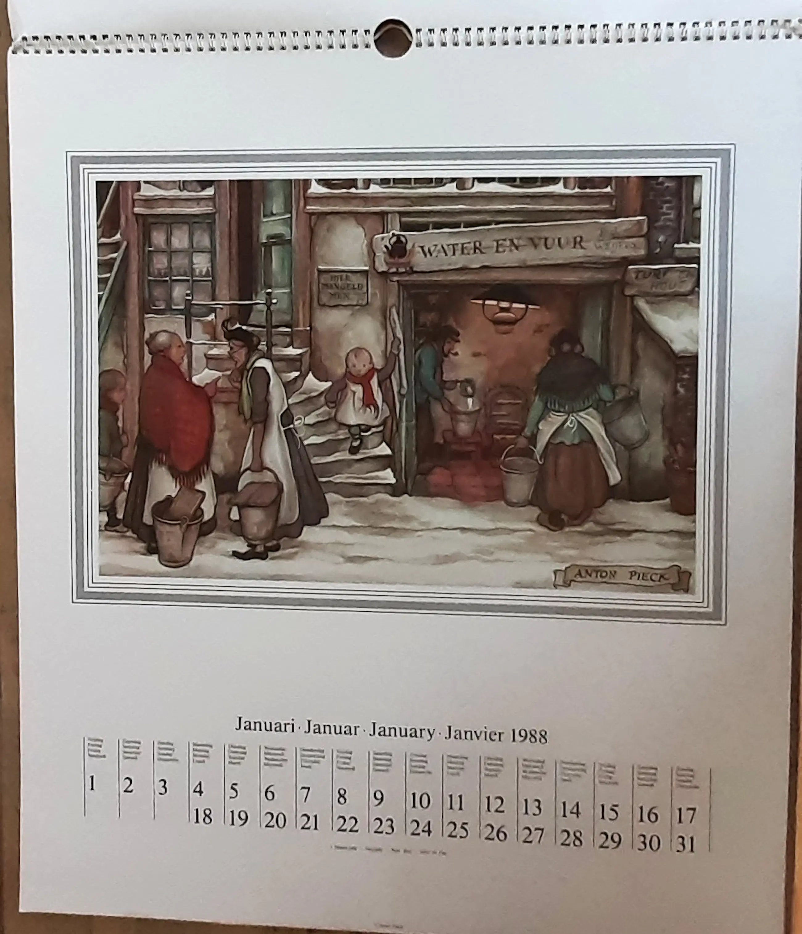 La particularité de ce calendrier est le moment........1988 Anton Pieck est décédé le 24 novembre 1987. Après sa retraite en 1960, Pieck a consacré plus de temps aux calendriers annuels, et il est logique que cette tradition se soit poursuivie après sa mort en 1987. La particularité de ce calendrier original de 1988 est qu'il est le premier calendrier après sa mort, mais aussi le dernier dont il avait encore le contrôle et les droits d'auteur pour la publication elle-même ! Les droits d'auteur sur l'œuvre d'Anton Pieck appartiennent désormais à ses héritiers ou aux organismes qui gèrent son œuvre, et non directement à l'artiste lui-même, puisqu'il est décédé en 1987.