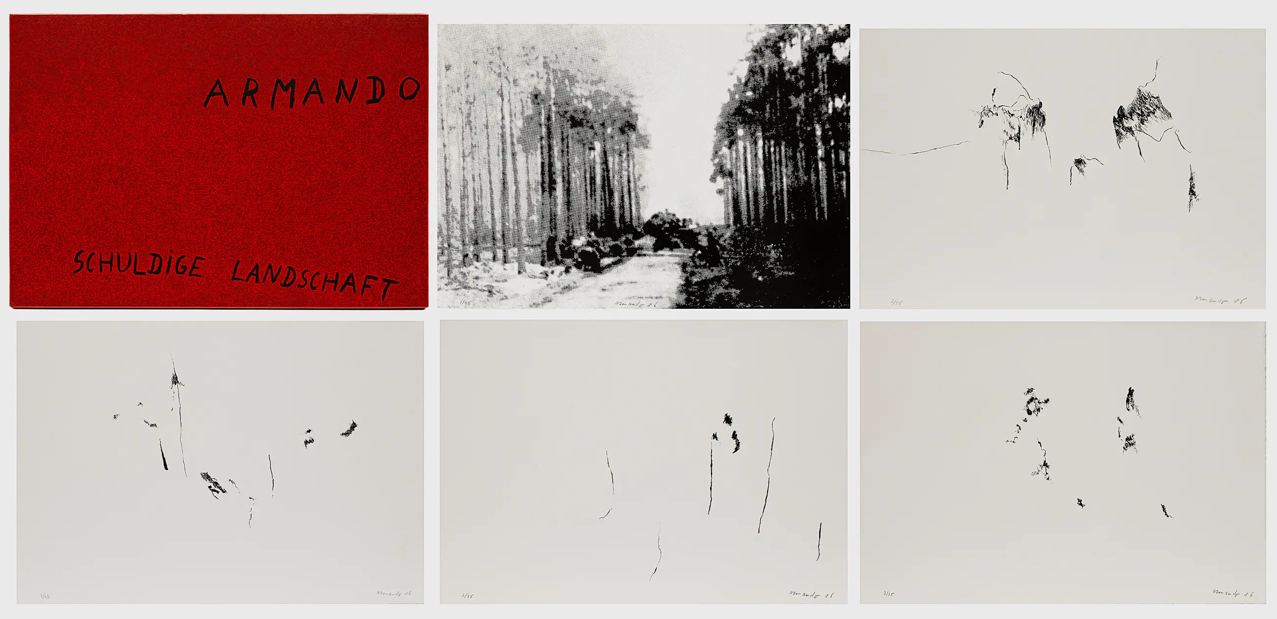 - Portfolio complet "Schuldige Landschaft" réalisé par Armando en 1986, composé de 5 lithographies tranquilles sur papier Rives fait main, édité par la galerie Bébert Rotterdam en 1986 dans une édition très limitée de seulement 35 exemplaires.