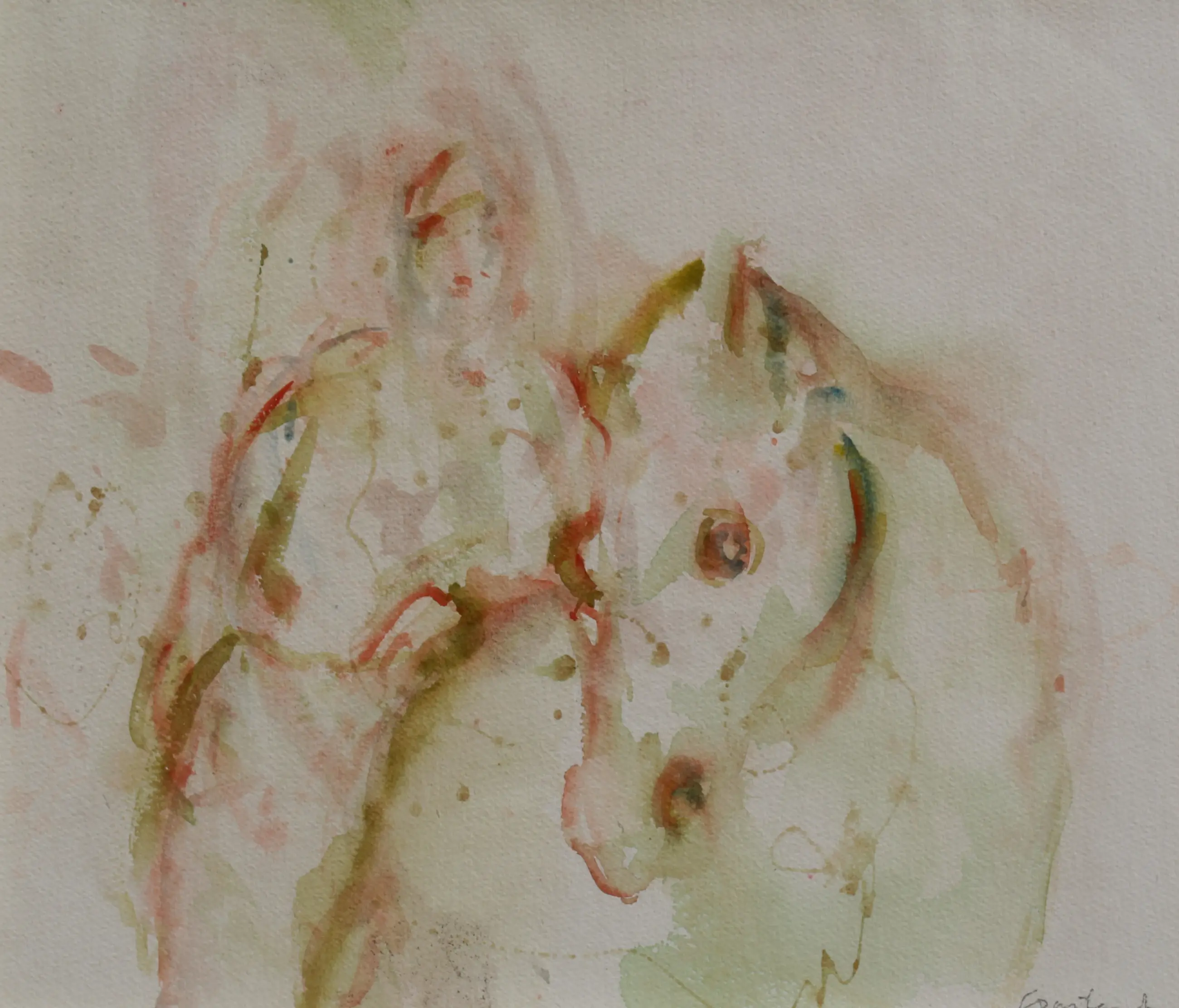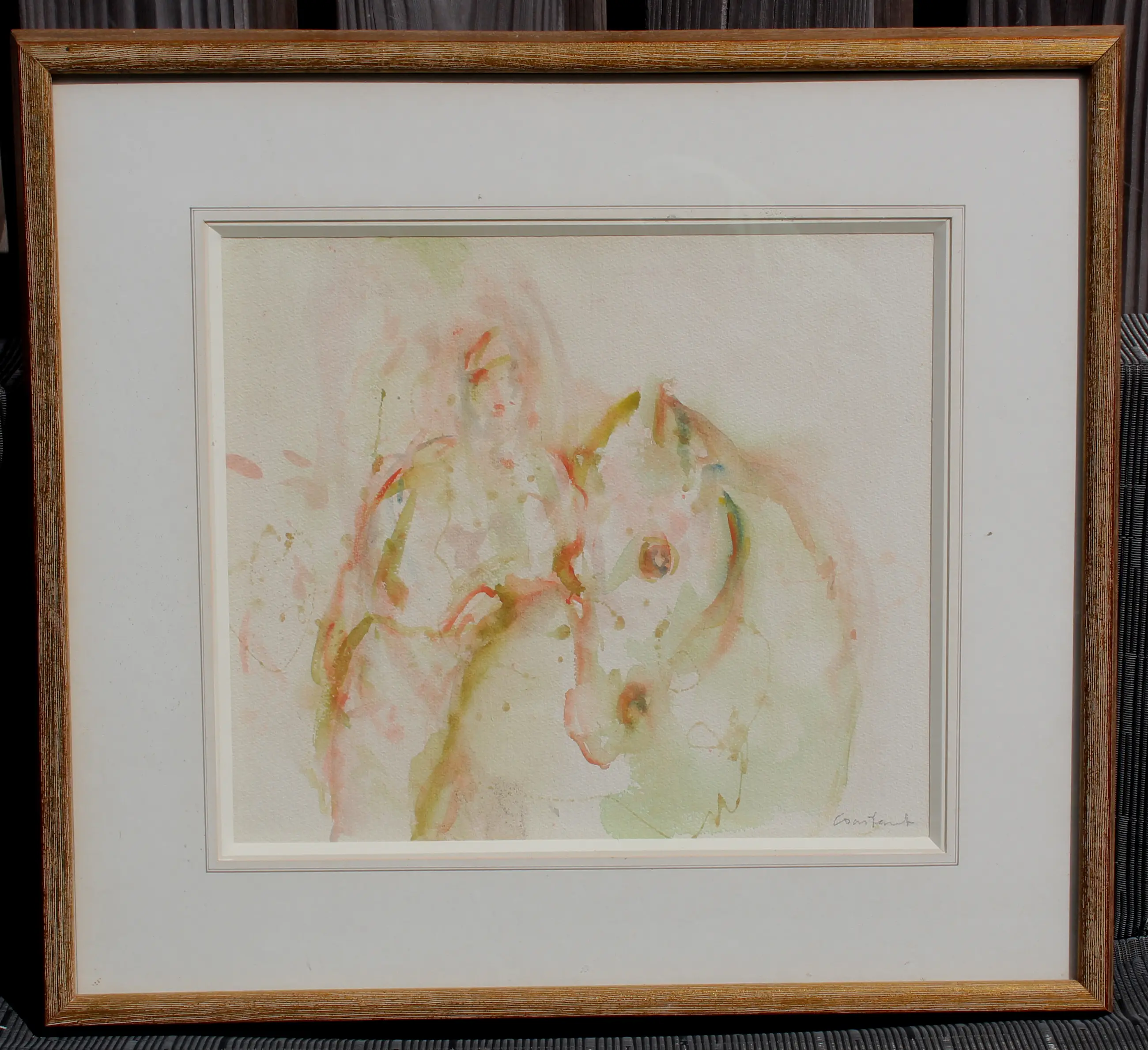 Aquarelle encadrée de Constant de 1987. Représentant une cavalière au repos. L'œuvre est également disponible sur le site web de la Fondation Constant : https://stichtingconstant.nl/catalogue/work/femme-et-cheval