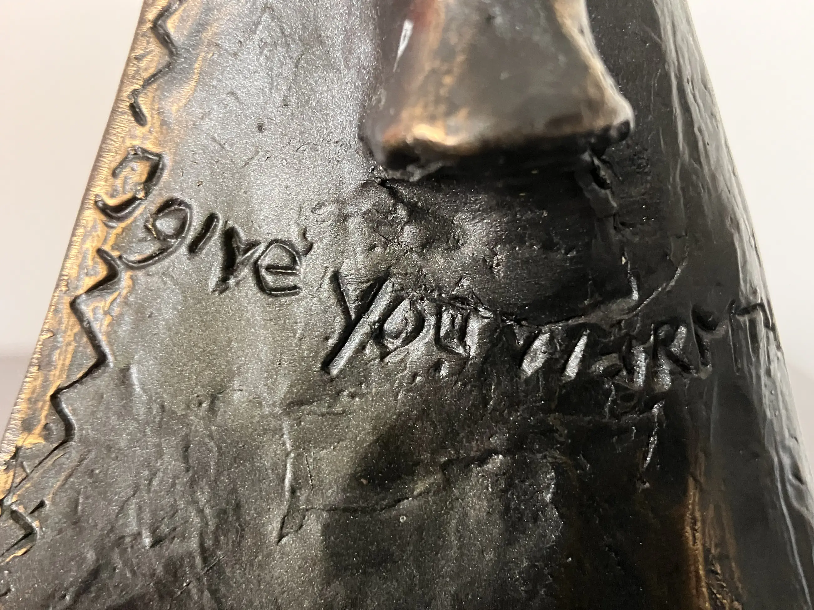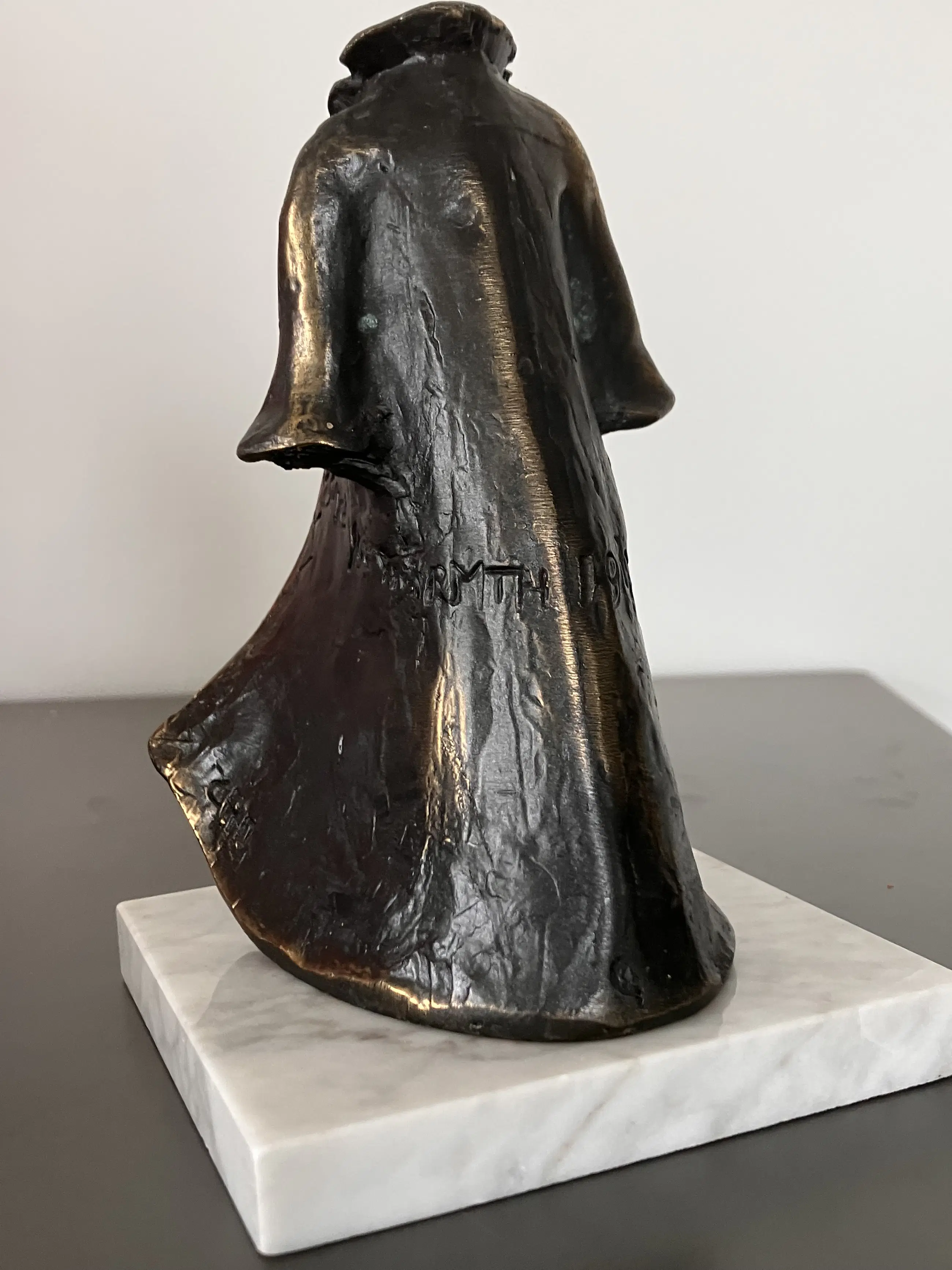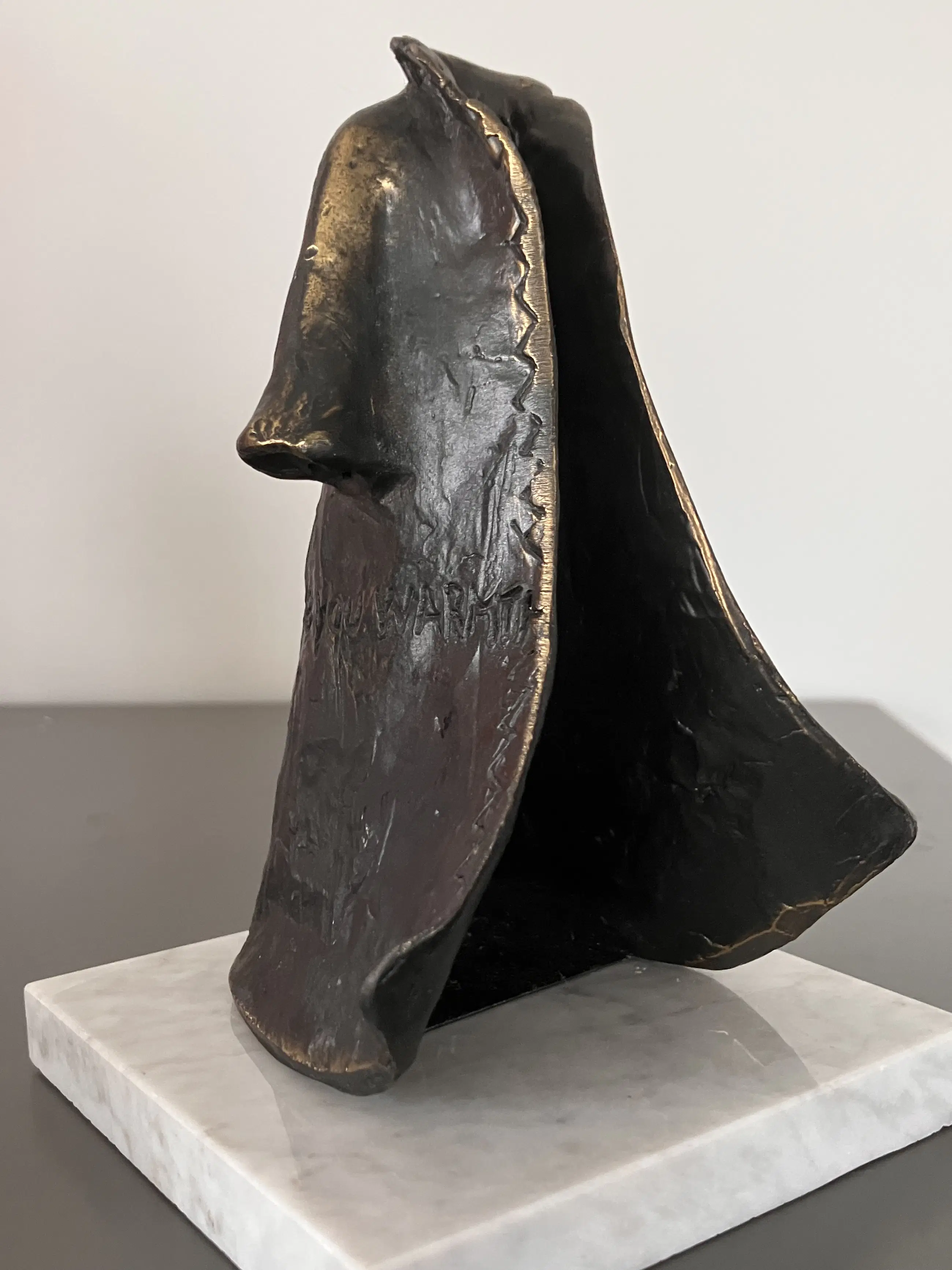 Sur un plateau en pierre naturelle blanche, un long manteau invitant avec le texte « Je te donne de la chaleur »