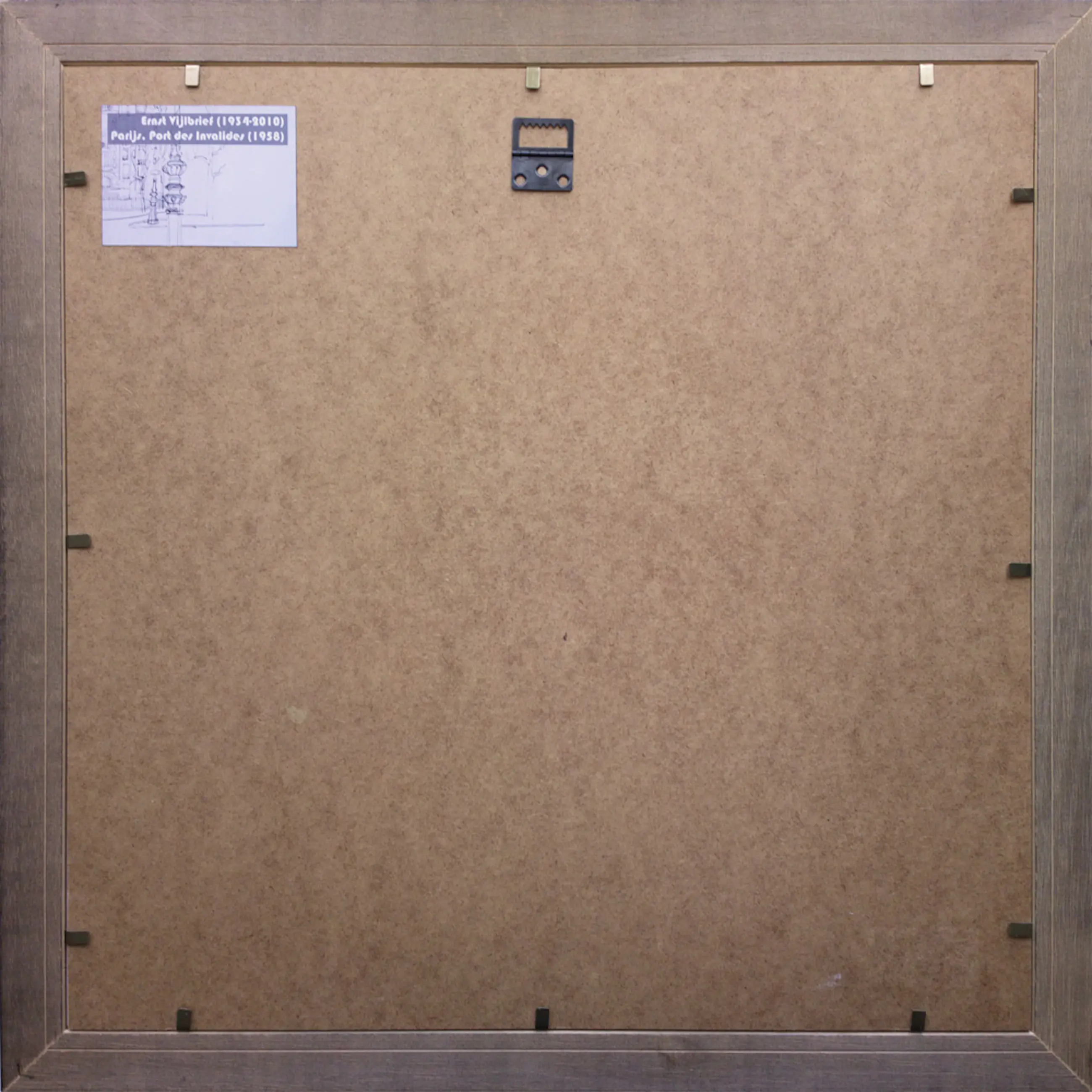 Dessin à l'encre d'Ernst Vijlbrief représentant le Port des Invalides à Paris. Ce dessin date de 1958. L'œuvre est signée « Ernst » en bas à droite et datée « 58 ».