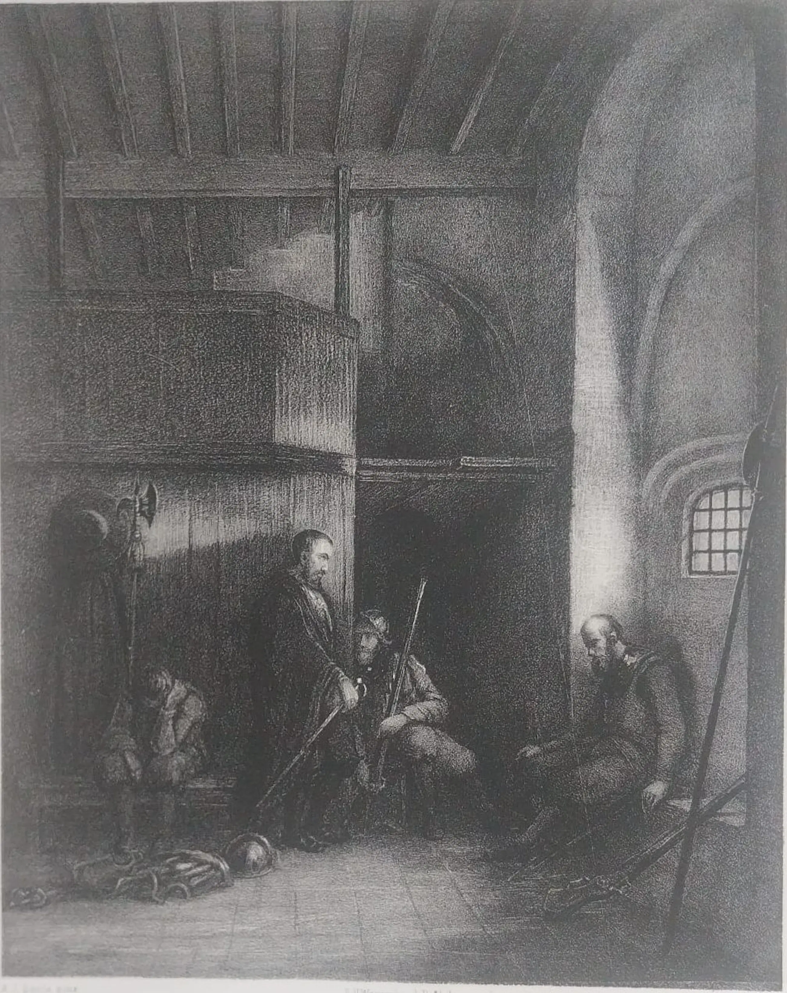 Lithographie d'une scène historique ou militaire. les inscriptions indiquent : AJ Elhne Pinx Childer FH Weisenbruch lithographe K.St.VCW, imprimeur ou éditeur Mieling
