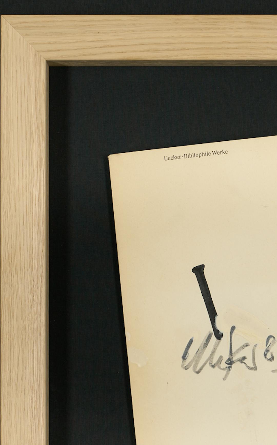 Il s’agit d’un catalogue d’exposition peint, conçu à l’encre et à la peinture blanche, représentant un clou – le motif pour lequel Uecker est célèbre et qui est considéré comme un élément central et récurrent dans son œuvre.
