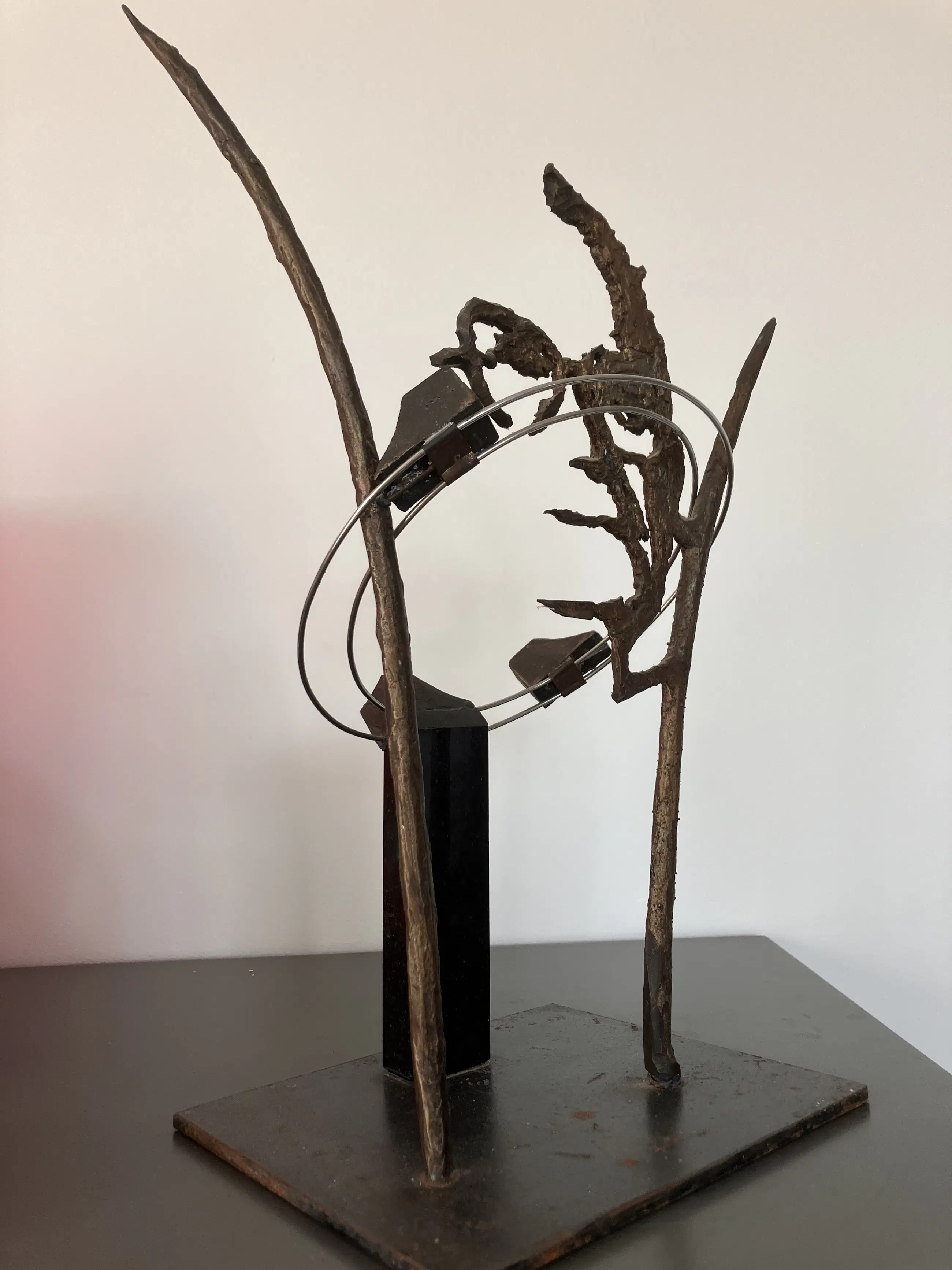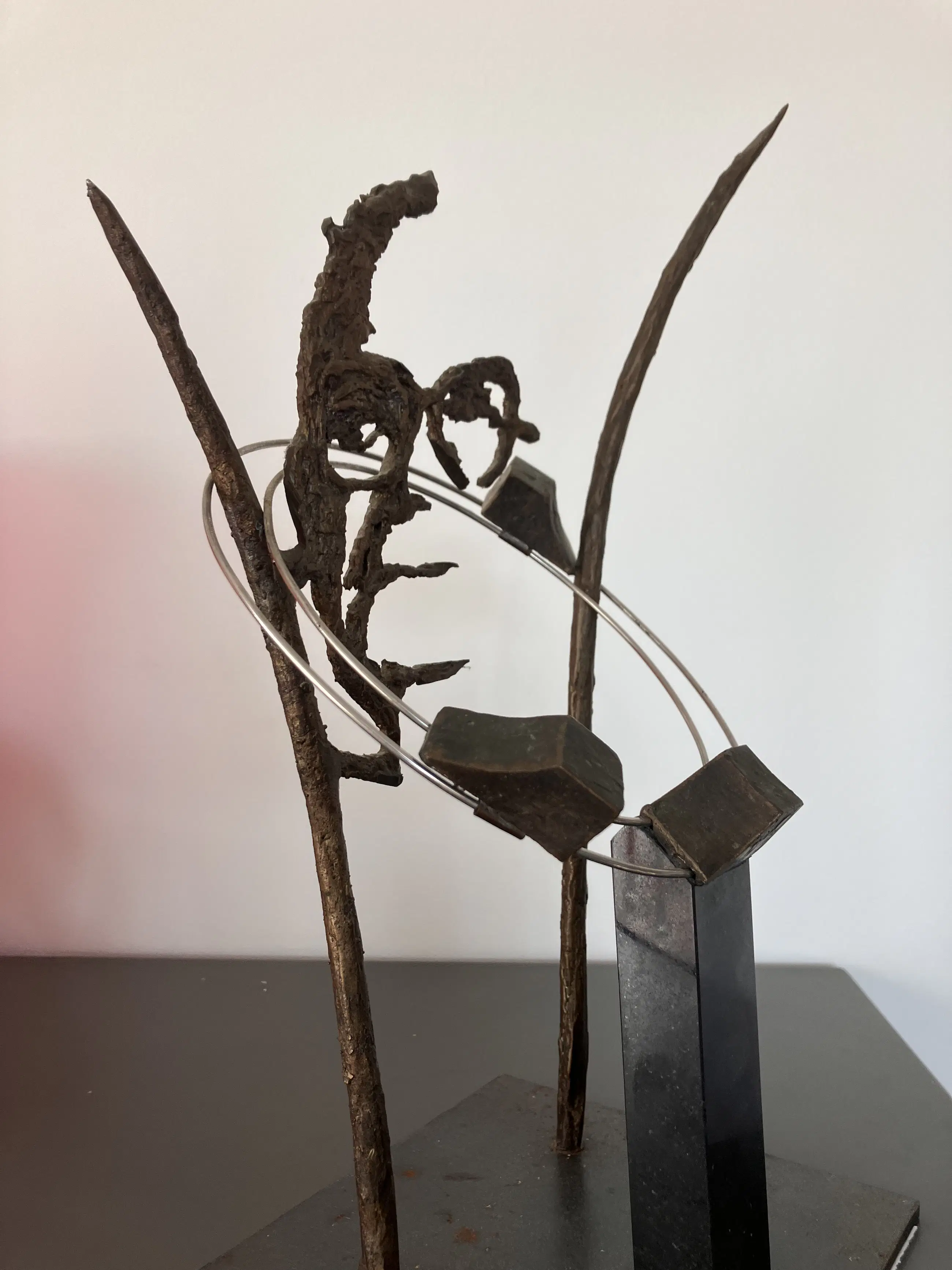 Sur plateau métallique : Colonne en pierre naturelle noire Deux tiges pointues en bronze Trois wagons en bronze ? Sur un rail Le monde est une montagne russe ? Hans Mes a réalisé, entre autres, la statue « Sentinelle » qui se dresse au pont de la forteresse de Bourtange