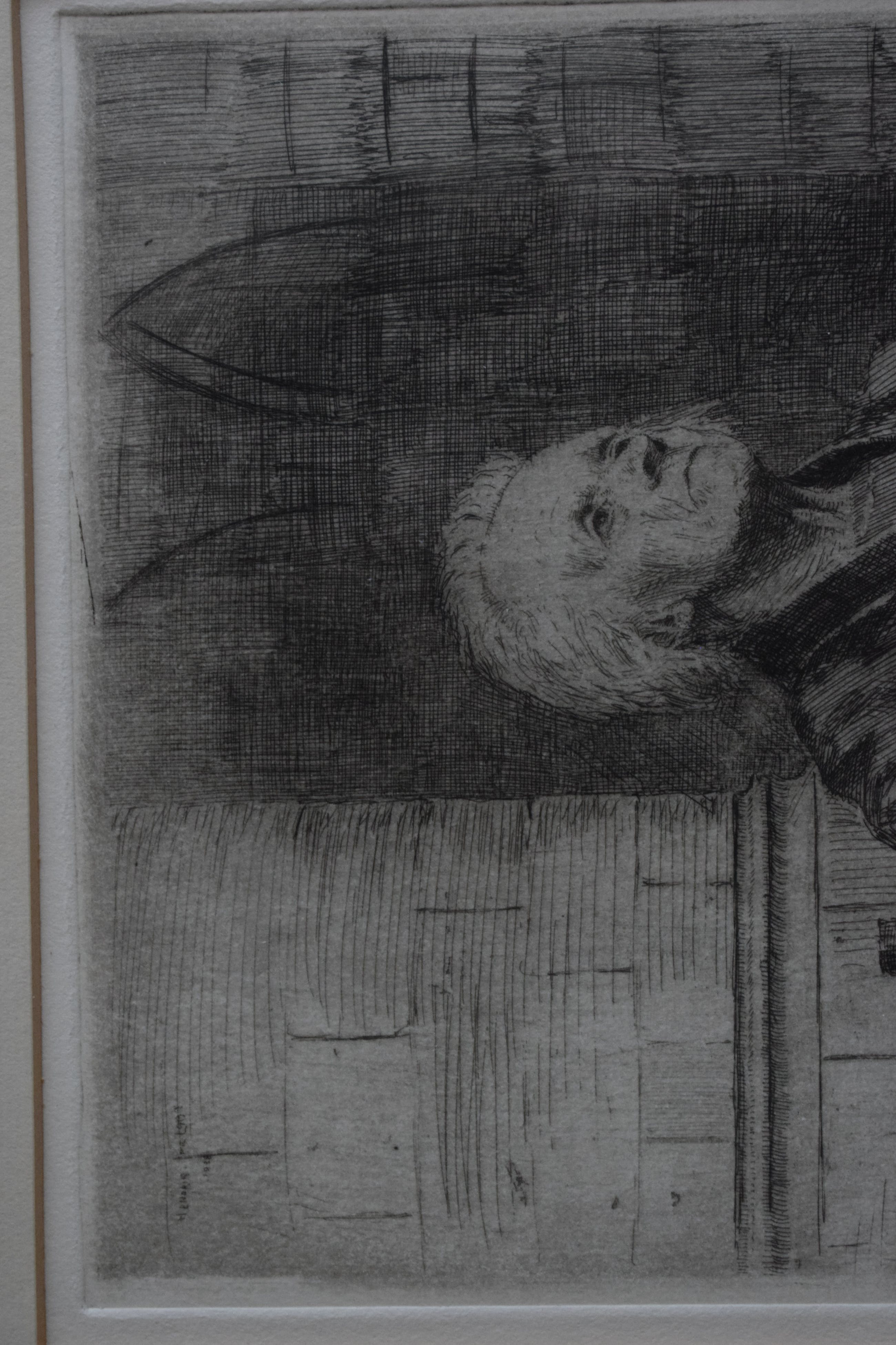 Deze dubbelgesigneerde ets laat het portret zien van een man in gedachten verzonken tijdens een mis in de Sint-Jans's kerk te 's hertogenbosch. Naast hem zijn bijbel of misboek.
