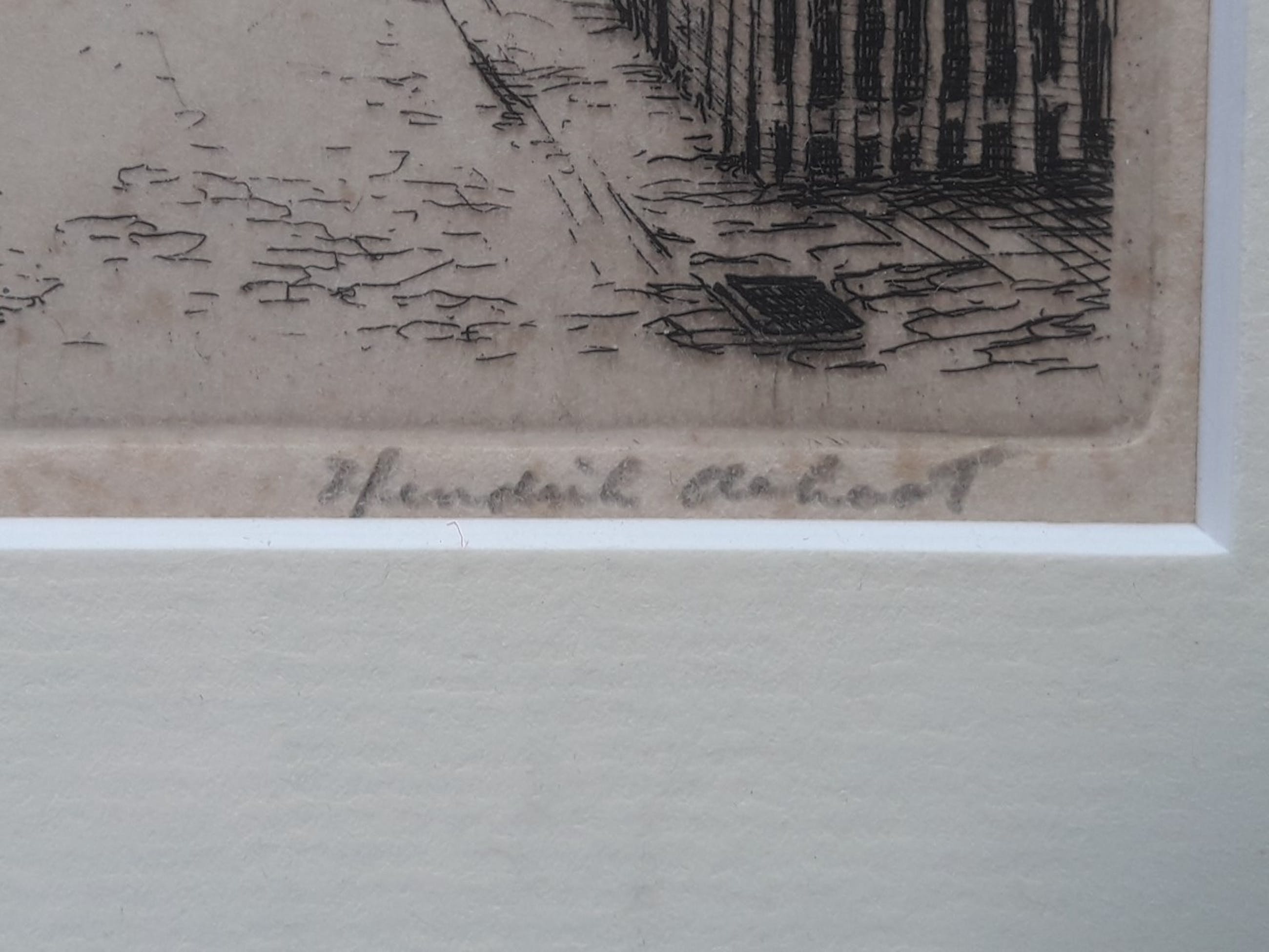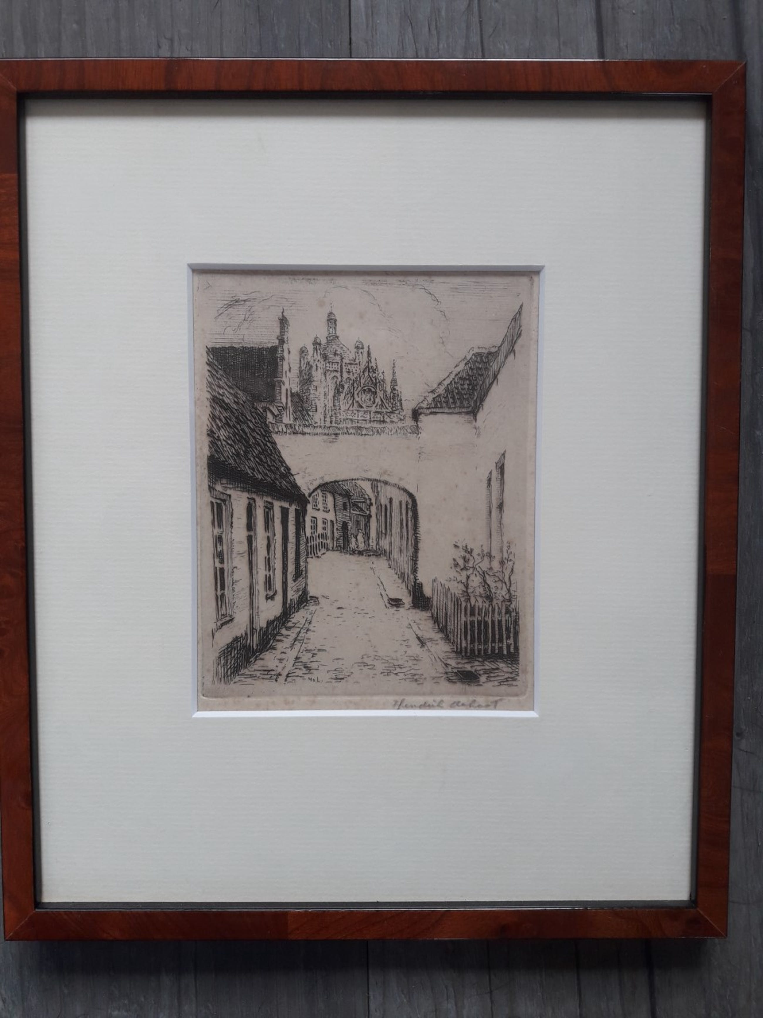Vrij zeldzame ets van Hendrik de Laat, genaamd "in den boerenmouw". Op de achtergrond zie je de Bossche broek in Den Bosch. In bijgaande link over Den Bosch staat informatie over deze ets. http://www.bossche-encyclopedie.nl/straten/in%20den%20boerenmouw.htm Het zal worden verzonden in een op maat gemaakte kist om beschadiging te voorkomen