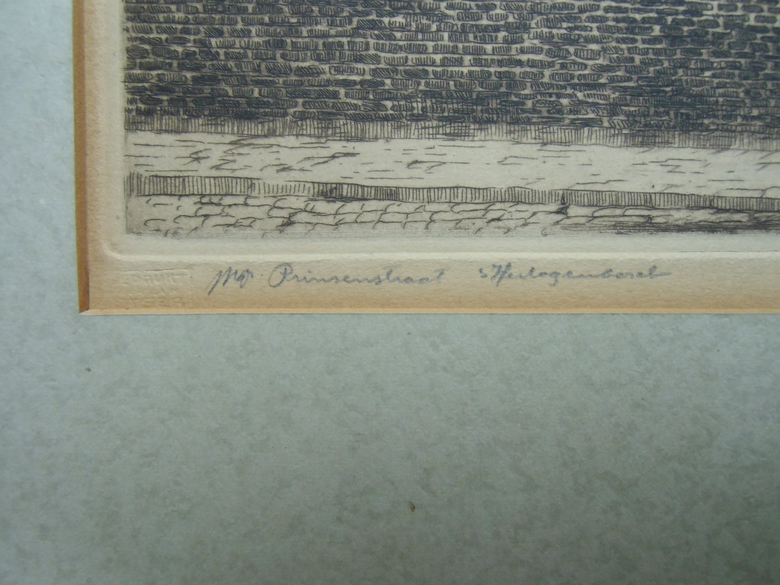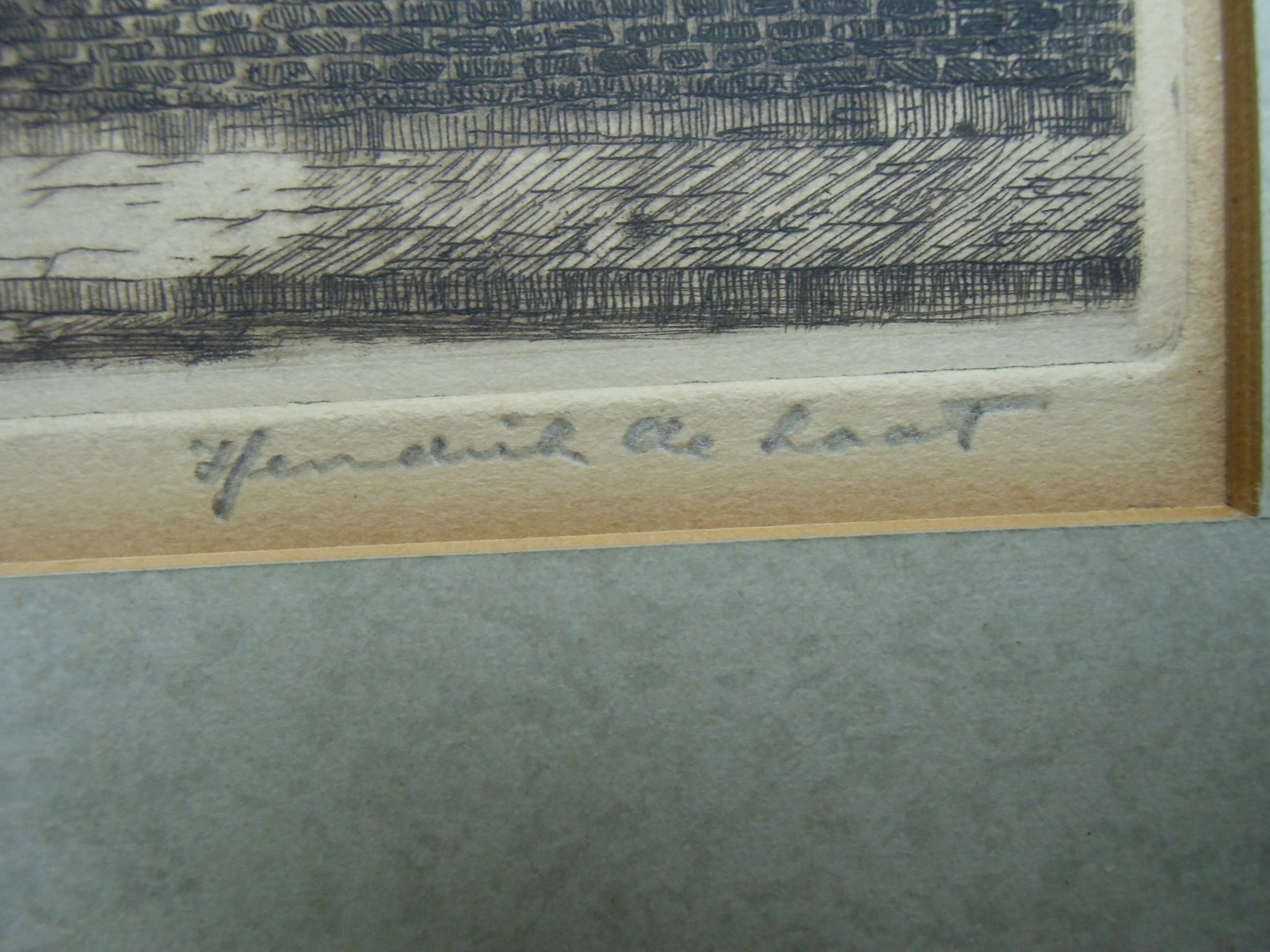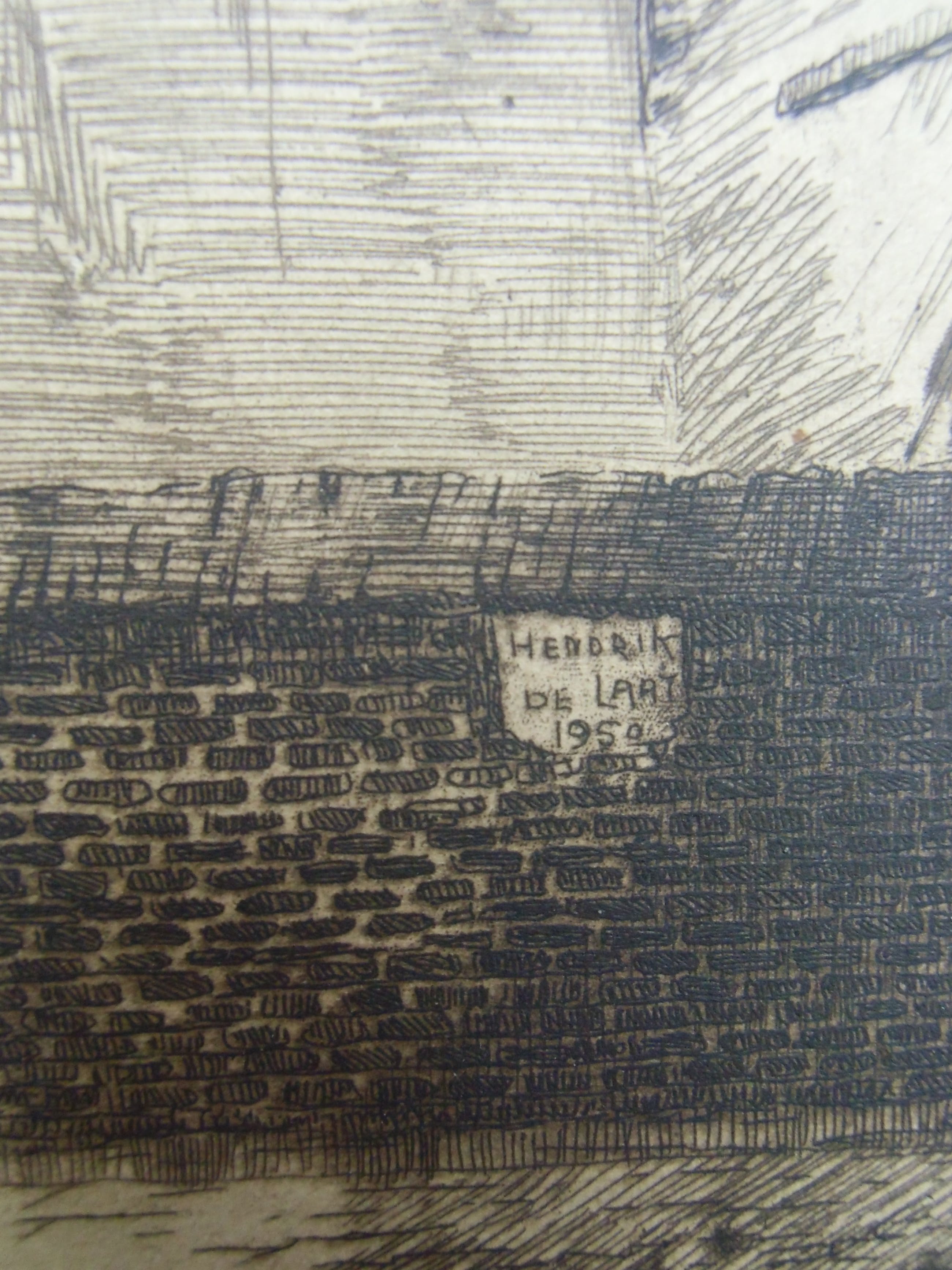 Karakteristieke ets van Hendrik de Laat uit 1950. Gesigneerd en betiteld in potlood. Voorts Hendrik de Laat 1950 in de plaat. Opgenomen in passepartout met achtervel. Oplage-vermelding. Zeer goede staat.