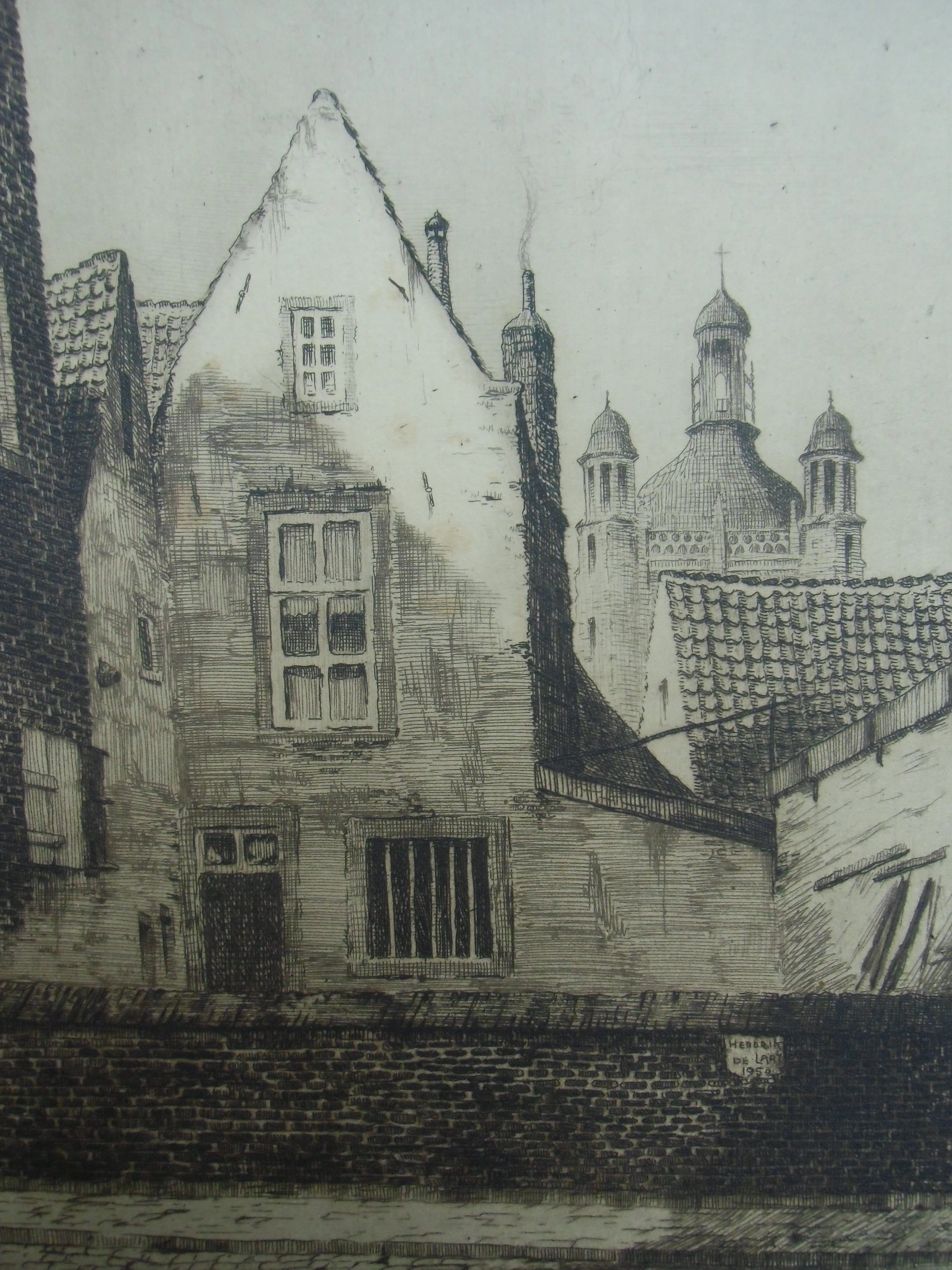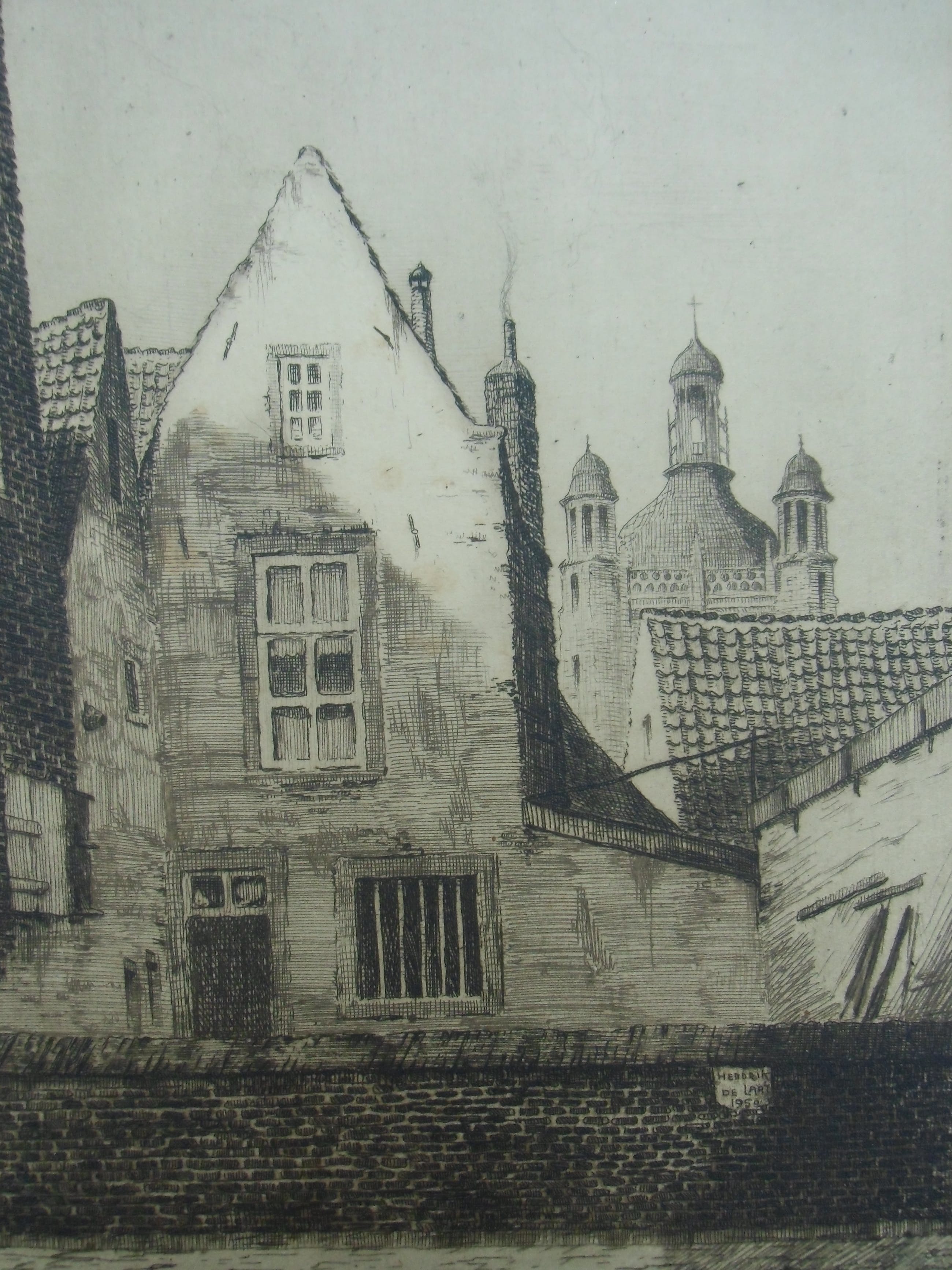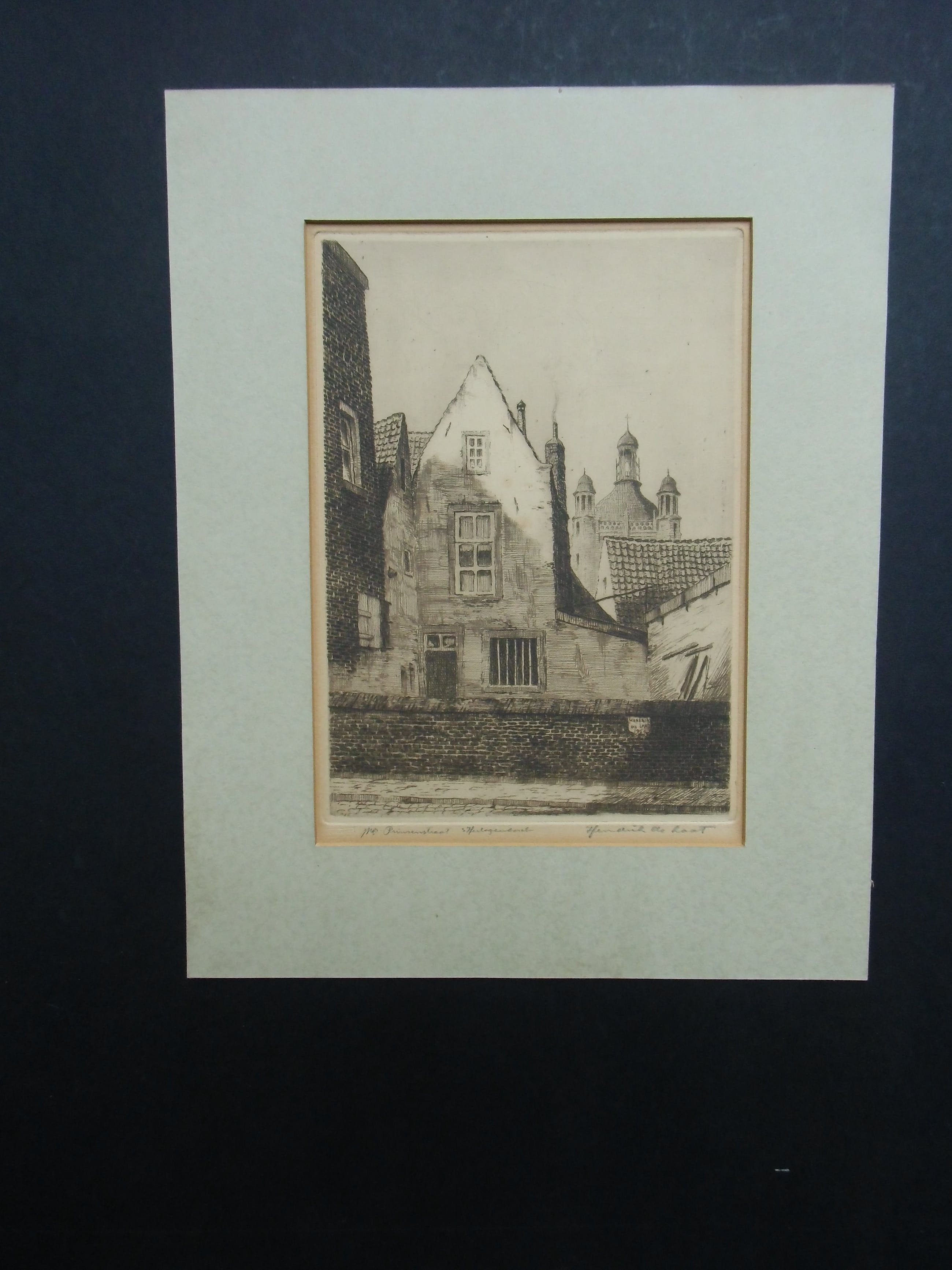 Karakteristieke ets van Hendrik de Laat uit 1950. Gesigneerd en betiteld in potlood. Voorts Hendrik de Laat 1950 in de plaat. Opgenomen in passepartout met achtervel. Oplage-vermelding. Zeer goede staat.