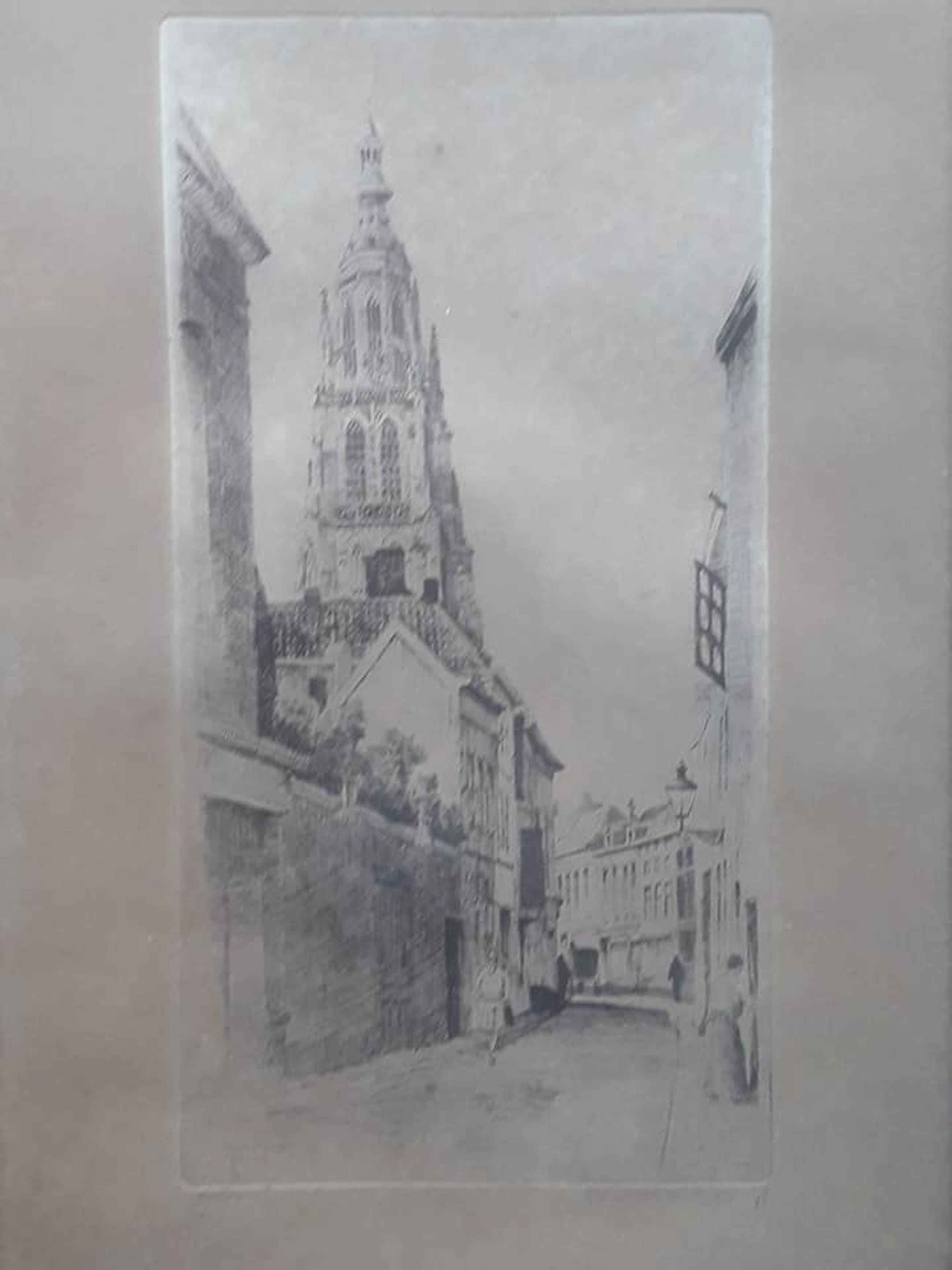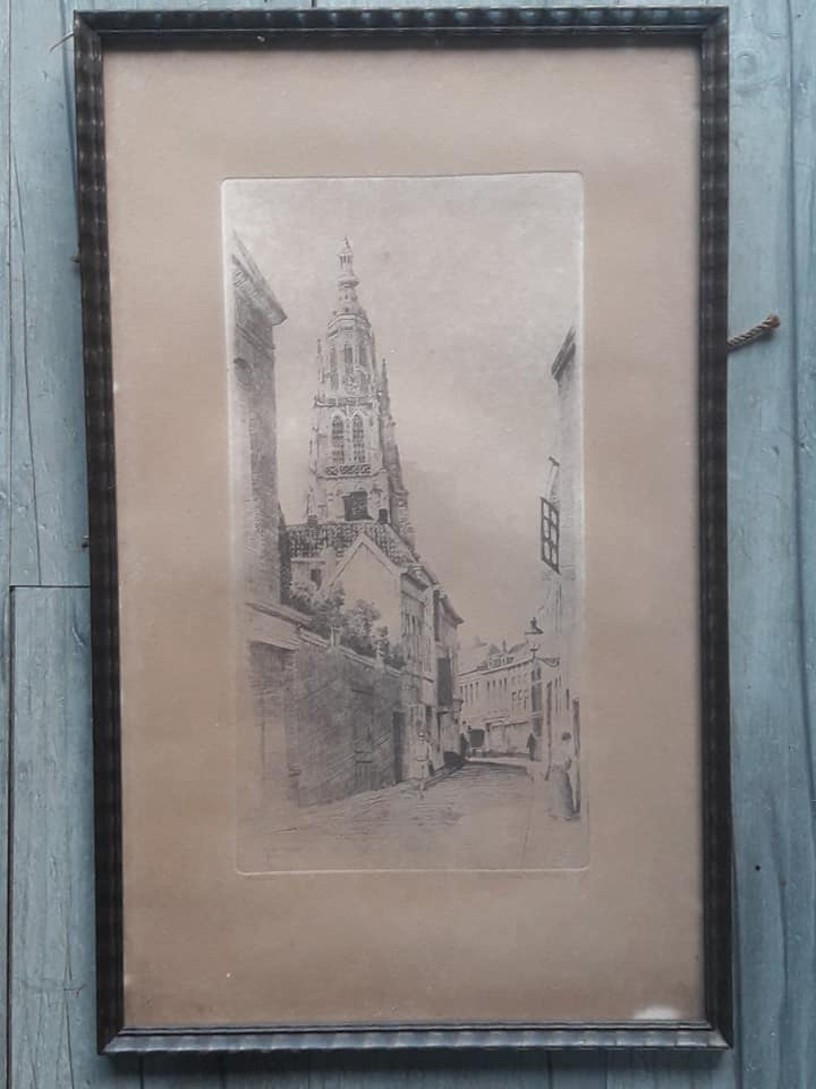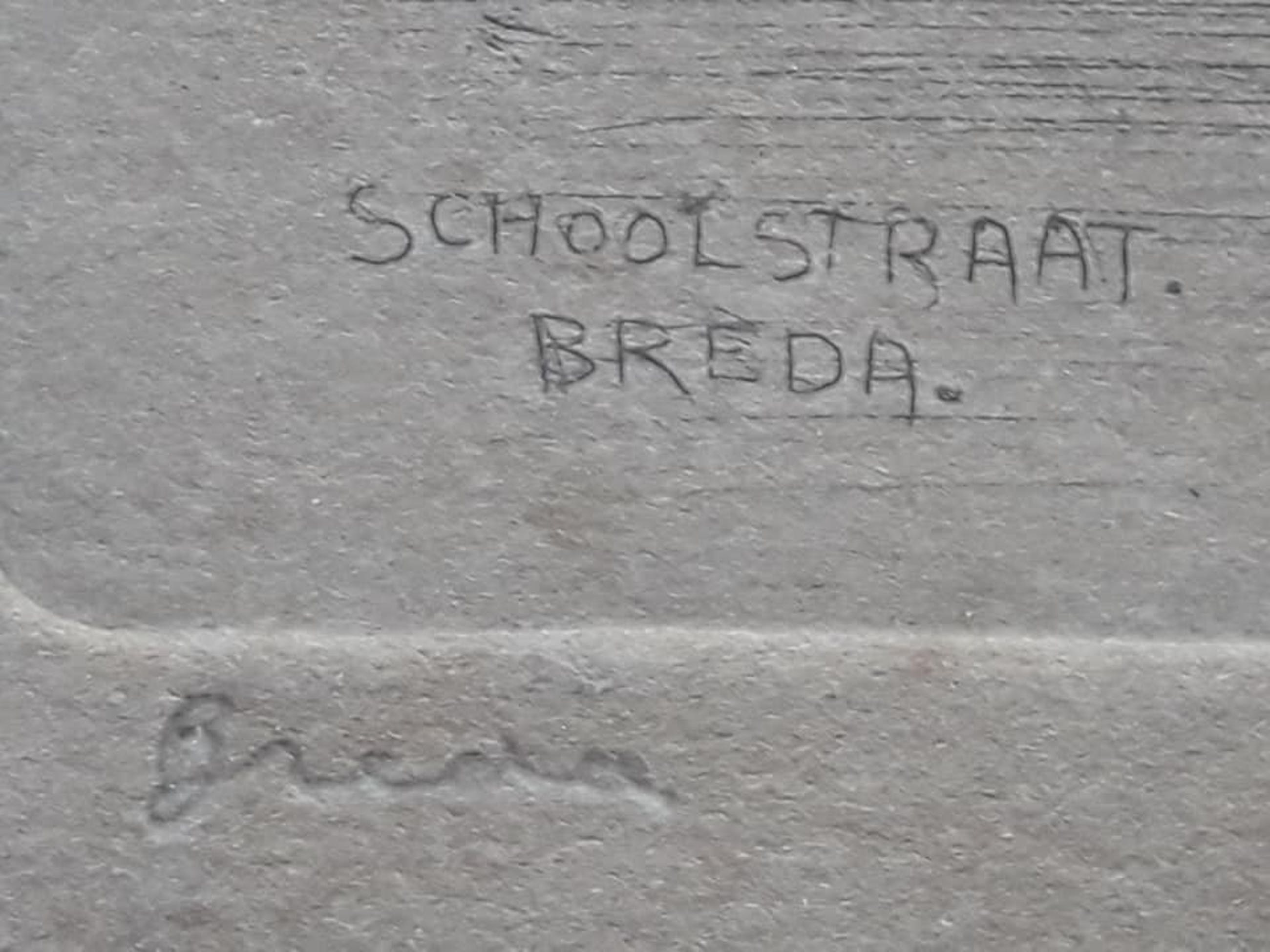 Oude ets van Hendrik de Laat. 1927 De schoolstraat in Breda. Zowel druk gesigneerd als met potlood. Zal worden verzonden in een op maat gemaakte kist om beschadiging te voorkomen, glasbreuk blijft risico koper. Kan ook worden opgehaald in Velsen-noord.