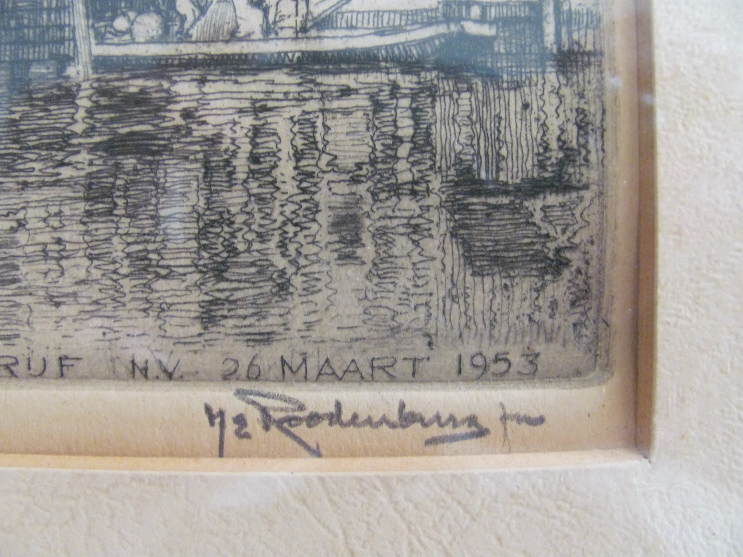 Rare gravure d'Amsterdam avec le Magere Brug (pont maigre) et les entrepôts. Gravure de HE Roodenburg à l'occasion du 50e anniversaire de H. Hoogewerff Junior & Co's Transport Company NV En bas à gauche au crayon : Amsterdam. Signé au crayon en bas à droite. En bas à gauche dans la plaque HER'53 Au bas de la plaque : 26 mars 1903 H. Hoogewerff Junior & Co's Transport Company NV 26 mars 1953