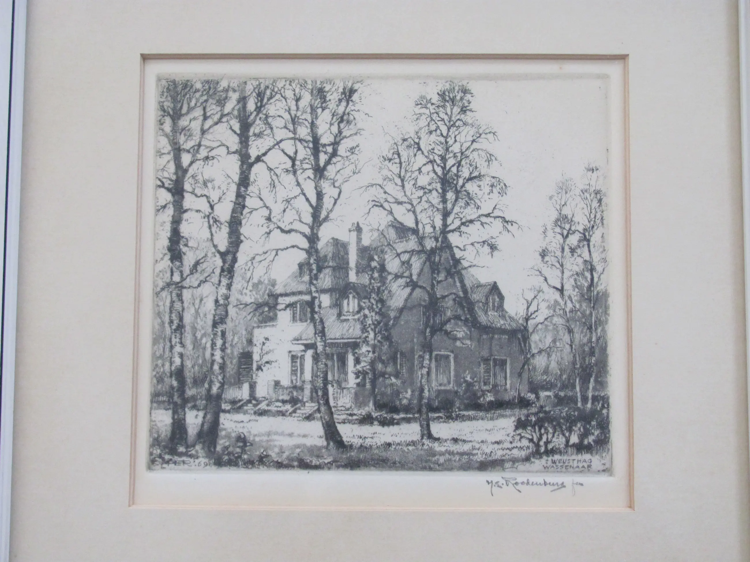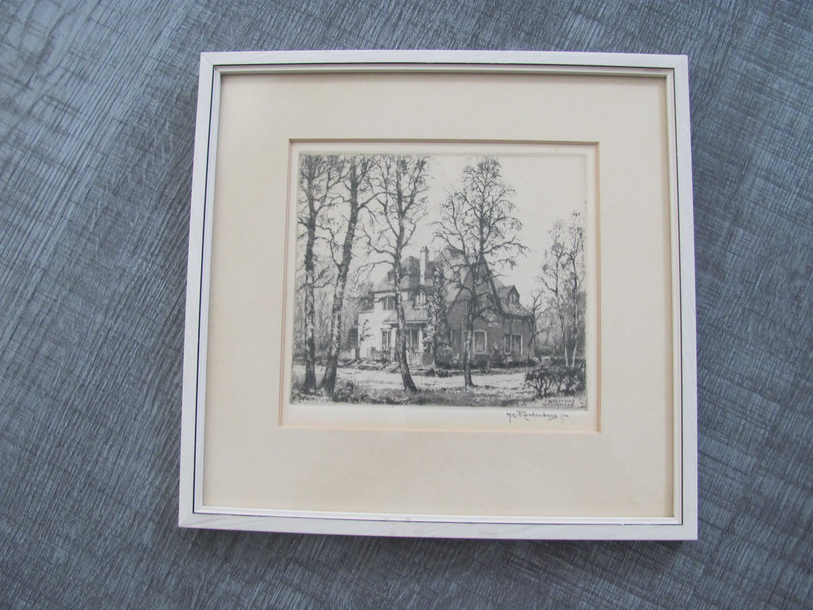Eau-forte de S.E. Roodenburg de 't Weusthag à Wassenaar. (C'est la maison où vivait Hendrikus Roodenburg sur Duinweg à Wassenaar.) Muni d'un monogramme (HER) en bas à gauche de la plaque et daté de 1969. En bas à droite de la plaque se trouve le texte « 't Weusthag Wassenaar ». Signé au crayon.