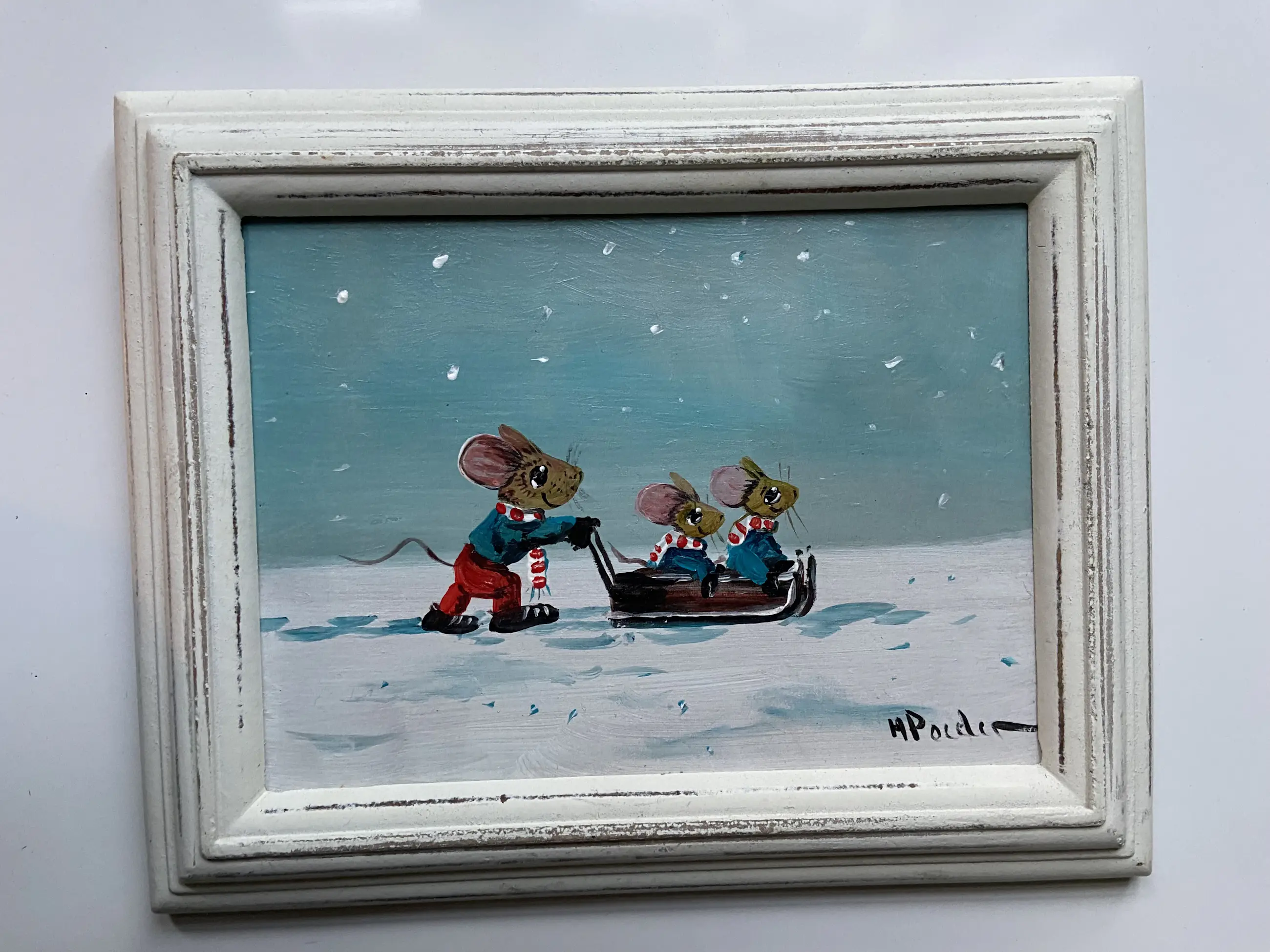Une très belle œuvre de Henk Poeder : Papa Souris pousse un traîneau avec ses enfants. Les enfants s'amusent comme des fous. Il fait un peu froid, mais c'est très amusant. Le tableau est encadré en bois et signé « H. Poeder » en dessous. Une très belle œuvre pour l'hiver qui arrive.