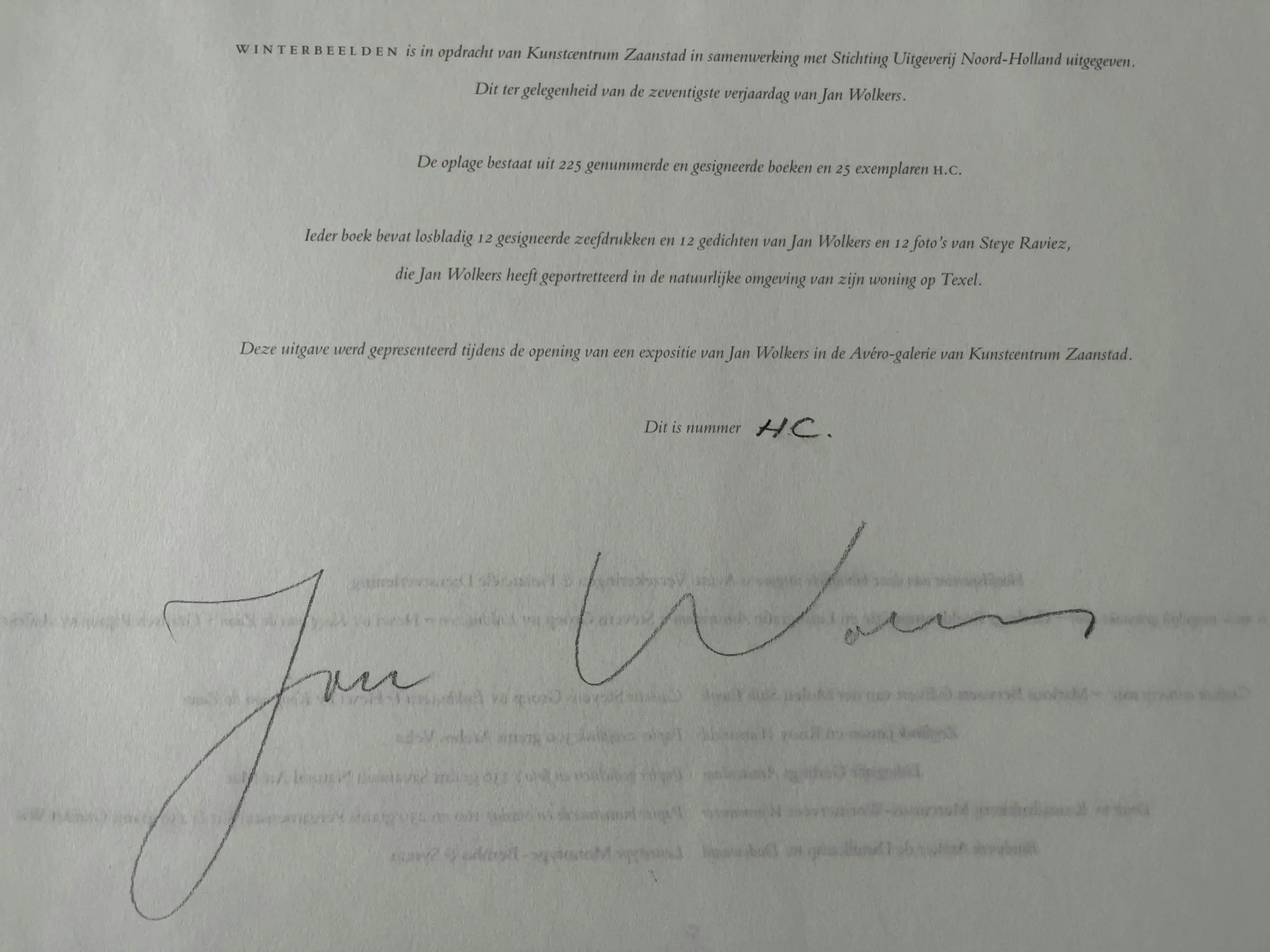 Jan Wolkers, Winter Beelden, cassette de luxe en édition numérotée de 225 exemplaires et 25 exemplaires HC, contenant 12 photographies offset de Steye Raviez, 12 sérigraphies signées de Jan Wolkers et 12 poèmes de Jan Wolkers, publiée par Kunstcentrum Zaanstad, Zaandam en collaboration avec Stichting uitgeverij Noord-Holland, Wormerveer, 1995, signée par Jan Wolkers.