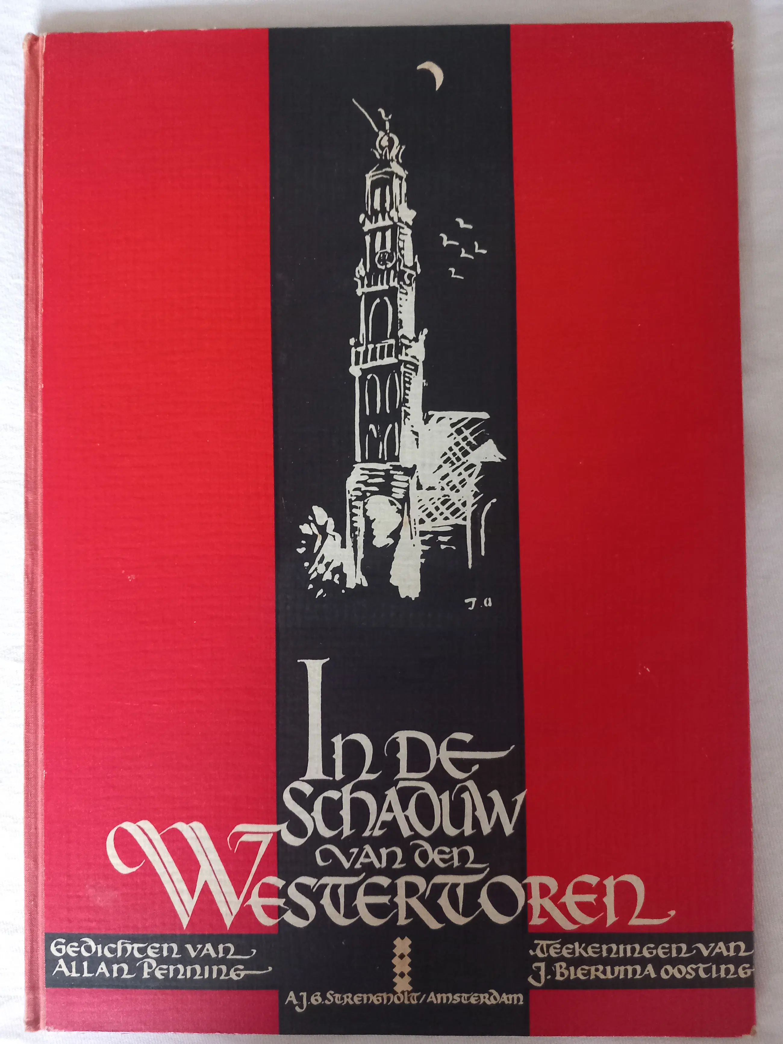 À l'ombre de la Westertoren. Une œuvre collaborative d'Allan Penning (poésie) et de Jeanne Bieruma Oosting (dessins) consacrée aux abords de la Westertoren, notamment aux abords du Quartier Rouge. Dessins accompagnés de vers. Édition limitée, numérotée et signée par les deux artistes. État : Décoloration du papier et taches sur plusieurs pages ; voir dernière photo. Vernis de couverture abîmé, notamment sur les bords et les coins. État général : assez bon. Signature sur la page de colophon par Allan Penning (poèmes) et Jeanne Bieruma Oosting (dessins). Numéroté 272 (sur 1 000).